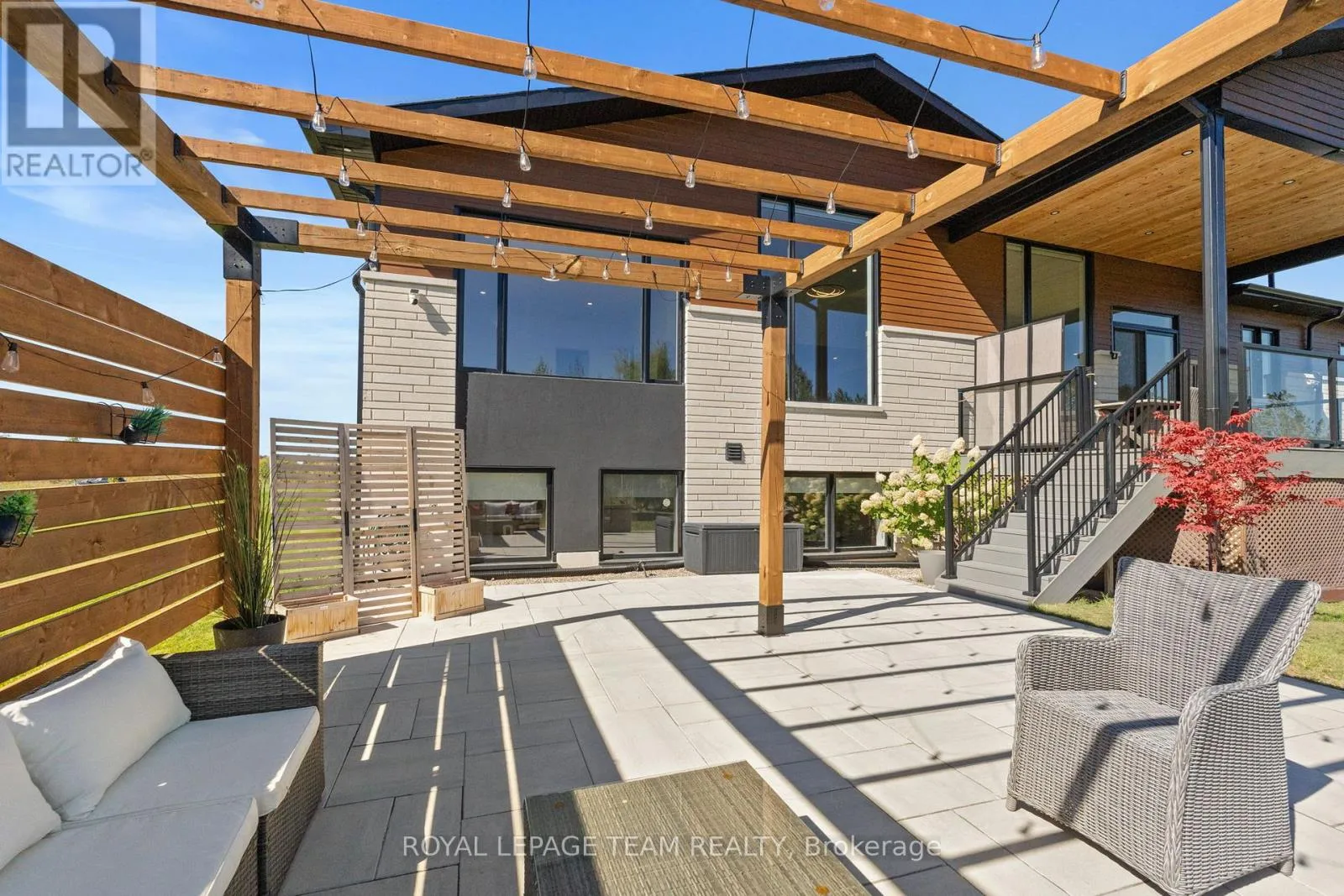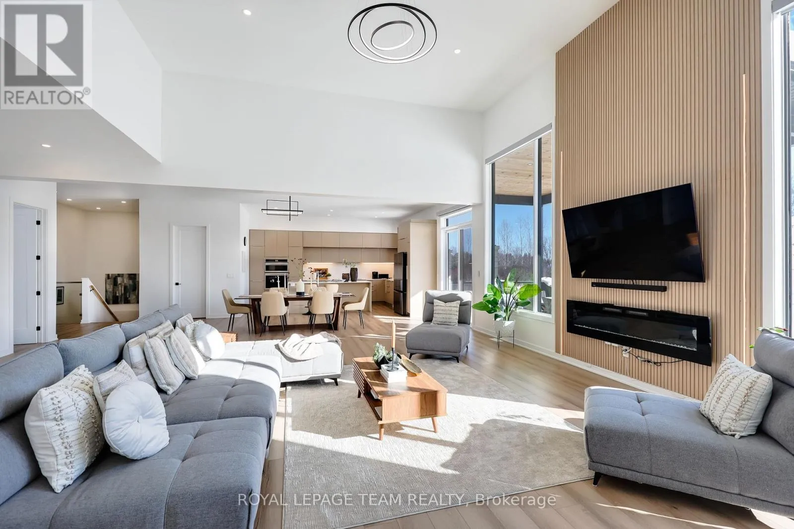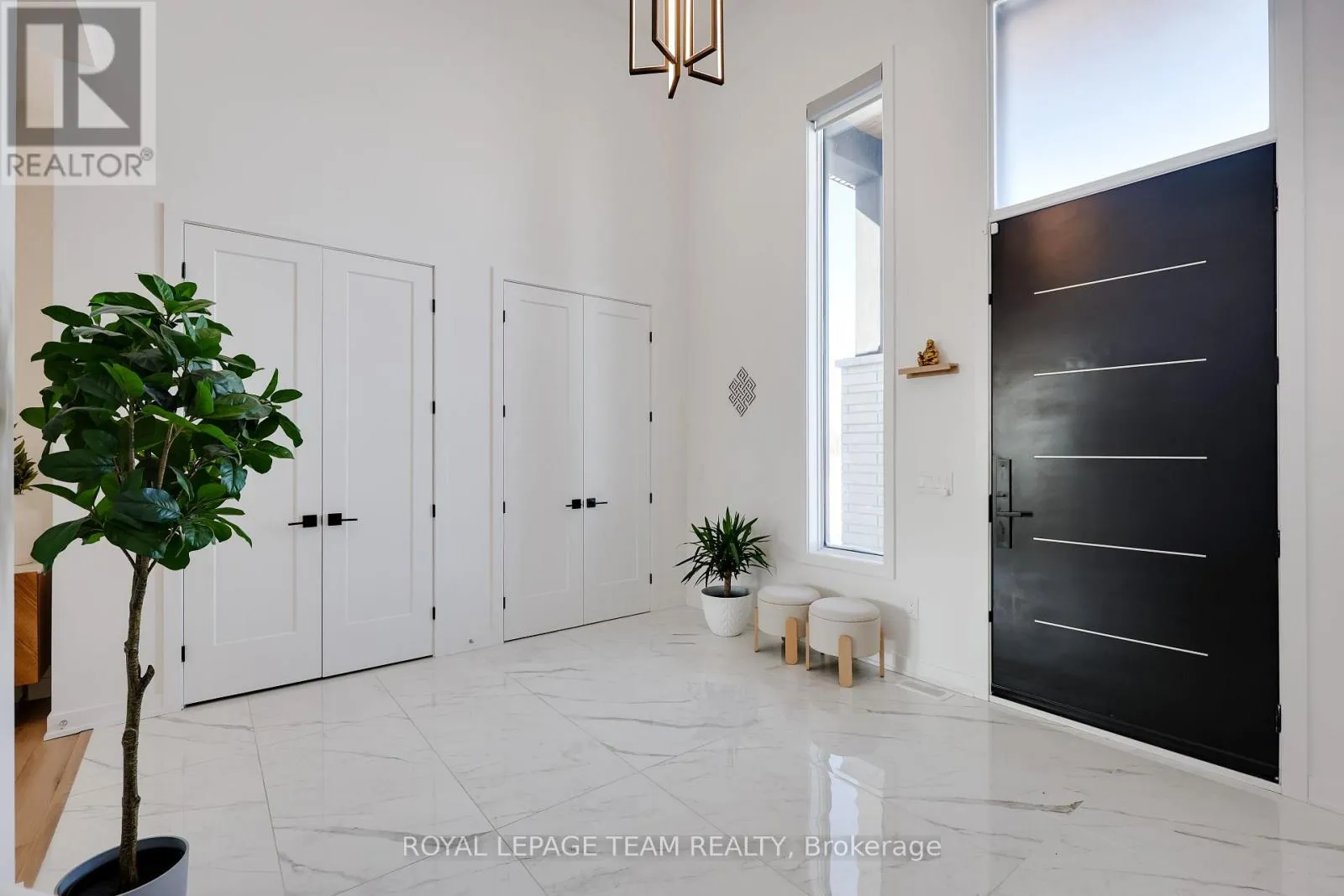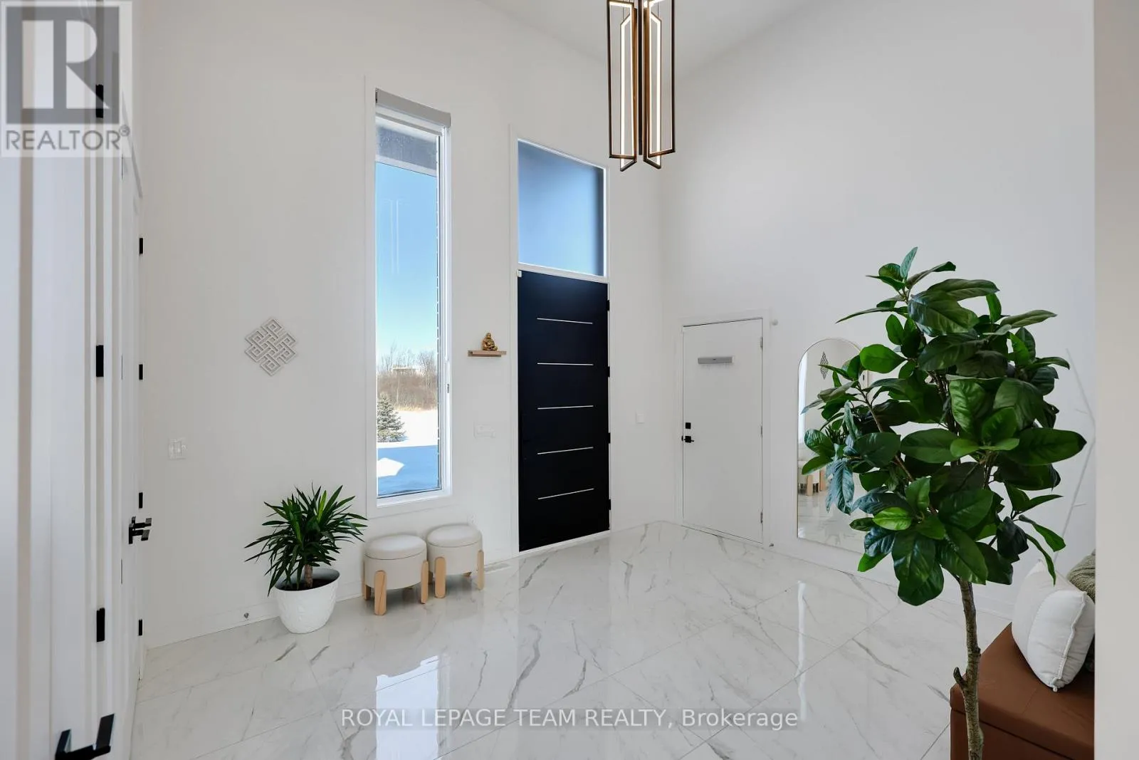 Cross Streets: Marchurst Rd and Synergy Way. ** Directions: Head Southwest on March Road, turn right onto Marchurst Rd, then turn left onto Synergy Way, turn left to stay on Synergy Way, the home will be on the left. This custom-built luxury bungalow offers over 5600 sq ft of total finished living space, set on a rare estate-sized lot of over 2 acres in an upscale, low-density community. Built in 2023, the home combines modern design with exceptional space and privacy, while remaining conveniently located near major amenities and Ottawa's high-tech employment hub. The thoughtfully designed layout includes 5 bedrooms and 4 bathrooms, with 3 bedrooms on the main level and 2 bedrooms in the lower level, ideal for multi-generational living, flexible family needs, or home office use. Ceiling heights reach up to 15 ft in the foyer and living room, with 10 ft ceilings across the main level, complemented by large black-framed double-pane windows that flood the home with natural light and enhance its architectural presence. The open-concept living area flows seamlessly into a modern kitchen featuring a waterfall quartz island, full-height quartz backsplash, custom soft-close cabinetry, and a premium appliance package. The primary suite offers a private retreat with a spa-inspired ensuite, including a freestanding soaking tub, glass-enclosed rain shower with body jets, and a custom walk-in closet. The lower level extends the living space with a spacious recreation area, electric fireplace (included), dedicated home gym, additional bedrooms, and a full bathroom finished to the same high standard as the main floor. Outdoors, the property features professionally landscaped grounds, interlock patios and walkways, a covered terrace, custom pergola, mature trees, multi-zone irrigation, and architectural exterior lighting. Additional highlights include a 4-car attached garage with epoxy flooring, extensive parking, smart home technology, comprehensive LED lighting, full security system, and electric fireplaces on both levels. This move-in-ready bungalow presents a rare opportunity to enjoy space, privacy, and modern luxury in one of the area's most desirable communities. (id:27476)