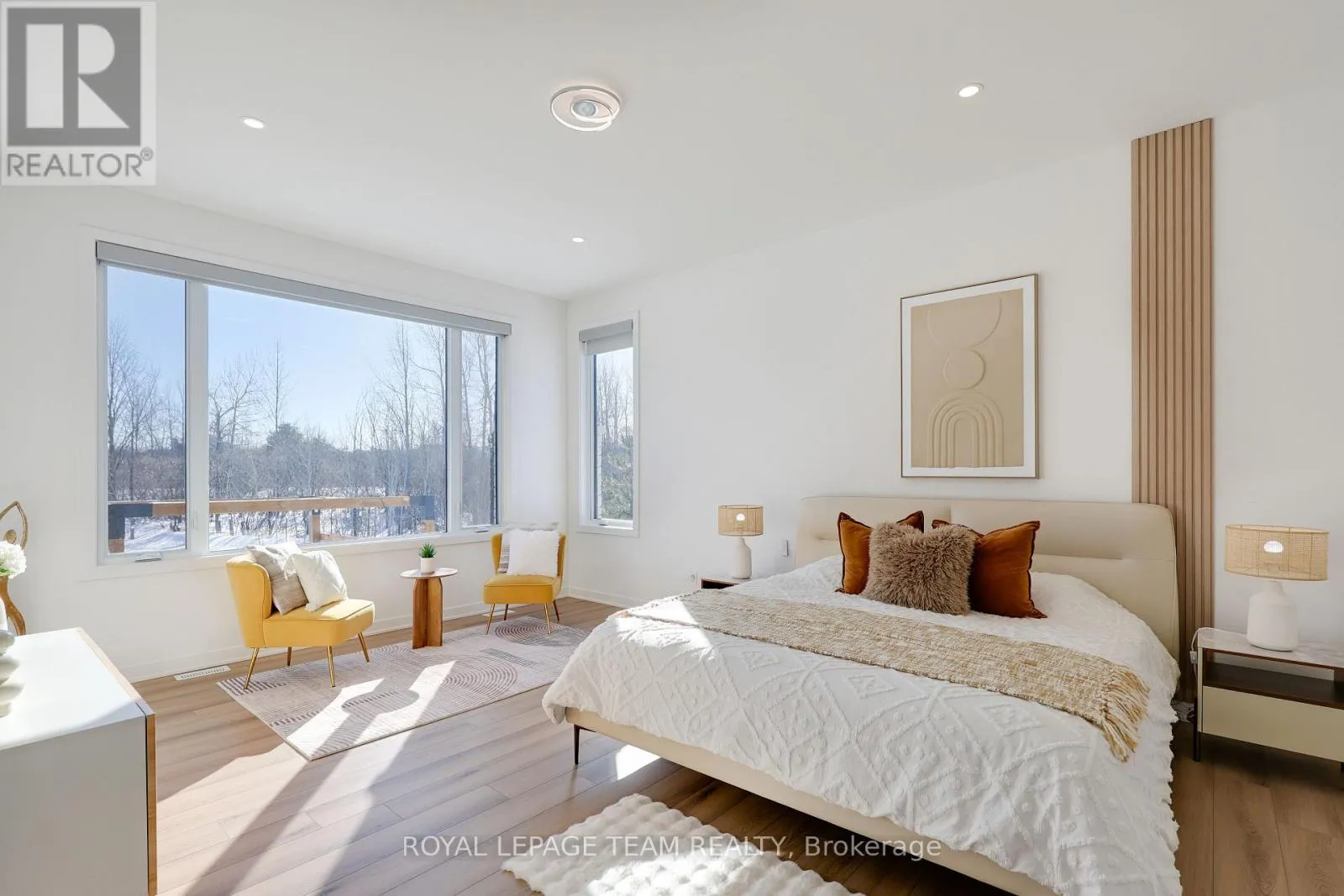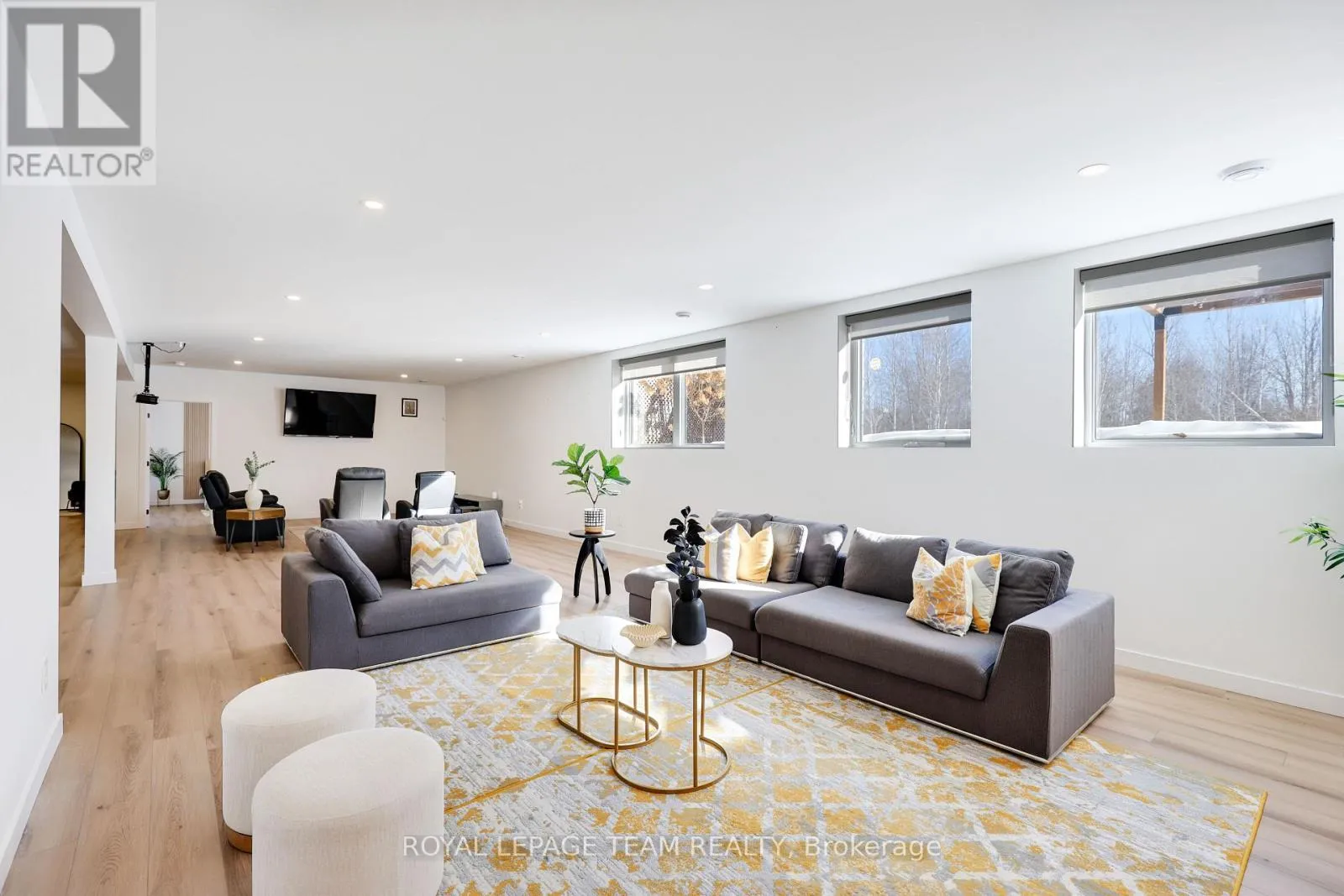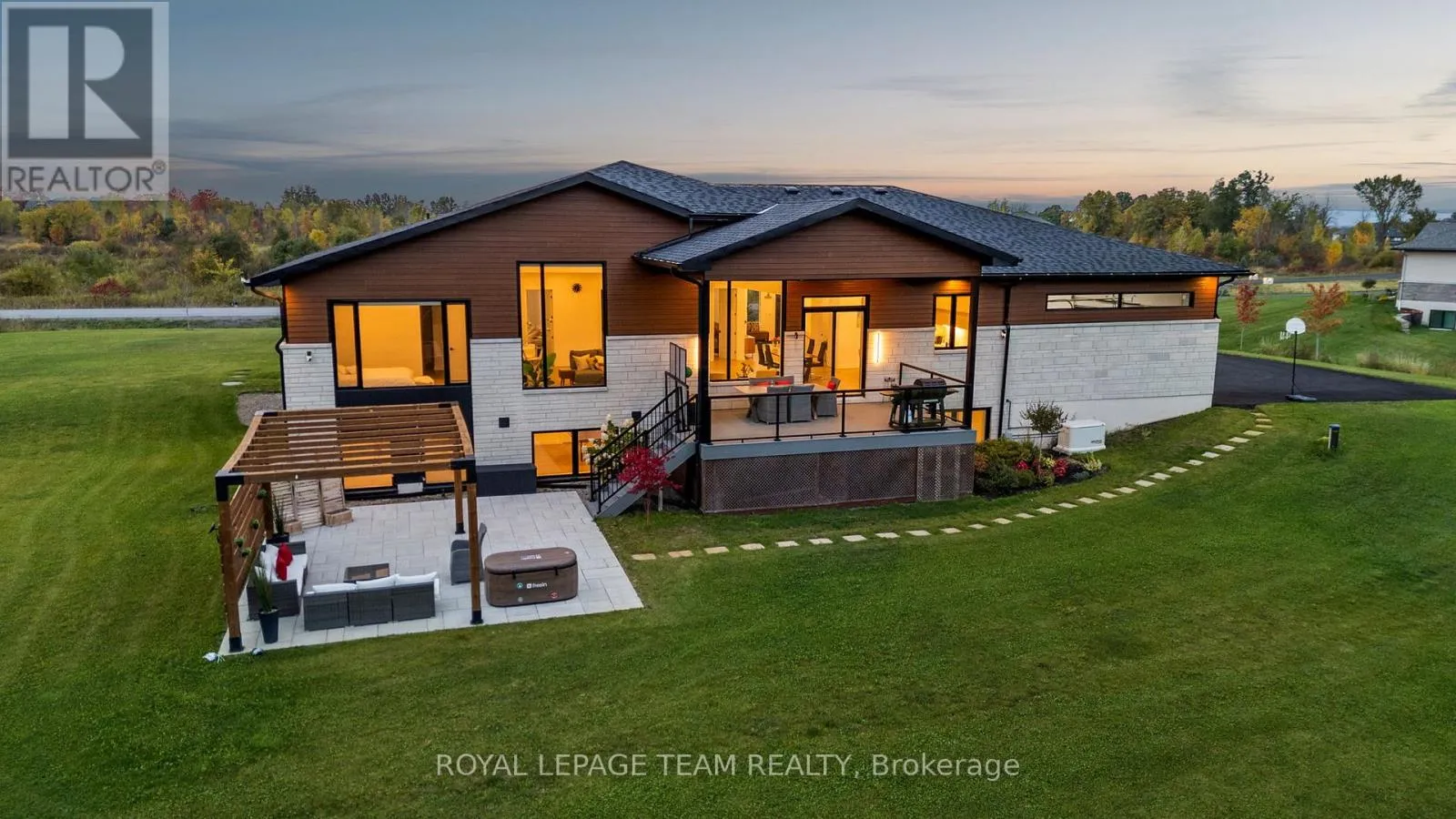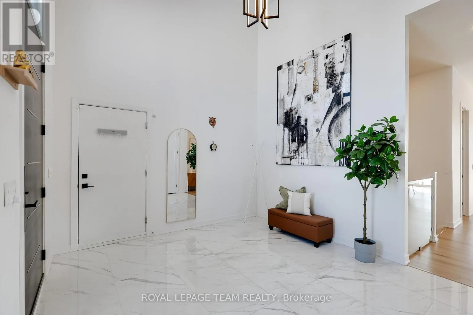 Cross Streets: Marchurst Rd and Synergy Way. ** Directions: Head Southwest on March Road, turn right onto Marchurst Rd, then turn left onto Synergy Way, turn left to stay on Synergy Way, the home will be on the left. This custom-built luxury bungalow offers over 5600 sq ft of total finished living space, set on a rare estate-sized lot of over 2 acres in an upscale, low-density community. Built in 2023, the home combines modern design with exceptional space and privacy, while remaining conveniently located near major amenities and Ottawa's high-tech employment hub. The thoughtfully designed layout includes 5 bedrooms and 4 bathrooms, with 3 bedrooms on the main level and 2 bedrooms in the lower level, ideal for multi-generational living, flexible family needs, or home office use. Ceiling heights reach up to 15 ft in the foyer and living room, with 10 ft ceilings across the main level, complemented by large black-framed double-pane windows that flood the home with natural light and enhance its architectural presence. The open-concept living area flows seamlessly into a modern kitchen featuring a waterfall quartz island, full-height quartz backsplash, custom soft-close cabinetry, and a premium appliance package. The primary suite offers a private retreat with a spa-inspired ensuite, including a freestanding soaking tub, glass-enclosed rain shower with body jets, and a custom walk-in closet. The lower level extends the living space with a spacious recreation area, electric fireplace (included), dedicated home gym, additional bedrooms, and a full bathroom finished to the same high standard as the main floor. Outdoors, the property features professionally landscaped grounds, interlock patios and walkways, a covered terrace, custom pergola, mature trees, multi-zone irrigation, and architectural exterior lighting. Additional highlights include a 4-car attached garage with epoxy flooring, extensive parking, smart home technology, comprehensive LED lighting, full security system, and electric fireplaces on both levels. This move-in-ready bungalow presents a rare opportunity to enjoy space, privacy, and modern luxury in one of the area's most desirable communities. (id:27476)