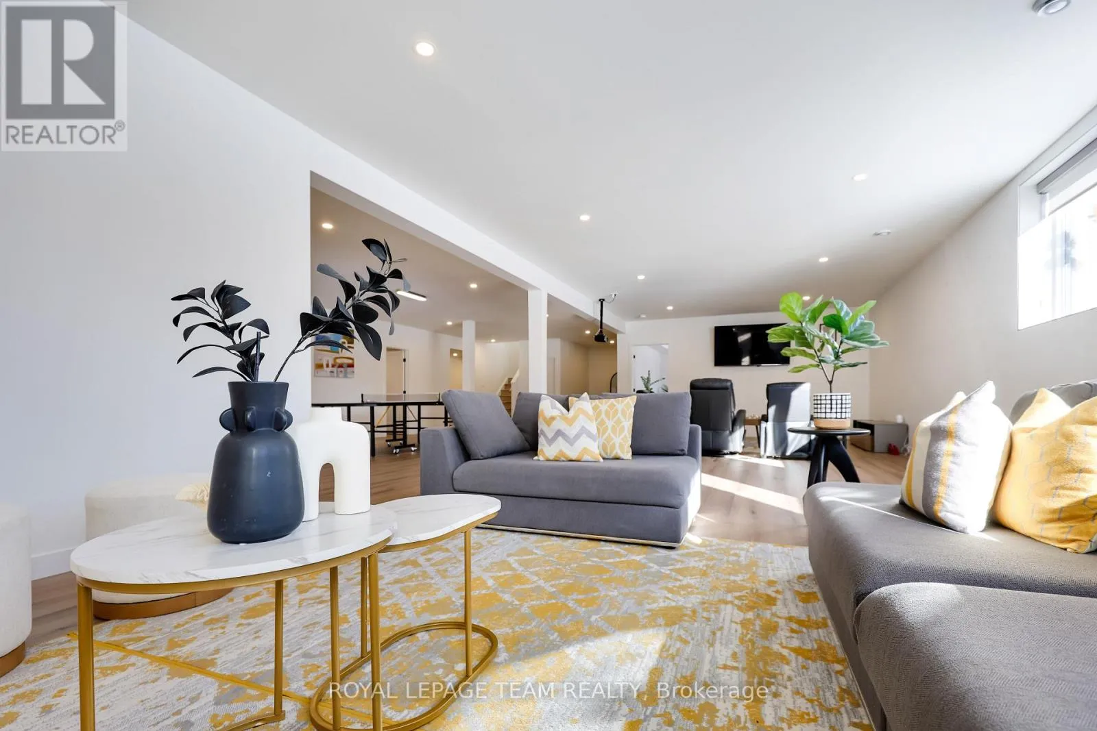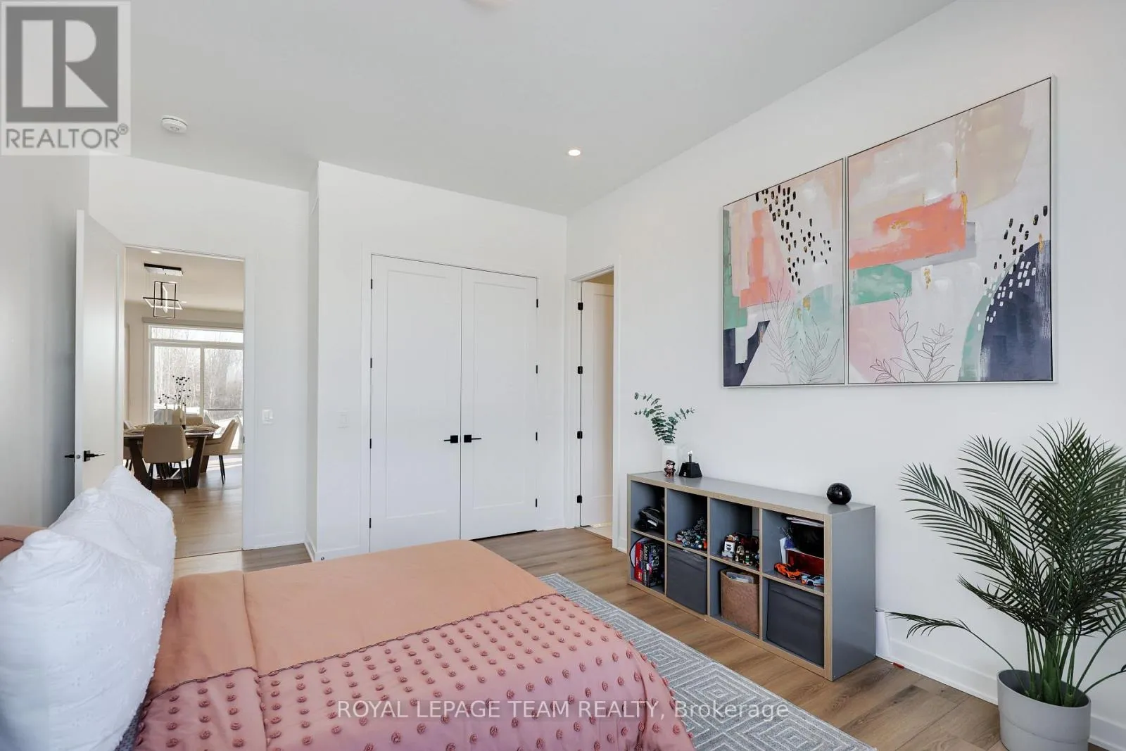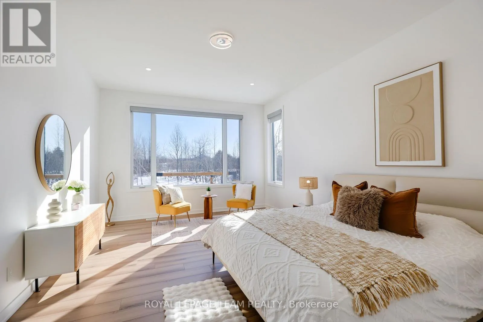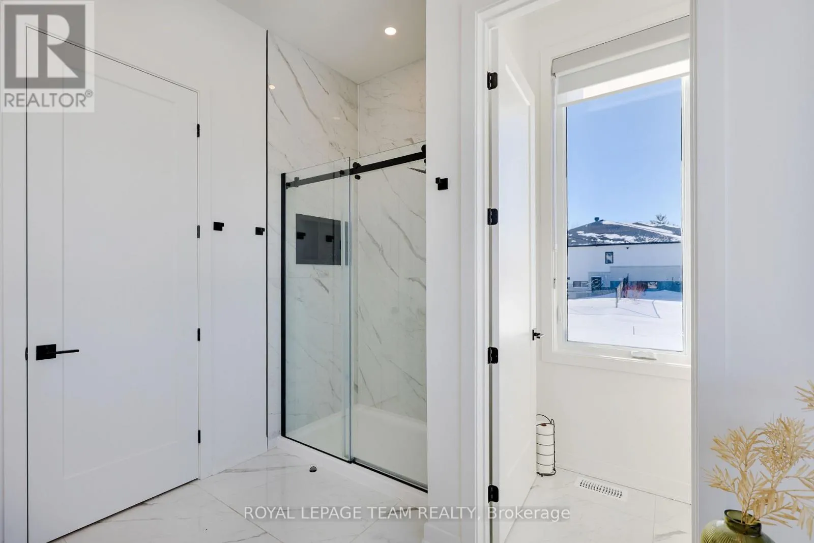 Cross Streets: Marchurst Rd and Synergy Way. ** Directions: Head Southwest on March Road, turn right onto Marchurst Rd, then turn left onto Synergy Way, turn left to stay on Synergy Way, the home will be on the left. This custom-built luxury bungalow offers over 5600 sq ft of total finished living space, set on a rare estate-sized lot of over 2 acres in an upscale, low-density community. Built in 2023, the home combines modern design with exceptional space and privacy, while remaining conveniently located near major amenities and Ottawa's high-tech employment hub. The thoughtfully designed layout includes 5 bedrooms and 4 bathrooms, with 3 bedrooms on the main level and 2 bedrooms in the lower level, ideal for multi-generational living, flexible family needs, or home office use. Ceiling heights reach up to 15 ft in the foyer and living room, with 10 ft ceilings across the main level, complemented by large black-framed double-pane windows that flood the home with natural light and enhance its architectural presence. The open-concept living area flows seamlessly into a modern kitchen featuring a waterfall quartz island, full-height quartz backsplash, custom soft-close cabinetry, and a premium appliance package. The primary suite offers a private retreat with a spa-inspired ensuite, including a freestanding soaking tub, glass-enclosed rain shower with body jets, and a custom walk-in closet. The lower level extends the living space with a spacious recreation area, electric fireplace (included), dedicated home gym, additional bedrooms, and a full bathroom finished to the same high standard as the main floor. Outdoors, the property features professionally landscaped grounds, interlock patios and walkways, a covered terrace, custom pergola, mature trees, multi-zone irrigation, and architectural exterior lighting. Additional highlights include a 4-car attached garage with epoxy flooring, extensive parking, smart home technology, comprehensive LED lighting, full security system, and electric fireplaces on both levels. This move-in-ready bungalow presents a rare opportunity to enjoy space, privacy, and modern luxury in one of the area's most desirable communities. (id:27476)