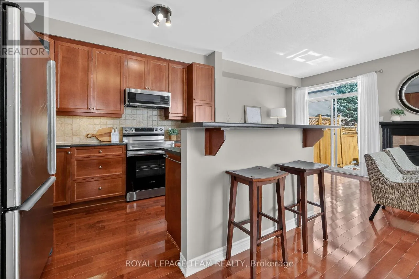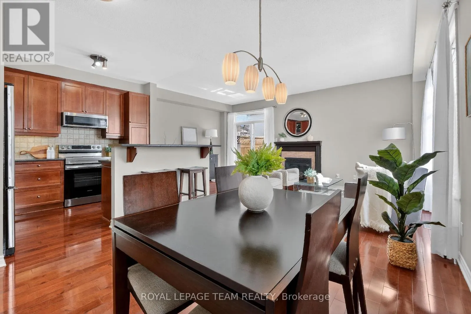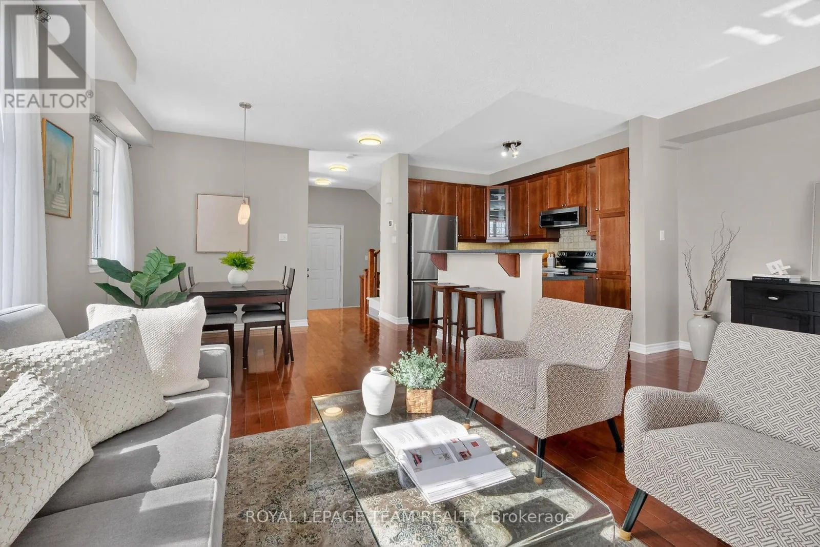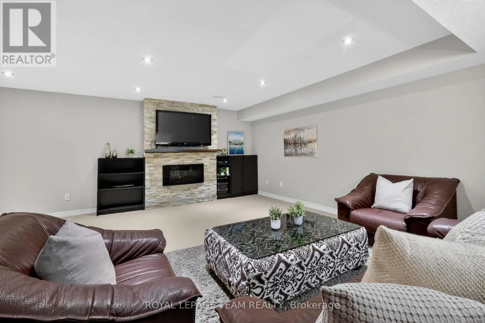Cross Streets: Leitrim and Kelly Farm. ** Directions: Leitrim Rd to Kelly Farm, left onto Shepody Circle. Welcome to this beautifully maintained and thoughtfully designed townhome, offering an ideal blend of comfort, style, and functionality. End unit townhome featuring a double car garage, this home provides both convenience and exceptional living space for modern families. Step inside to a bright and inviting main floor, highlighted by 9-foot ceilings and rich hardwood flooring throughout. The elegant living room is centered around a natural gas fireplace, creating a warm and welcoming atmosphere perfect for both everyday living and entertaining. The adjoining dining area flows seamlessly into the stunning kitchen with shaker-style cabinetry in a striking wood tone extending to the ceiling, and separate island. Patio doors lead to a fully fenced backyard oasis, surrounded by mature trees for added privacy. Enjoy outdoor living with an interlock patio and interlock walkway. Upstairs, offers a versatile loft space, perfect for a home office, reading nook, or additional family area. The spacious primary bedroom retreat features a walk-in closet and a well appointed 4 piece ensuite bathroom with soaker tub and walk in shower. Two additional generously sized bedrooms and the convenience of second-level laundry and family bathroom complete this level. The fully finished lower level expands your living space with a cozy family room featuring a floor-to-ceiling stone electric fireplace, creating a perfect setting for movie nights or quiet evenings at home. This level also includes a utility room with ample storage, ensuring everything has its place. This home is truly move-in ready and meticulously maintained, with a new roof installed in 2025 for added peace of mind. Close to amenities and walking distance to schools. Note: Driveway fits 4 vehicles plus 2 garage spaces. 3875 sqft Irregular lot (id:27476)