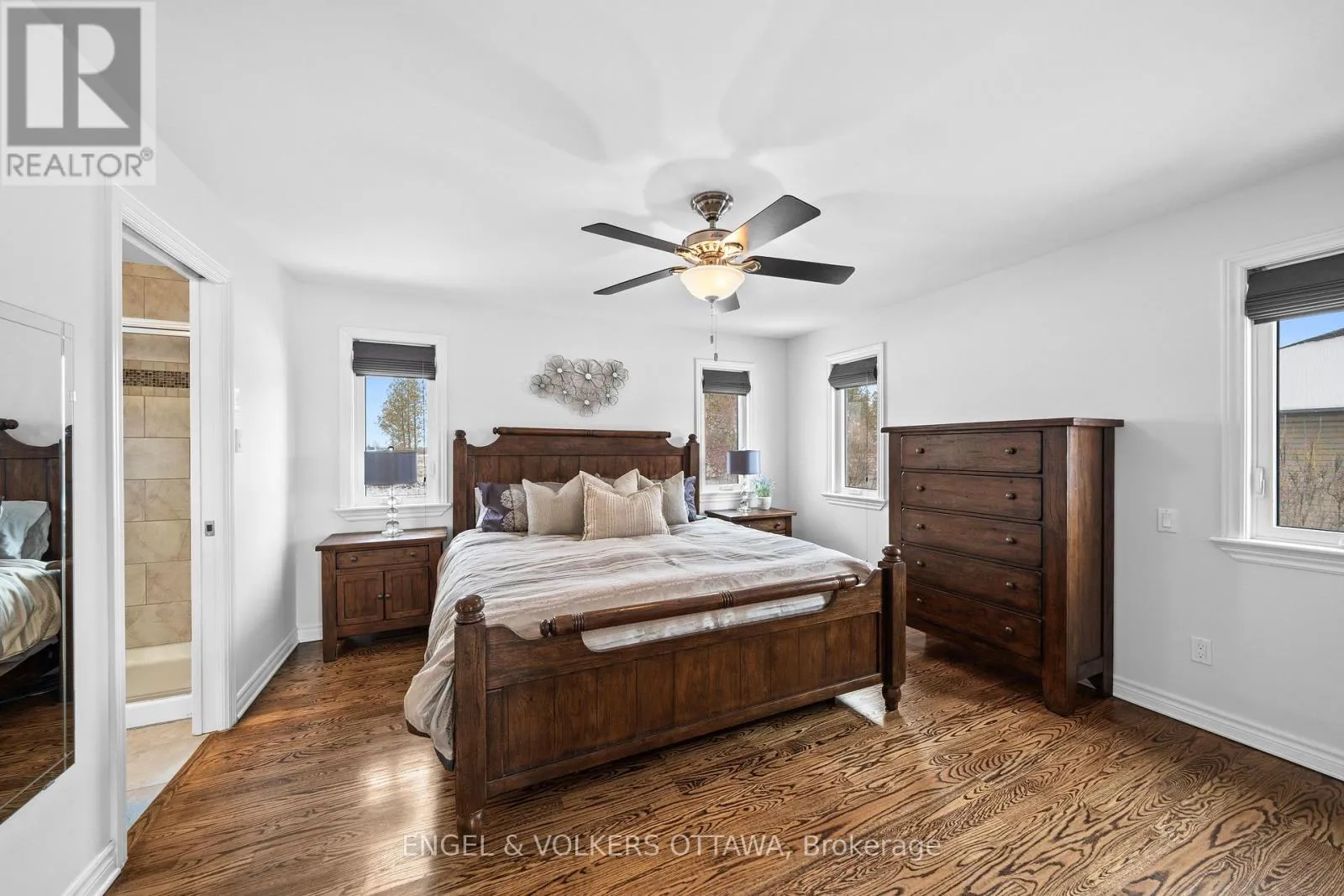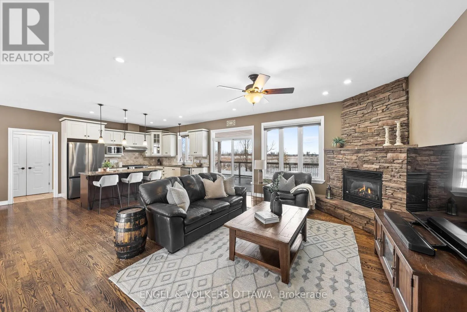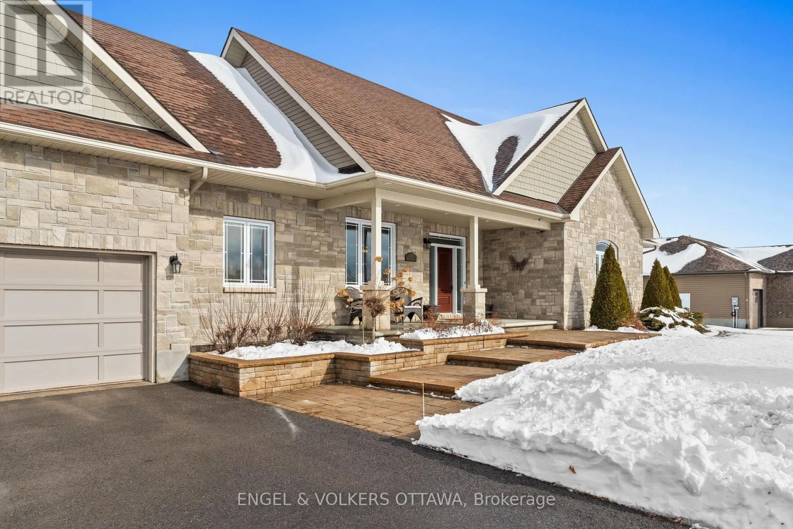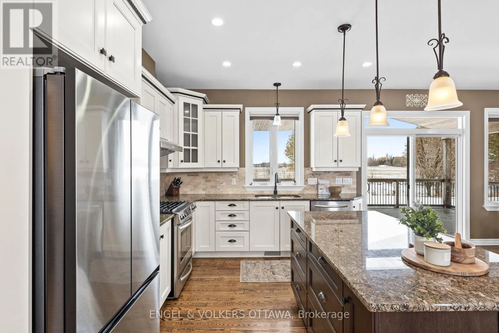 Cross Streets: Osgoode Main & Logan Farm Drive. ** Directions: 416 south, exit Roger Stevens East, South on Nixon, East on Osgoode Main, North on Logan Farm Dr, West on Lombardy. Welcome to this exceptional custom Ian Drew home, perfectly positioned on an exclusive cul-de-sac with no rear neighbours, offering privacy and refined living. Impeccably maintained, the property features elegant front landscaping with a stone walkway, raised garden beds, and an oversized paved driveway with additional side parking. Designed for elevated outdoor living, the impressive 30' x 16' covered rear deck showcases a vaulted cedar ceiling and low-maintenance composite decking, an ideal space for entertaining or relaxing in total privacy. The backyard also includes a premium storage/work shed and a RainBird 9-zone irrigation system. Inside, 9-foot ceilings enhance the open-concept living, dining, and kitchen areas, complemented by hardwood floors, granite countertops, and a cozy gas fireplace anchoring the space. The primary suite offers a spacious walk-in closet and a luxurious ensuite with a walk-in shower and soaker tub. Two additional bedrooms, one featuring a vaulted ceiling, are serviced by a full bath, while the main level is completed by a laundry/mudroom and powder room. A versatile loft provides the perfect space for a media room, home office, or additional lounge area. The lower level provides a wide-open canvas, whether for recreation, fitness, or future finishing. The oversized 3-car garage is insulated and drywalled, featuring a full rear garage door for backyard access and hot/cold water taps. Extensive mechanical upgrades include a Kinetico water system, updated hot water tank and pressure tank, and a fully serviced system with recent water testing available. A GenerLink 240V connection offers whole-home generator capability. A rare offering combining quality craftsmanship, thoughtful design, and upscale features, tailored for the most discerning buyer. Walking distance to Foodland, No Go Coffee, Red Dot Cafe and the Osgoode Link Pathway, a trail over 20 km long, connecting Osgoode to Leitrim Road and the new LRT station. (id:27476)