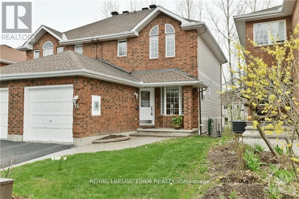417W TO CASTLEFRANK/KANATA AVE EXIT. RIGHT ON KANATA AVE. PAST CAMPEAU, LEFT ON HIGHMONT COURT Welcome to 27 Highmont Court, a beautifully maintained semi-detached home in the highly sought-after Kanata Heritage community. The sun-filled main floor showcases like-new hardwood flooring throughout the living areas, enhanced by large windows that create a bright and inviting space. The updated kitchen features modern cabinetry, stainless steel appliances, and granite countertops-perfectly combining style and functionality. A recently renovated powder room adds a touch of elegance to the main level. Upstairs, a hardwood staircase with wrought iron spindles leads to a spacious primary bedroom complete with his-and-hers closets and a tastefully updated ensuite featuring quartz countertops. The main bathroom has also been fully updated with quality finishes, including quartz counters and ceramic details. The partially above-grade lower level is a true highlight- an award-winning renovation offering large windows, a full bathroom, and a comfortable living area anchored by a cozy gas fireplace. Step outside to a generous deck overlooking a tranquil park setting, with direct access to walking paths-perfect for relaxing or entertaining. Notable Updates Include:2021: Kitchen Faucet and Electrical Switches. 2023: Automatic Garage Door Opener with wifi Camera, Air Conditioning Unit, HRV System, All windows upgraded to triple-panel (including double-panel glass patio door), Window Blinds, Google Nest Thermostat, Deck Staining. 2024: Bathroom Ventilation Fans, Owned Hot Water Tank, Washer, Dryer, Refrigerator. 2025: Microwave. 2016: Kitchen Granite Countertop, 2019: Kitchen Cabinets Professionally Redone and Replaced with high end All Light Fixtures in most location. Offering exceptional care, quality upgrades, and an unbeatable location, this home is truly move-in ready. Note: Some furniture shown in the photos has been virtually staged. (id:27476)