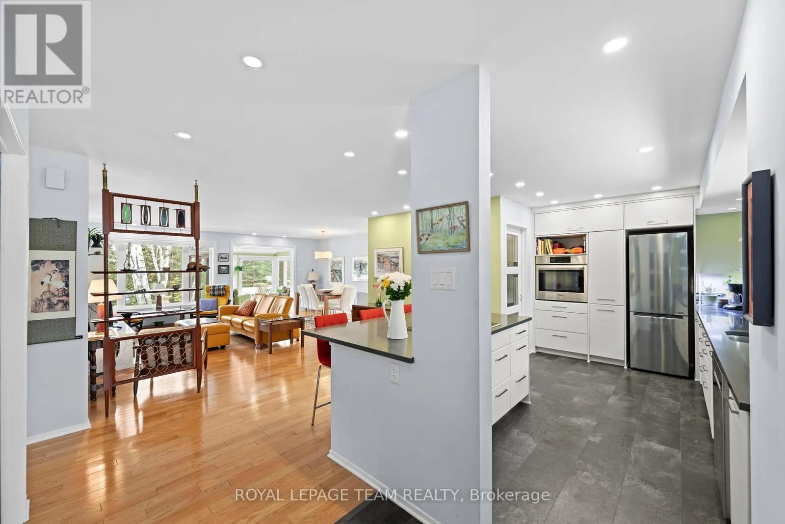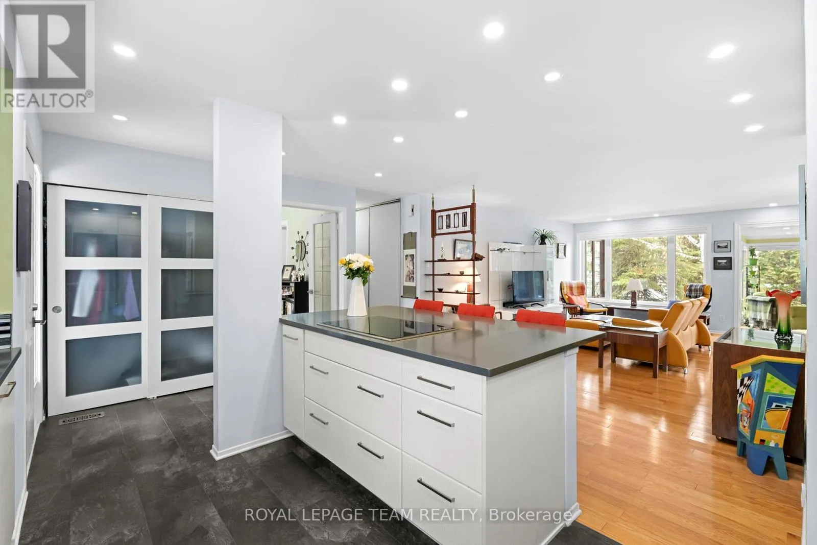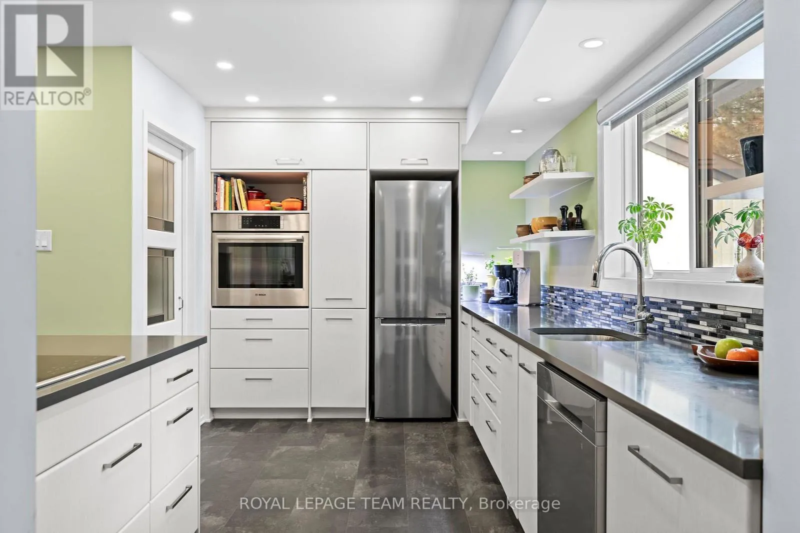Cross Streets: Kittansett Court & Old Orchard Crescent. ** Directions: Hazeldean to Springbrook to Old Orchard Crescent to Kittansett Court. Nestled amongst the pines of Amberwood Village - executive, *end-unit* bungalow condominium uniquely renovated to an impressive standard. Beautifully finished & meticulously maintained, ideally located on a prestigious court in the quiet community in Stittsville. Enjoy excellent walkability to parks, essential shopping, restaurants & local amenities. This charming, carpet-free home features a welcoming foyer with access to true open concept living. The elegant remodeled kitchen offers ample white cabinetry, tile flooring, newer stainless steel appliances, & a generous island with quartz counters-perfect for meal prep & entertaining. A separate walk-in pantry incorporates kitchen storage & the convenient main floor laundry, & features a stylish stained glass door. The open-concept living & dining area showcases gleaming hardwood flooring, & a spectacular, integral sunroom with a door leading to the peaceful rear yard creating a cozy atmosphere. The sunroom will delight - bathed in natural light, the perfect spot for morning coffee! The spacious primary bedroom retreat overlooks the backyard with dual aspect windows. Oversized walk-in closet & full ensuite. The bright & airy bathroom boasts an upgraded large walk-in shower & ceramic tile flooring, quartz topped vanity & solar tunnel for natural light. All fully renovated! A full family bathroom, renovated to the same standard complete with natural light, solar tunnel skylight. Charming additional bedroom or den with double french doors to the foyer & elegant window seat completes this floor.The fully finished lower level includes a family room, sitting area & library section. A third fully renovated bathroom with a large walk-in shower. Storage has not been forgotten, with ample space allocated! The rear yard will not disappoint - secluded, private & peaceful with a patio area, surrounded by greenery. Two single-car detached garages crown this exceptional property. (id:27476)