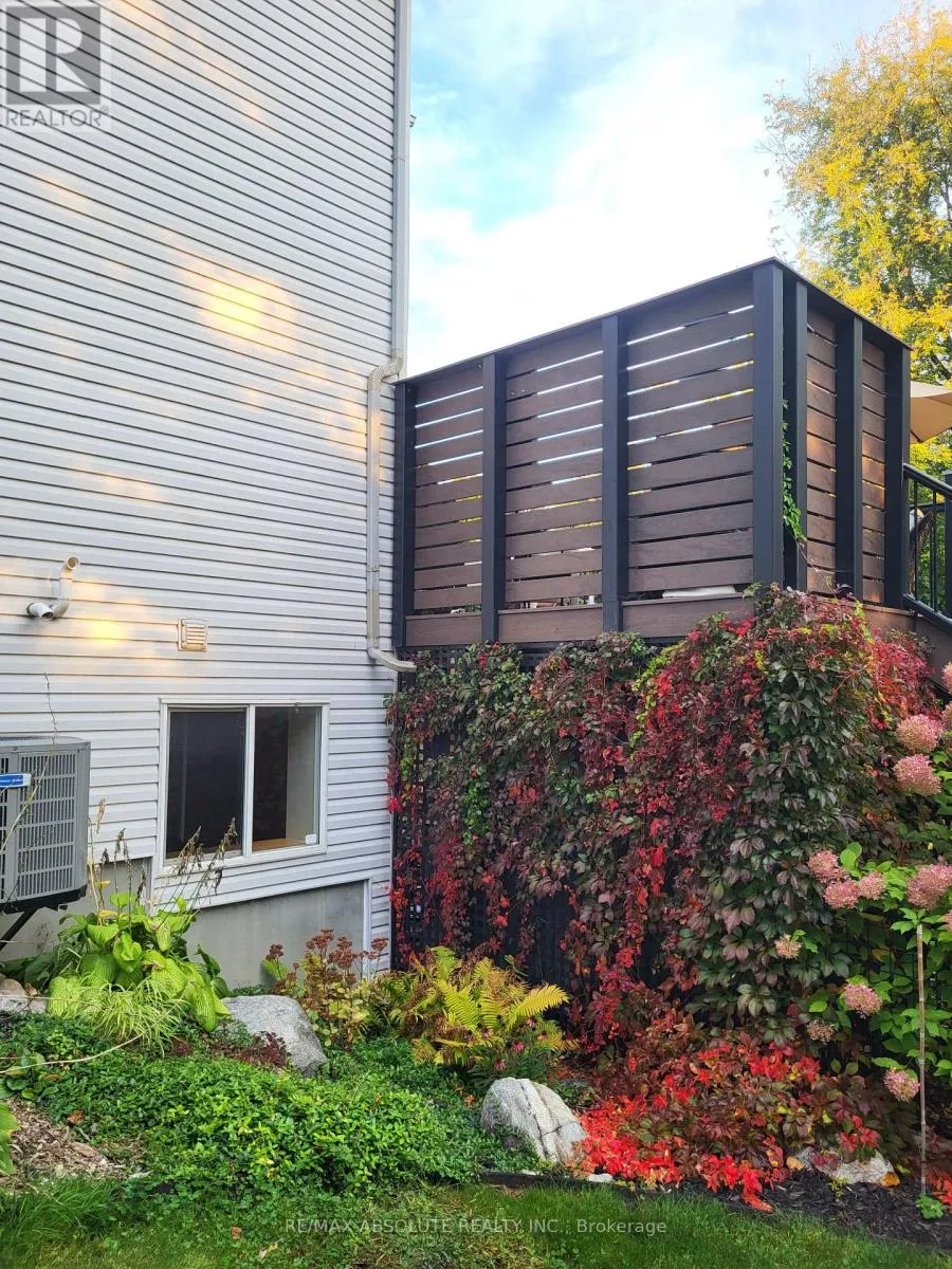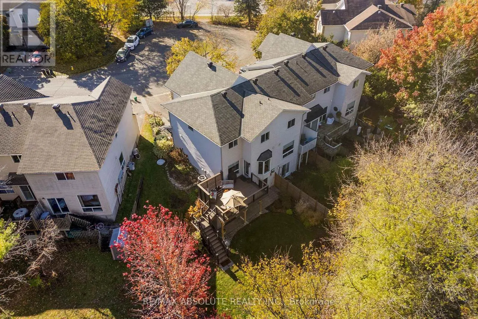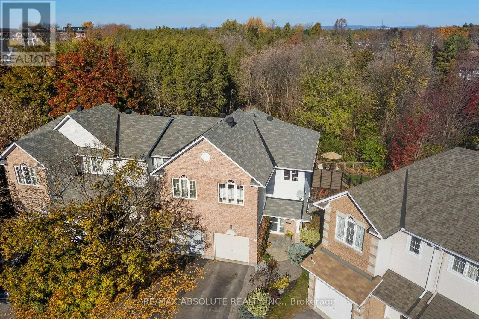 Cross Streets: Wintergreen Drive. ** Directions: Stittsville Main Street, turn onto Wintergreen Drive, left on Riverbank Court. Welcome to 23 Riverbank Court-an exceptional Holitzner end-unit townhome set on a premium, fully fenced lot backing onto Poole Creek. This rare offering combines privacy, natural beauty, and extensive updates, all within walking distance to local amenities. Enjoy the outdoors from the spacious second-storey composite deck-an ideal setting to relax and take in the sights and sounds of nature. The beautifully landscaped yard provides a safe and secure space for children and pets to play. Inside, there are tasteful renovations throughout. The main and second levels feature bleached oak flooring, complemented by a hardwood staircase. The main floor boasts a stylish eat-in kitchen with quartz countertops, set against natural slate flooring. A full-length bay window in the breakfast nook frames peaceful, treed views. The dining area offers built-in banquette seating with convenient storage, maximizing both function and style. A welcoming living room and a updated powder room complete the main level. Upstairs, the sun-filled second floor features a primary retreat with a cathedral ceiling, walk-in closet, and a beautifully renovated ensuite. The spa-inspired bathroom includes a large low-threshold shower with rain shower head, ambient lighting, and custom built-ins. Two additional bedrooms offer tranquil views, including one with a Murphy bed. A versatile office or fourth bedroom adds flexibility for modern living. These rooms share a fully renovated main bathroom featuring a deep soaker tub with shower. The bright, walk-out lower level extends the living space with a cozy natural gas fireplace, a laundry/utility area, and storage room. Sliding doors lead to a covered patio, complete with an oversized storage shed. Located in a quiet, sought after cul-de-sac, this home is part of a friendly, established community. It truly offers the best of both worlds: everyday convenience and a private natural oasis in the heart of Stittsville. (id:27476)