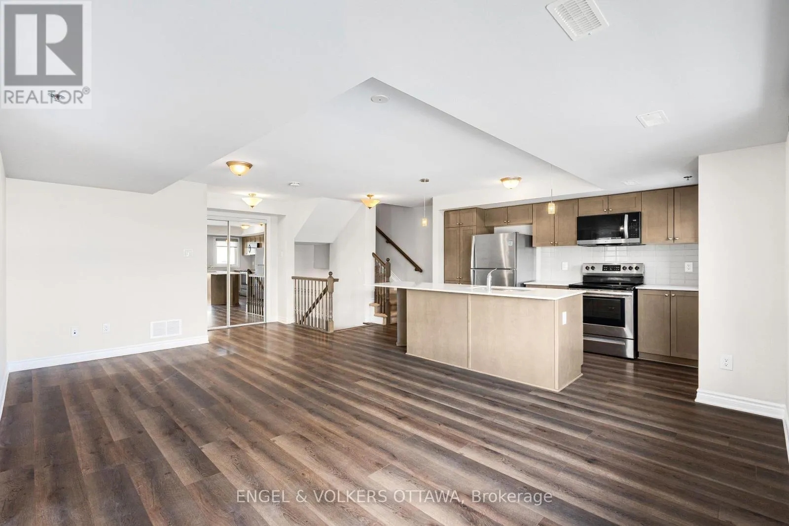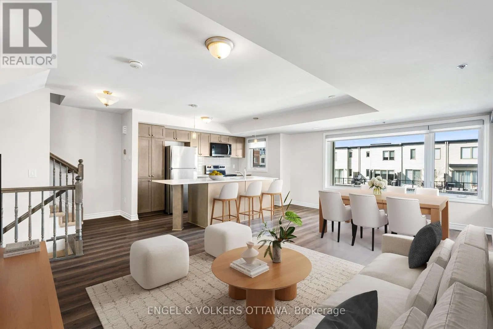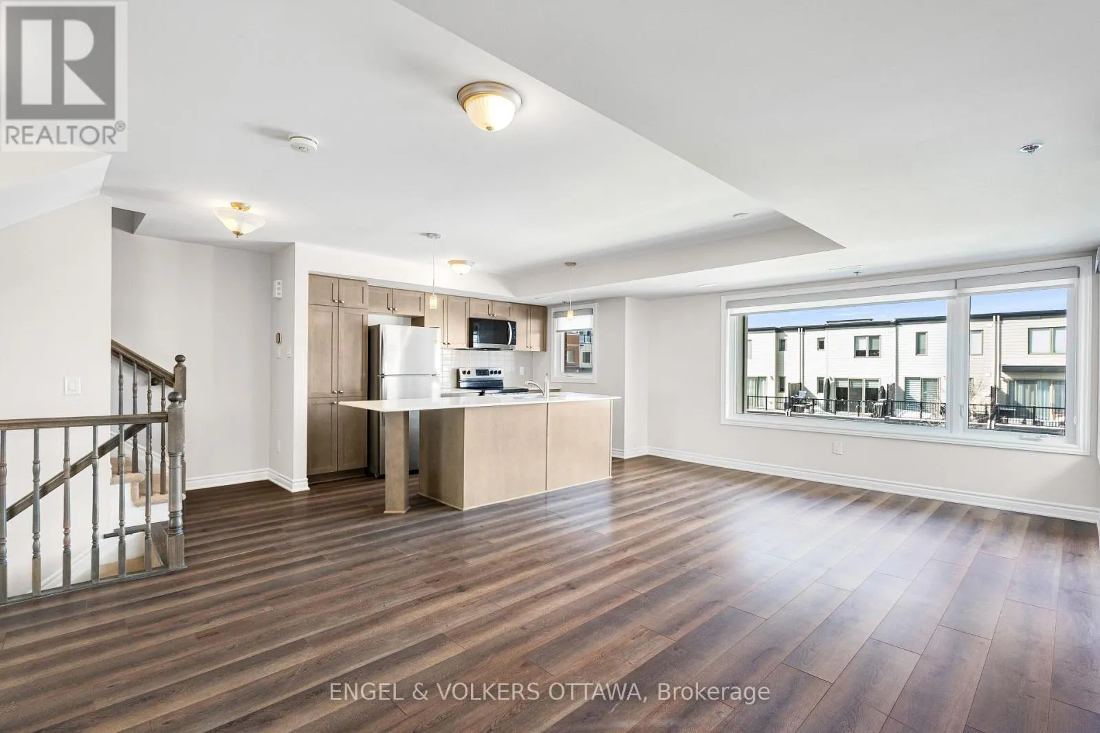 Cross Streets: Montréal Rd. & Aviation Pkwy. ** Directions: From Montréal Rd. North on Codd's Rd. Turn right onto Mikinak Rd. Left Moses Tennisco St. Right onto Miskwa Pvt. Left onto Ozawa Pvt. Welcome to Wateridge Village - where contemporary design meets a vibrant and growing community. This Mattamy Haydon model end-unit townhome distinguishes itself with a thoughtfully designed layout, enhanced privacy, and an abundance of natural light throughout.The heart of the home unfolds on the second level, where an open-concept living space is both functional and inviting. Expansive, sun-filled windows create a bright and airy atmosphere, while the seamless flow between the kitchen, dining, and living areas makes everyday living and entertaining effortless. The kitchen is anchored by a generous centre island with seating-perfect for casual meals, morning coffee, or gathering with guests-along with the added convenience of a powder room on this level. Upstairs, two well-proportioned bedrooms offer comfort and privacy. The primary bedroom benefits from a cheater ensuite to the sleek, modern full bath, and the inclusion of upper-level laundry adds to the home's practical, well-considered design. A true highlight is the private rooftop terrace-an exceptional outdoor retreat perfect for morning coffee, evening unwinding, or hosting friends under the summer sky. (id:27476)