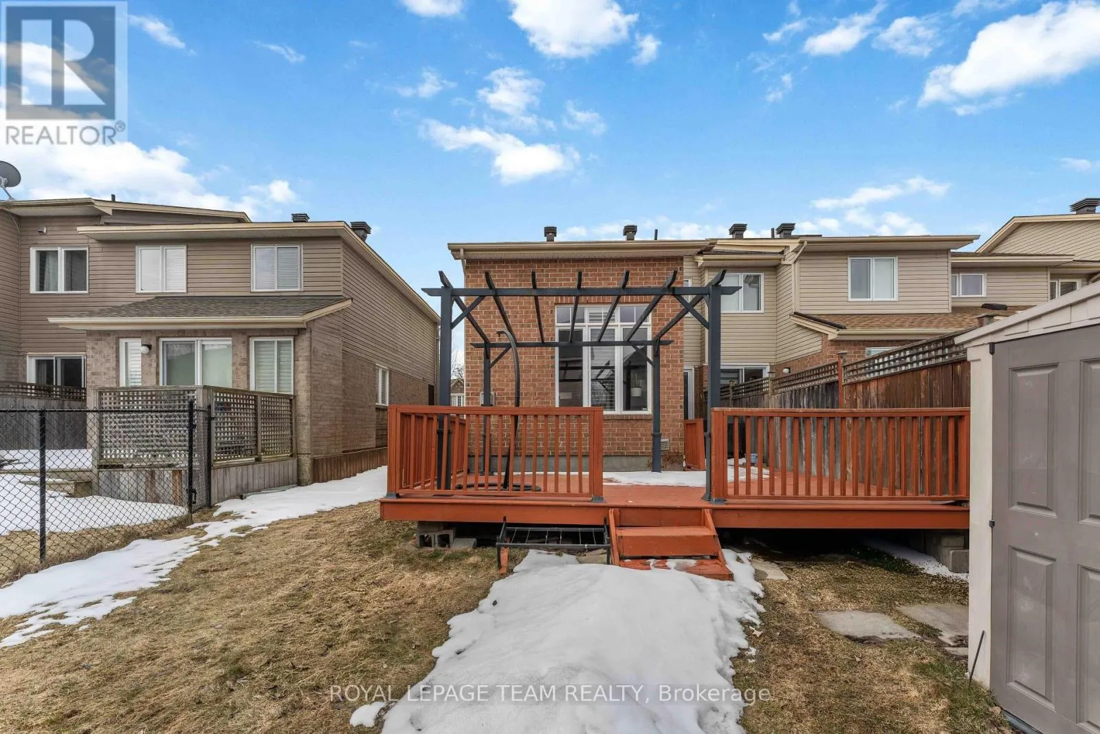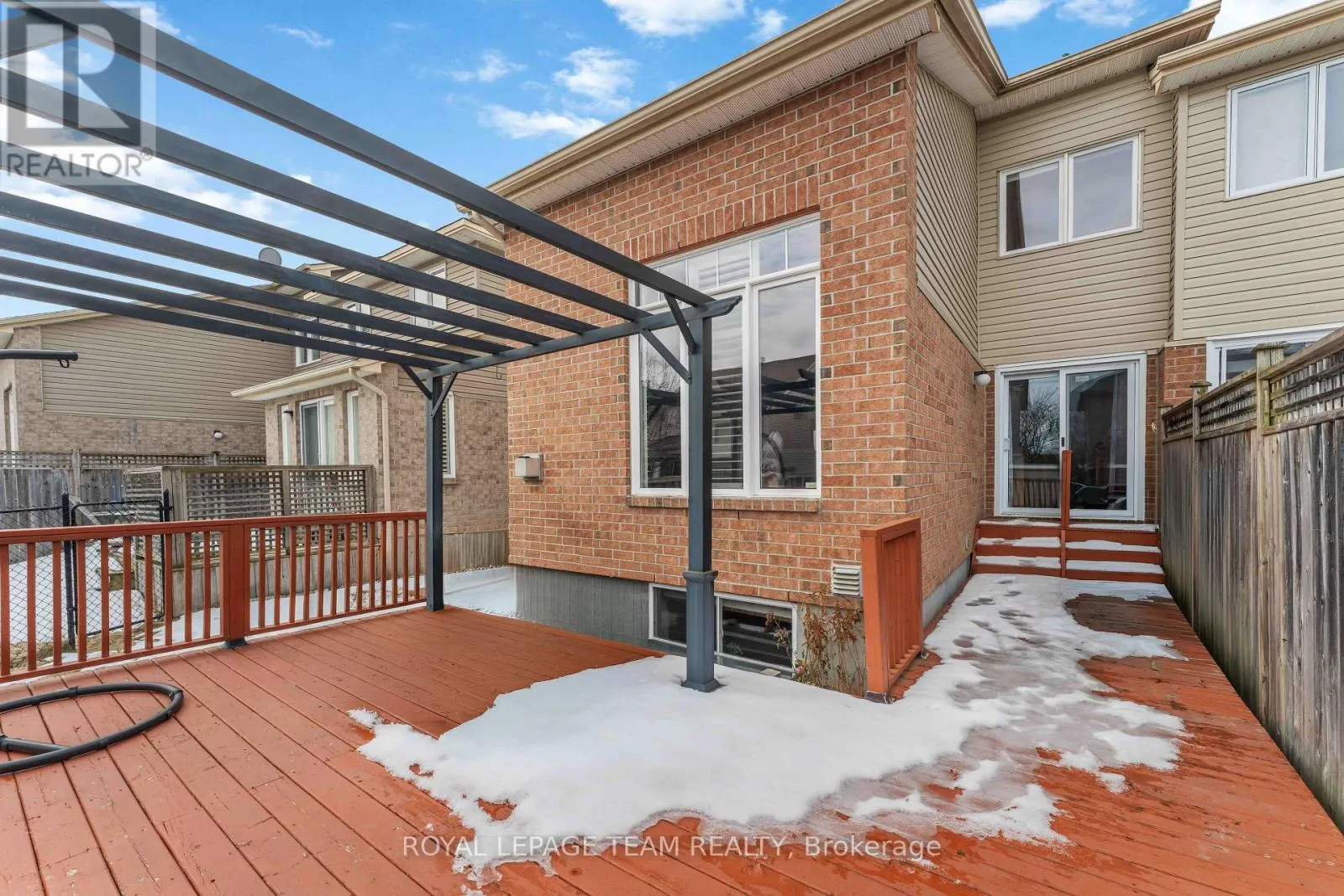 Cross Streets: Limebank Rd & Spratt Rd. ** Directions: Limebank Rd to Spratt Rd, turn left onto N Bluff Dr, turn right onto Bookton Pl. Welcome to 308 Grey Seal Circle, a beautifully maintained end-unit townhome in desirable Riverside South. Offering 1,412 sq ft of above-grade space plus a finished basement, this 2-storey home combines comfort, function, and an unbeatable location. The main level features gleaming hardwood flooring leading to a living room with soaring vaulted ceiling, anchored by a gas fireplace. The space is warm and welcoming. The kitchen was updated with quartz countertops (2015) and updated appliances (2015), and offers a convenient eat-in area, a pantry for storage, and direct access to the backyard. Out back, enjoy your private deck, gas line for the gas BBQ, a pergola and a pear tree. Enjoy outdoor living, entertaining, and added privacy with easy access to the yard. Upstairs, you'll find a spacious primary bedroom with a 4-piece ensuite featuring a stand-up shower and a huge soaker tub. There are also two additional well-sized bedrooms and an updated family bathroom. Both second-floor toilets (2024) and bathroom sinks/vanities (2019) have been refreshed for added peace of mind. The fully finished basement offers a spacious recreation room complete with an electric fireplace ideal for cozy movie nights, an additional bedroom with a large window along with a convenient full bathroom and tons of storage space. Notable updates include: roof (2022), PVC shutters (2018), front door (2023), patio door (2024), front walkway (2013), owned hot water tank (2015), forced air furnace (2025) and central air for year-round comfort. Located in a great neighbourhood, this home offers easy access to main roads, parks, schools, public transit, and everyday amenities, in addition to being only about 10 minutes from Ottawa International Airport (YOW). An excellent opportunity to own a move-in-ready home in a convenient and established Riverside South community. 24-hr irrevocable on all offers as per form 244. (id:27476)