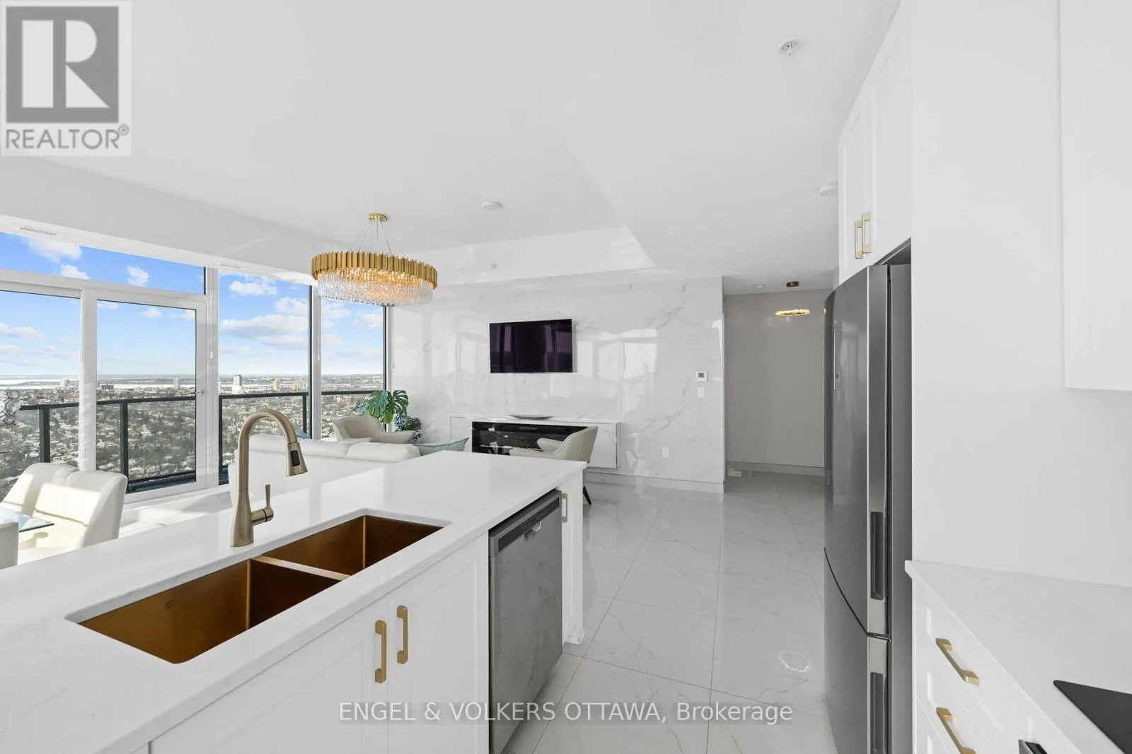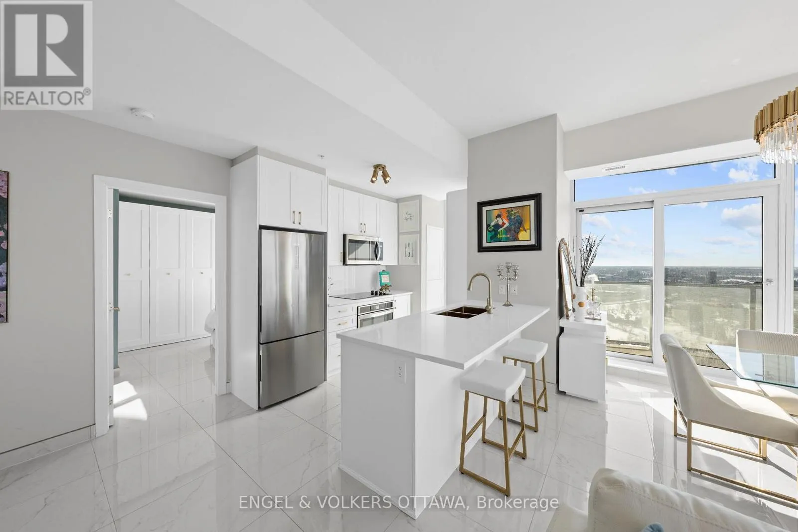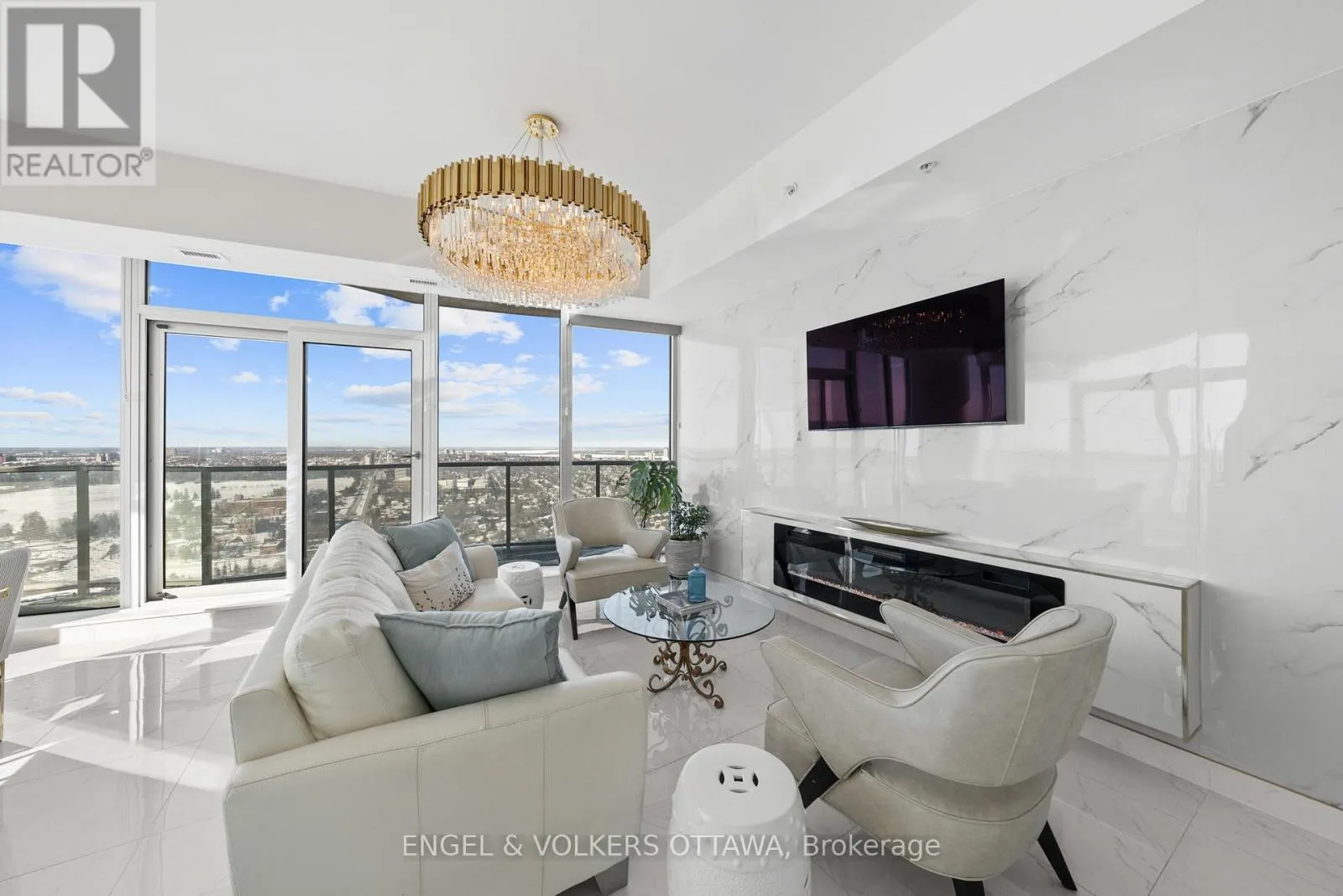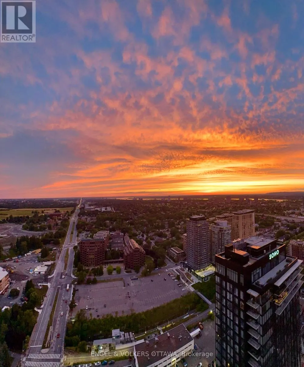 Cross Streets: Carling Ave & Preston St. ** Directions: Carling Ave. A SKY RESIDENCE ABOVE IT ALL. Perched high above Little Italy in The Icon, this beautiful 1,160 sq.ft. 2-bedroom, 2-bath condo captures breathtaking panoramic views from the Gatineau Hills across Dow's Lake and beyond, with spectacular light from sunrise to sunset. 3 private balconies extend from the principal rooms, creating a sense of openness. Recently reimagined with exquisite porcelain flooring, the interior feels sophisticated and entirely bespoke. A dramatic marble-inspired feature wall anchors the living space, paired with a sleek contemporary fireplace that introduces warmth and striking visual impact. Two imported statement chandeliers bring sculptural elegance and unmistakable glamour. Brushed gold detailing is integrated throughout the main living areas, from custom baseboard trim to upgraded faucets, hardware and kitchen sink, creating an elevated aesthetic. The kitchen is sleek with quartz surfaces and stainless-steel appliances. The primary suite offers a serene retreat with a beautifully designed walk-in closet and an elegant ensuite featuring a glass shower. A well-proportioned second bedroom provides flexibility for guests or a sophisticated home office. A beautifully appointed main 4-piece bathroom completes the home, finished with refined materials and a clean, timeless aesthetic. Electronic sun and heat screens and blackout blinds offer comfort and privacy at the touch of a button. In-unit laundry adds everyday convenience. Included is one of the building's most desirable three-sided parking spaces with two storage units. Life at The Icon places you moments from Dow's Lake, the Rideau Canal, and the restaurants of Little Italy. With a pool, sauna, gym, theatre, and guest suites. The Icon delivers an amenity-rich lifestyle with the feel of an urban resort. An exceptional opportunity to own a meticulously upgraded residence in one of Ottawa's most dynamic neighbourhoods. This is elevated living: Architectural. Intentional. Unforgettable. (id:27476)