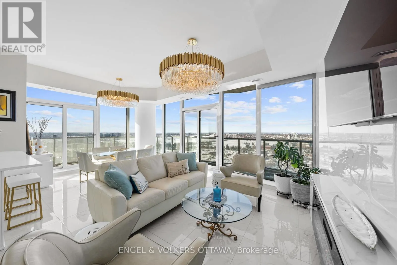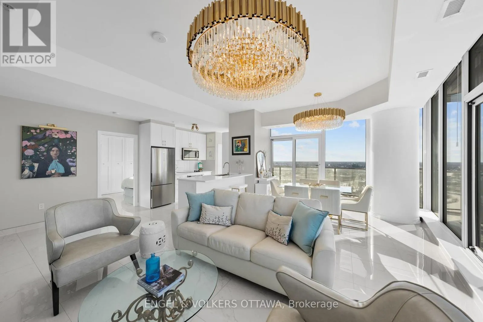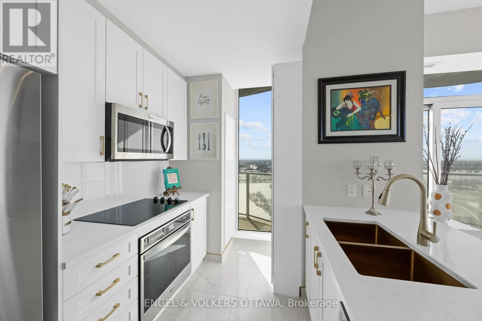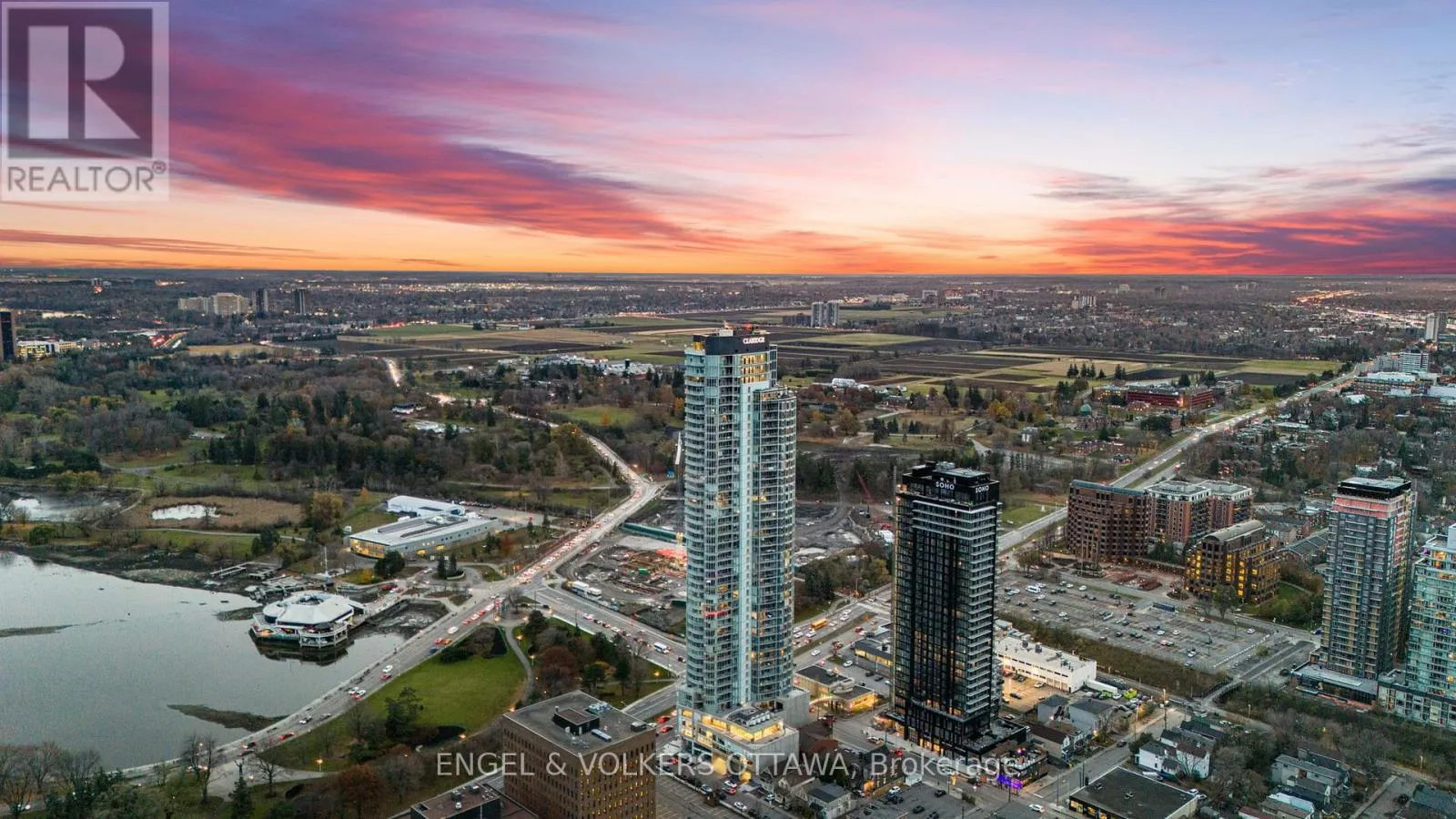 Cross Streets: Carling Ave & Preston St. ** Directions: Carling Ave. A SKY RESIDENCE ABOVE IT ALL. Perched high above Little Italy in The Icon, this beautiful 1,160 sq.ft. 2-bedroom, 2-bath condo captures breathtaking panoramic views from the Gatineau Hills across Dow's Lake and beyond, with spectacular light from sunrise to sunset. 3 private balconies extend from the principal rooms, creating a sense of openness. Recently reimagined with exquisite porcelain flooring, the interior feels sophisticated and entirely bespoke. A dramatic marble-inspired feature wall anchors the living space, paired with a sleek contemporary fireplace that introduces warmth and striking visual impact. Two imported statement chandeliers bring sculptural elegance and unmistakable glamour. Brushed gold detailing is integrated throughout the main living areas, from custom baseboard trim to upgraded faucets, hardware and kitchen sink, creating an elevated aesthetic. The kitchen is sleek with quartz surfaces and stainless-steel appliances. The primary suite offers a serene retreat with a beautifully designed walk-in closet and an elegant ensuite featuring a glass shower. A well-proportioned second bedroom provides flexibility for guests or a sophisticated home office. A beautifully appointed main 4-piece bathroom completes the home, finished with refined materials and a clean, timeless aesthetic. Electronic sun and heat screens and blackout blinds offer comfort and privacy at the touch of a button. In-unit laundry adds everyday convenience. Included is one of the building's most desirable three-sided parking spaces with two storage units. Life at The Icon places you moments from Dow's Lake, the Rideau Canal, and the restaurants of Little Italy. With a pool, sauna, gym, theatre, and guest suites. The Icon delivers an amenity-rich lifestyle with the feel of an urban resort. An exceptional opportunity to own a meticulously upgraded residence in one of Ottawa's most dynamic neighbourhoods. This is elevated living: Architectural. Intentional. Unforgettable. (id:27476)