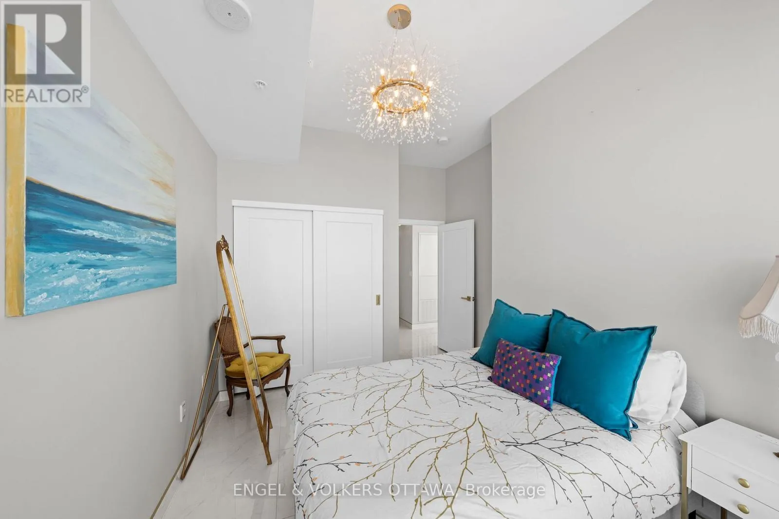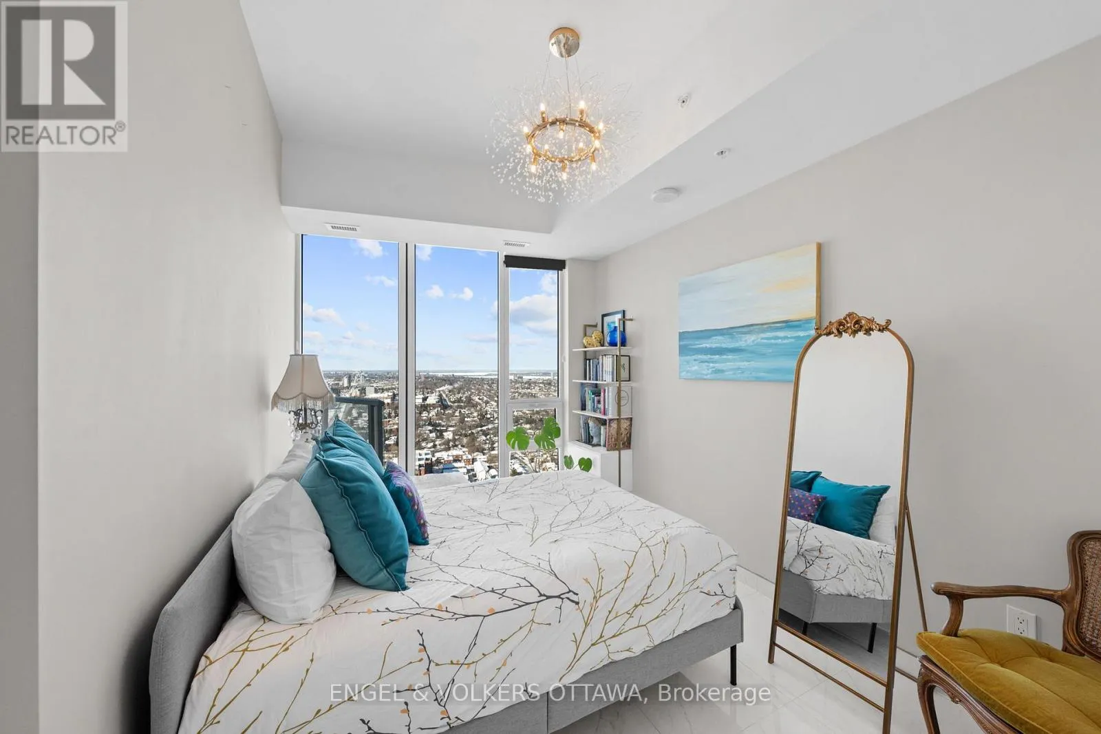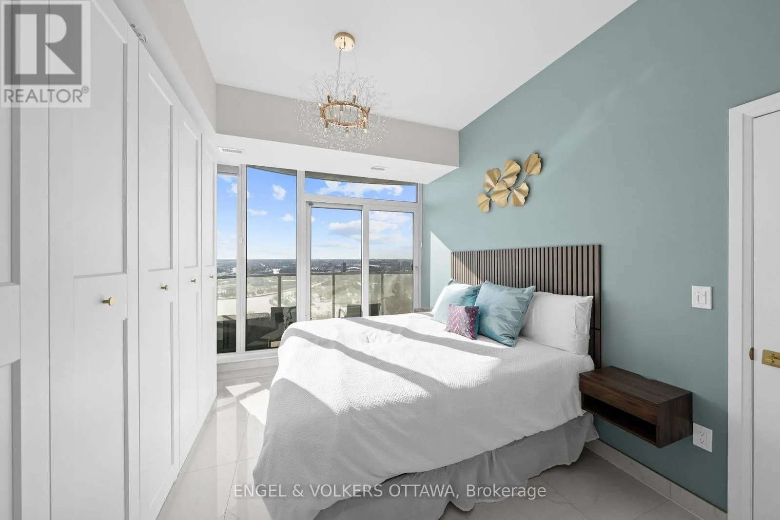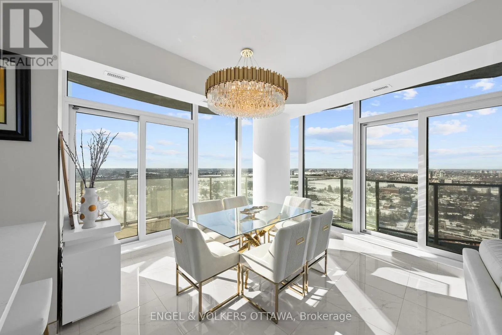 Cross Streets: Carling Ave & Preston St. ** Directions: Carling Ave. A SKY RESIDENCE ABOVE IT ALL. Perched high above Little Italy in The Icon, this beautiful 1,160 sq.ft. 2-bedroom, 2-bath condo captures breathtaking panoramic views from the Gatineau Hills across Dow's Lake and beyond, with spectacular light from sunrise to sunset. 3 private balconies extend from the principal rooms, creating a sense of openness. Recently reimagined with exquisite porcelain flooring, the interior feels sophisticated and entirely bespoke. A dramatic marble-inspired feature wall anchors the living space, paired with a sleek contemporary fireplace that introduces warmth and striking visual impact. Two imported statement chandeliers bring sculptural elegance and unmistakable glamour. Brushed gold detailing is integrated throughout the main living areas, from custom baseboard trim to upgraded faucets, hardware and kitchen sink, creating an elevated aesthetic. The kitchen is sleek with quartz surfaces and stainless-steel appliances. The primary suite offers a serene retreat with a beautifully designed walk-in closet and an elegant ensuite featuring a glass shower. A well-proportioned second bedroom provides flexibility for guests or a sophisticated home office. A beautifully appointed main 4-piece bathroom completes the home, finished with refined materials and a clean, timeless aesthetic. Electronic sun and heat screens and blackout blinds offer comfort and privacy at the touch of a button. In-unit laundry adds everyday convenience. Included is one of the building's most desirable three-sided parking spaces with two storage units. Life at The Icon places you moments from Dow's Lake, the Rideau Canal, and the restaurants of Little Italy. With a pool, sauna, gym, theatre, and guest suites. The Icon delivers an amenity-rich lifestyle with the feel of an urban resort. An exceptional opportunity to own a meticulously upgraded residence in one of Ottawa's most dynamic neighbourhoods. This is elevated living: Architectural. Intentional. Unforgettable. (id:27476)