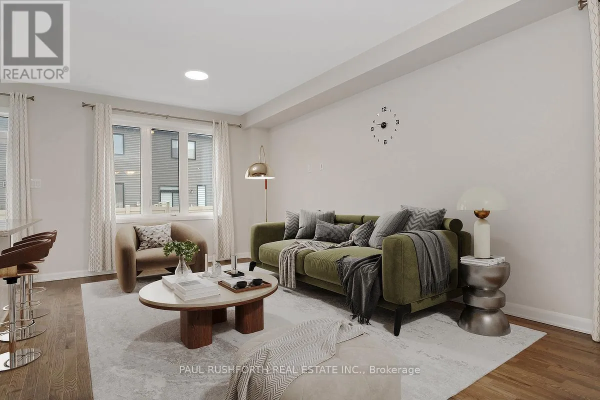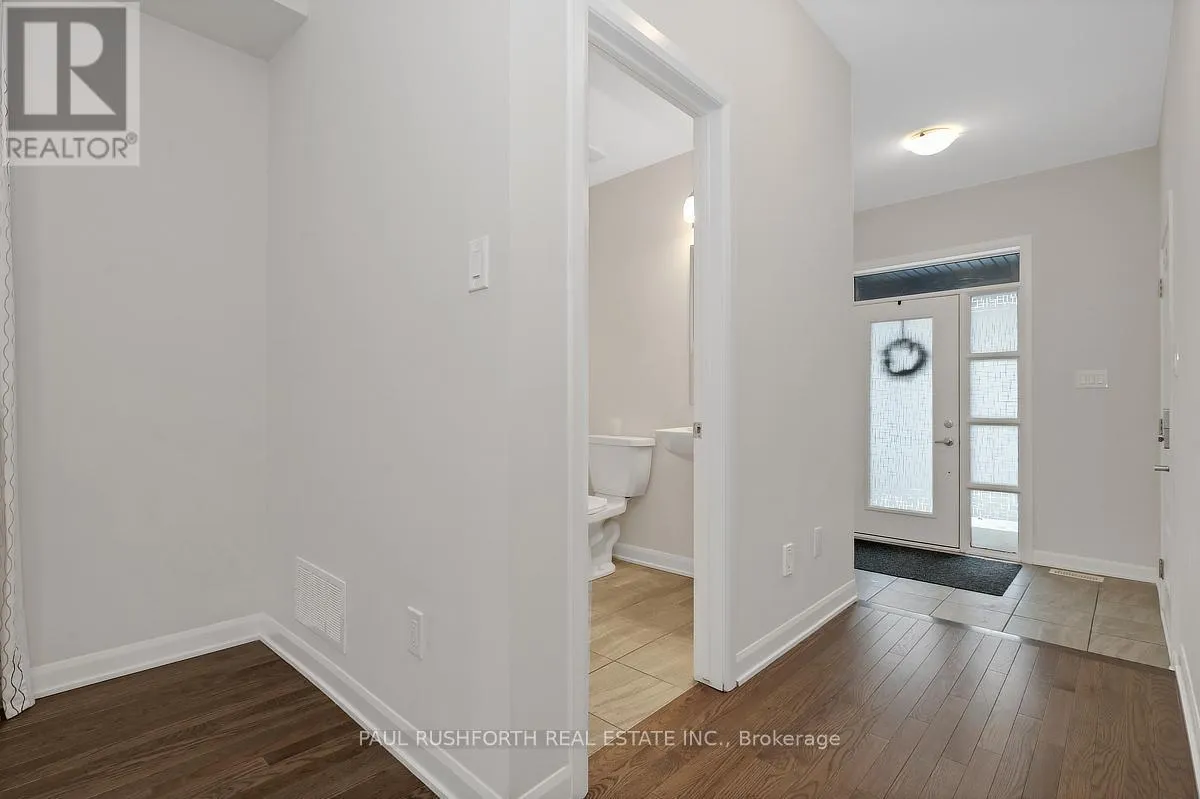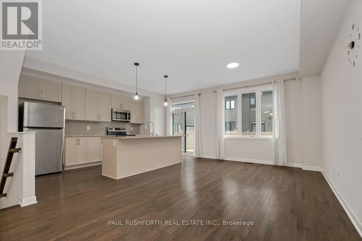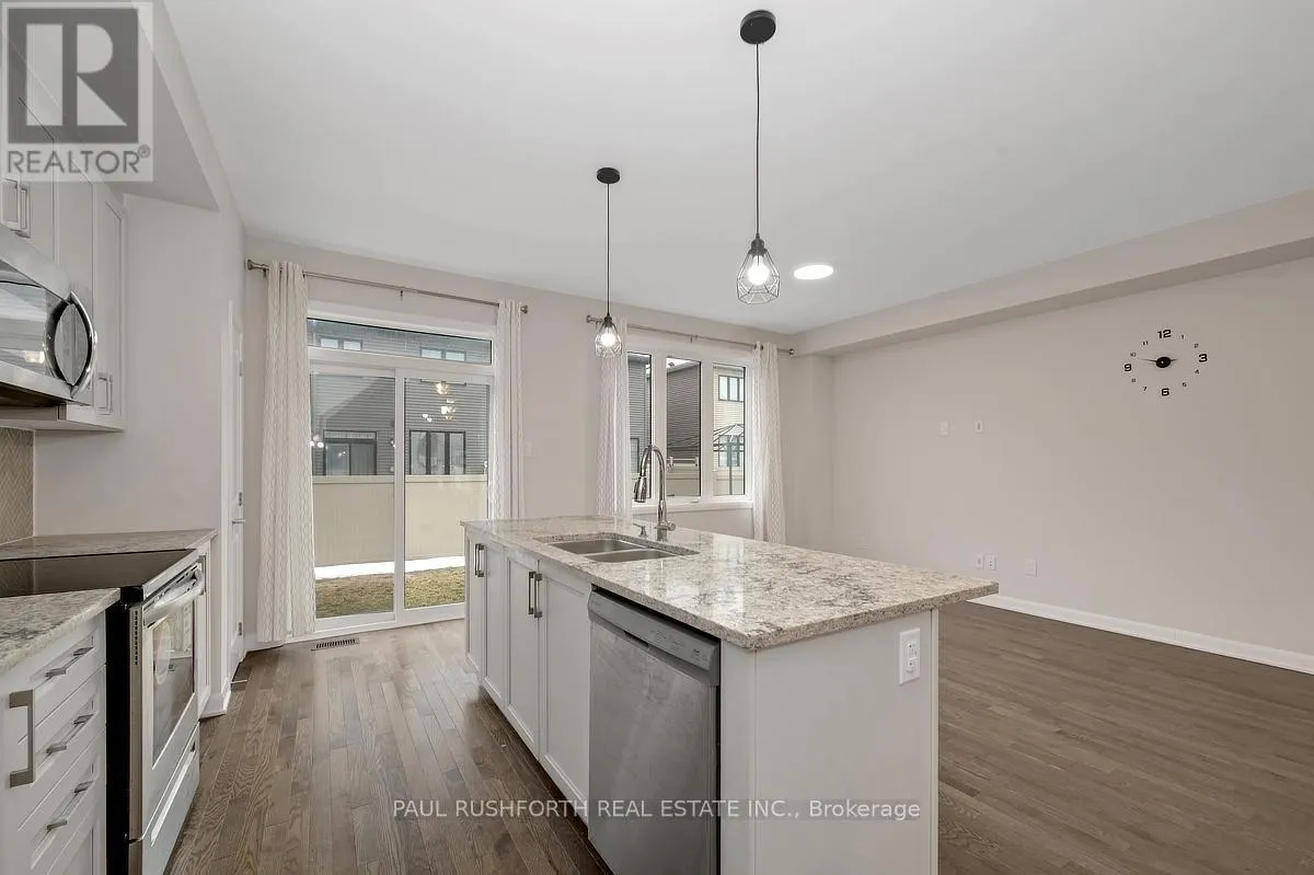 Cross Streets: Ballyhale. ** Directions: Barnsdale Rd, Left onto Inver Ln, right onto Cappamore Dr, Right at the 3rd cross street onto Ballyhale Hts, Left on Drumlish. Sunlight lingers a little longer here. Built in 2022, this beautifully maintained Monterey end unit townhome in Quinn's Pointe offers the extra windows, added privacy, and enhanced curb appeal that make end units so desirable, all in one of Ottawa's fastest growing, family friendly communities. Step inside to an open concept main floor where hardwood flooring and expansive windows create a bright, welcoming atmosphere. The spacious living and dining area flows effortlessly, ideal for both everyday living and entertaining. At the back of the home, the kitchen is both functional and inviting, with ample cabinetry, generous counter space, and a sunlit eat in area overlooking the backyard. Upstairs, the primary bedroom offers a peaceful retreat with a walk in closet and private ensuite bathroom. Two additional well proportioned bedrooms and a full bathroom provide flexibility for family life, guests, or a home office. The finished basement extends your living space with a versatile recreation area, perfect for movie nights, a playroom, or a quiet workspace. Bright, functional layout located in sought after Quinn's Pointe, close to parks, schools, shopping, and transit, this home delivers the ideal balance of modern living, space, and convenience. Some photos have been virtually staged. (id:27476)