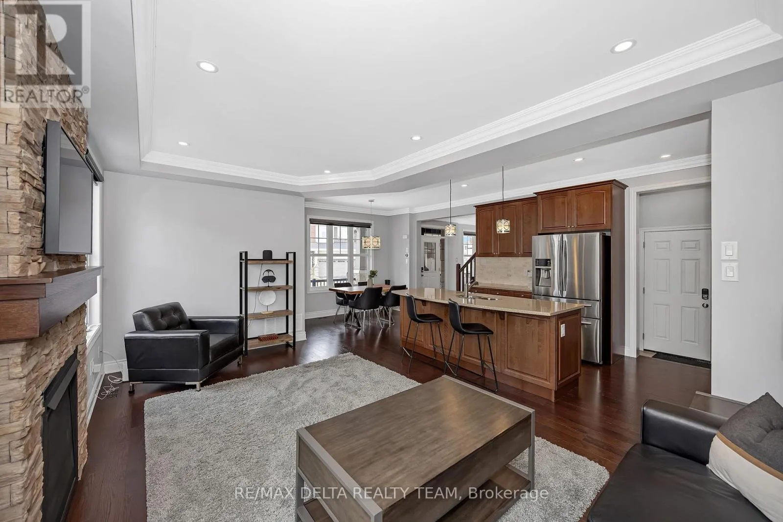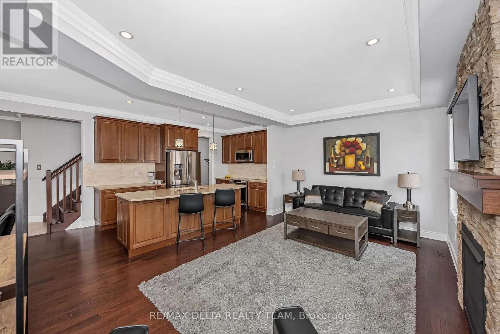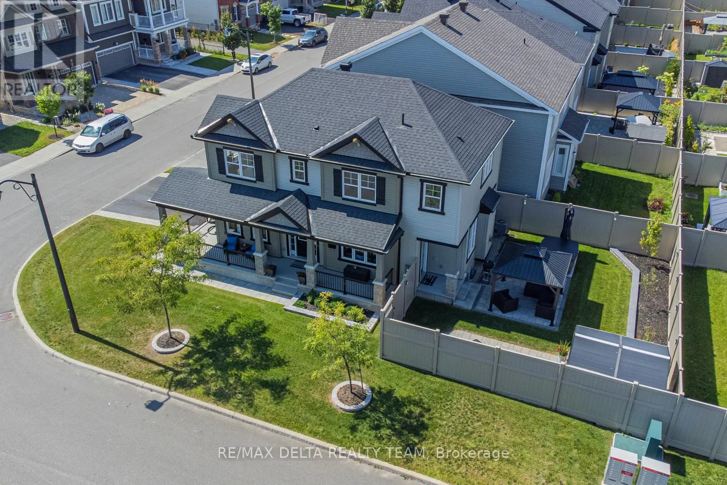 Cross Streets: Devario and Fameflower. ** Directions: Greenbank South of Strandherd to Dundonald to Devario Crescent. Welcome to this beautifully upgraded open-concept home, perfectly situated just steps from Lamprey Park in sought-after Half Moon Bay. The extended interlock driveway and elegant wraparound front porch create exceptional curb appeal from the moment you arrive. Inside, a spacious tiled foyer leads to a stunning chef's kitchen featuring a large island with breakfast bar, quartz countertops, stainless-steel appliances, and custom window blinds throughout. The kitchen flows seamlessly into the generous dining area and bright living room, complete with a cultured-stone gas fireplace-an ideal space for both entertaining and everyday living. Upstairs offers four spacious bedrooms, including a luxurious primary suite with a walk-in closet and spa-inspired 5-piece ensuite. A convenient second-floor laundry room adds everyday practicality. Hardwood flooring extends across the main level, staircase, and upper hallway, while all bathrooms feature stylish quartz finishes. The fully finished lower level provides exceptional additional living space with a fifth bedroom, and a full 3-piece bathroom-perfect for guests, extended family, or a private retreat. Set on a large, fully fenced corner lot, the backyard is designed for outdoor enjoyment with professional interlock landscaping, a gazebo, BBQ gas line, hot tub, and storage shed. The garage is fully outfitted with wall organizers, a workshop heater, and a central vacuum outlet, offering both convenience and functionality. (id:27476)