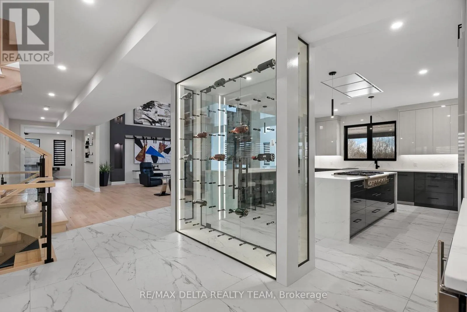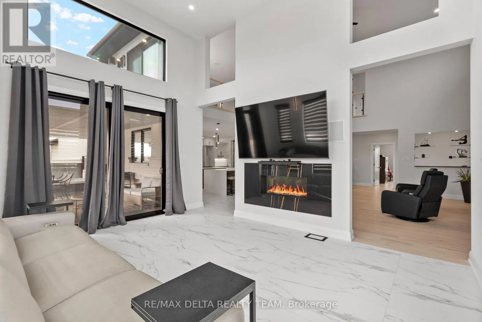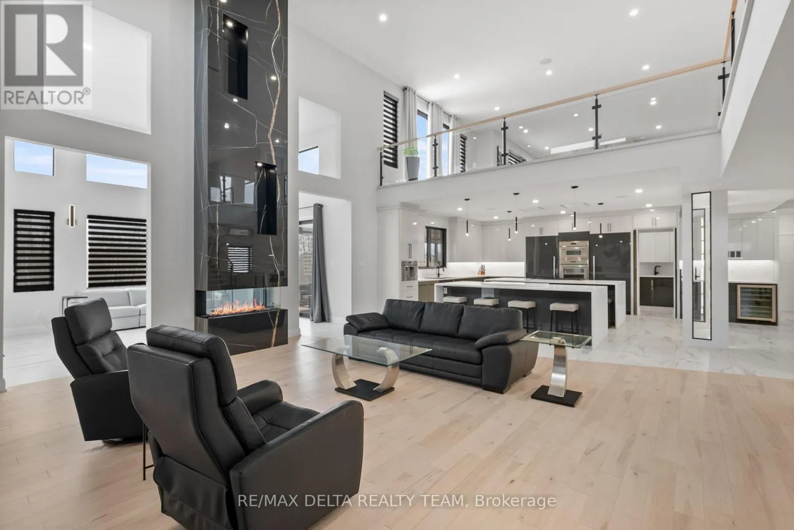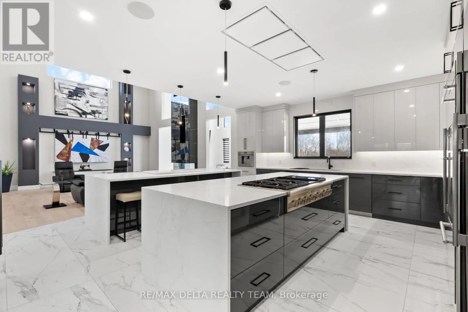 Albion Rd & Mitch Owens Dr. Tailored for the executive lifestyle, perfected for family living. Welcome to 663 Ballycastle Crescent a showstopping modern residence with commanding curb appeal, set on a quiet crescent lined with prestigious homes and backing onto peaceful open space. With over 5,700 sq. ft. of refined living space, this 5-bedroom, 6-bathroom home is a true architectural statement. The exterior offers bold, clean lines and grand scale, while inside, elegance meets innovation. Soaring 20-foot ceilings and a dramatic open-riser staircase set the tone in the main living area anchored by a double-sided porcelain-wrapped fireplace and lighted artwork niches. Maple and leather-finished porcelain floors run throughout the main level. The kitchen is both luxurious and functional, with dual waterfall quartz islands, Thermador appliances, a walk-in pantry, and a striking glass wine feature. A spacious main floor suite with walk-in closet and ensuite offers flexible comfort for guests or extended family. Upstairs, an 830 sq. ft. loft overlooks the great room, connecting two bedrooms each with private ensuites and walk-ins plus a bar area. The 540 sq. ft. primary suite offers a stunning gas fireplace, a dream walk-in closet with quartz island and a spa-inspired ensuite with freestanding tub, porcelain finishes, and custom-lit glass shower with rain heads and jets. The lower level features radiant-heated floors, a fireplace lounge, wet bar, theater, fifth bedroom and full bath, and a 900 sq. ft. commercial-grade gym with mirrors and glass dividers. Built-in media and smart systems run throughout. A 1,200 sq. ft. triple garage offers an oversized bay, loft storage, and backyard access. Two expansive decks add outdoor living space. Minutes from the new Hard Rock Casino and surrounded by luxury. This is a home that makes a statement. (id:27476)
