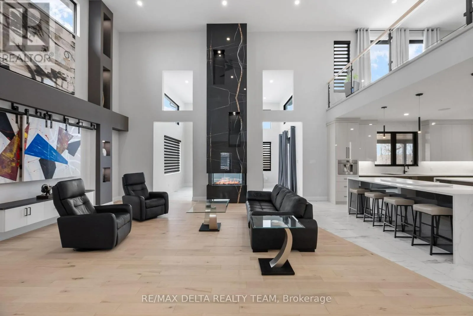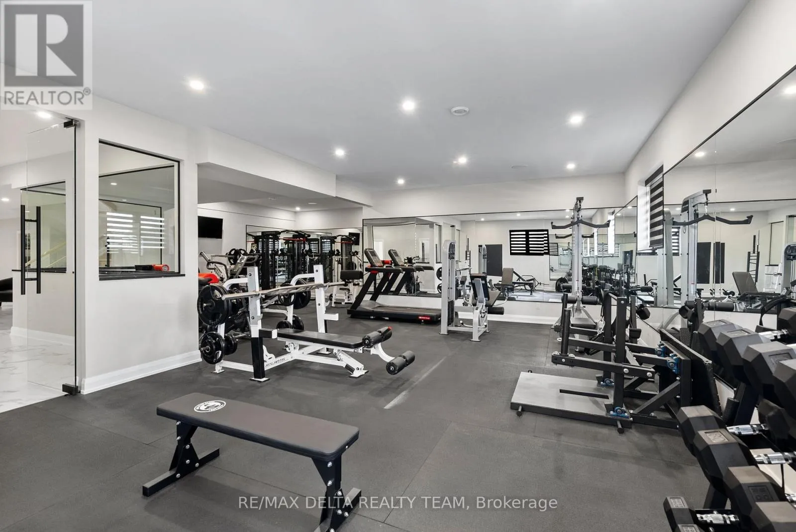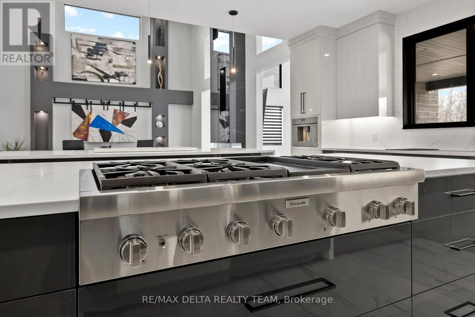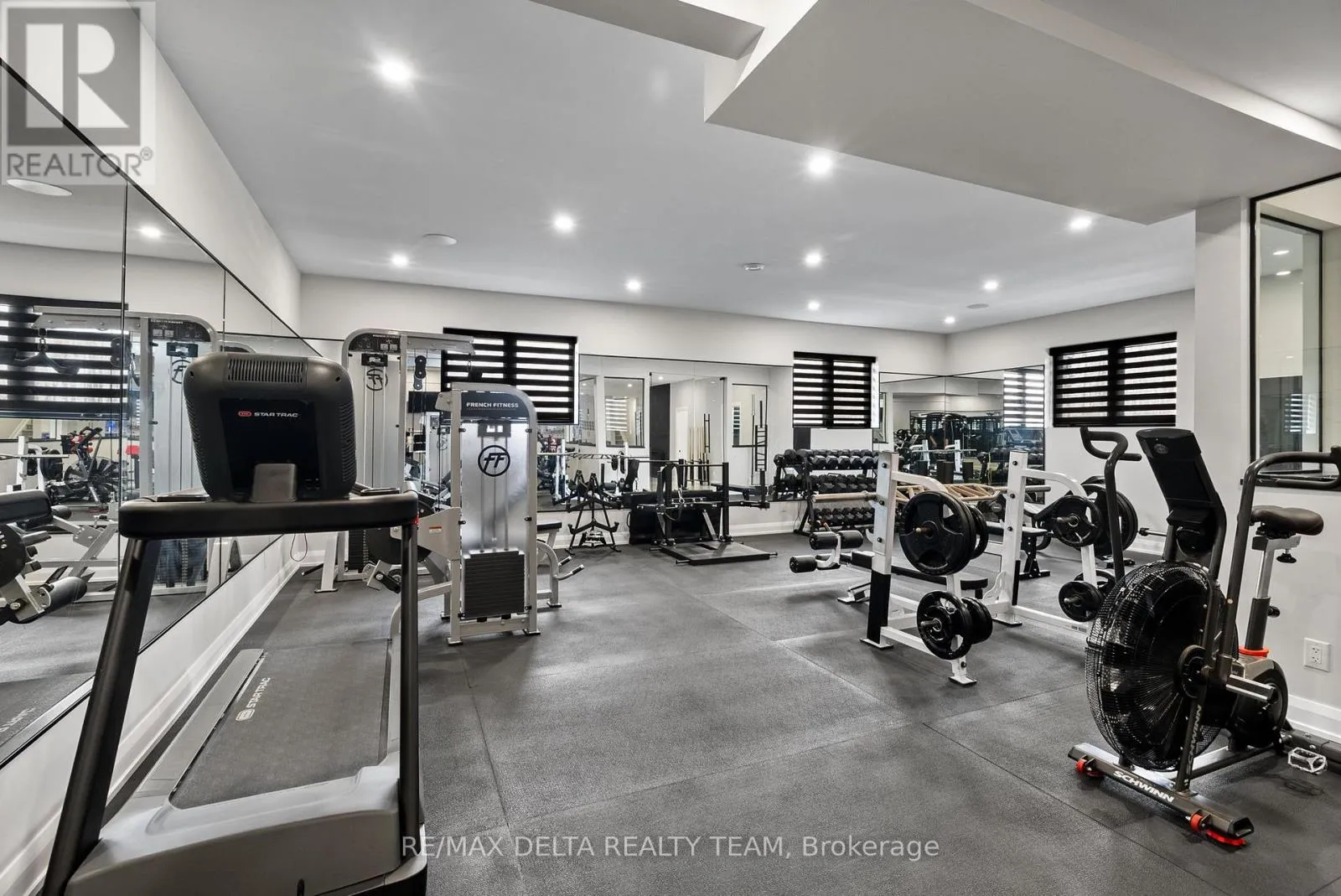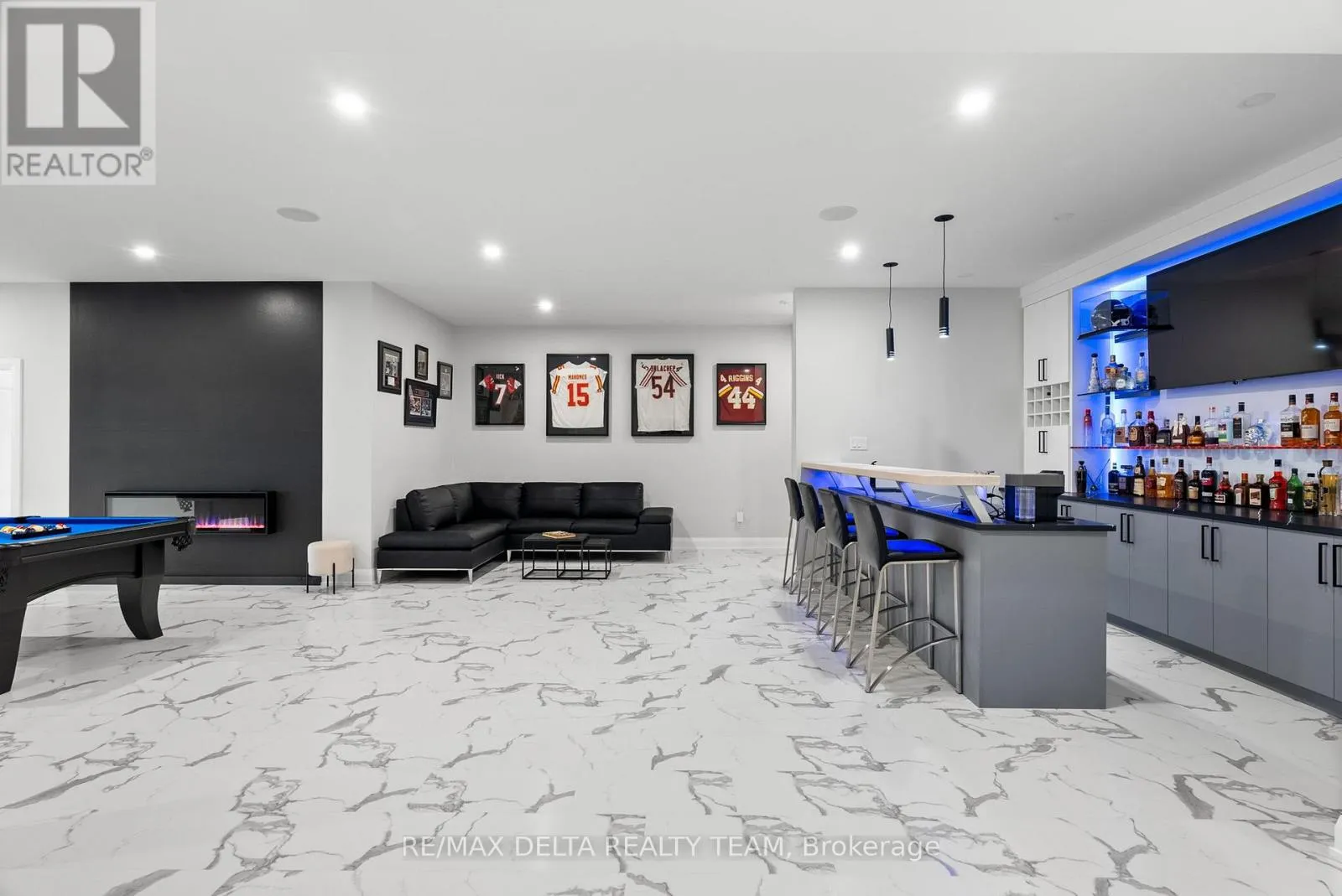 Albion Rd & Mitch Owens Dr. Tailored for the executive lifestyle, perfected for family living. Welcome to 663 Ballycastle Crescent a showstopping modern residence with commanding curb appeal, set on a quiet crescent lined with prestigious homes and backing onto peaceful open space. With over 5,700 sq. ft. of refined living space, this 5-bedroom, 6-bathroom home is a true architectural statement. The exterior offers bold, clean lines and grand scale, while inside, elegance meets innovation. Soaring 20-foot ceilings and a dramatic open-riser staircase set the tone in the main living area anchored by a double-sided porcelain-wrapped fireplace and lighted artwork niches. Maple and leather-finished porcelain floors run throughout the main level. The kitchen is both luxurious and functional, with dual waterfall quartz islands, Thermador appliances, a walk-in pantry, and a striking glass wine feature. A spacious main floor suite with walk-in closet and ensuite offers flexible comfort for guests or extended family. Upstairs, an 830 sq. ft. loft overlooks the great room, connecting two bedrooms each with private ensuites and walk-ins plus a bar area. The 540 sq. ft. primary suite offers a stunning gas fireplace, a dream walk-in closet with quartz island and a spa-inspired ensuite with freestanding tub, porcelain finishes, and custom-lit glass shower with rain heads and jets. The lower level features radiant-heated floors, a fireplace lounge, wet bar, theater, fifth bedroom and full bath, and a 900 sq. ft. commercial-grade gym with mirrors and glass dividers. Built-in media and smart systems run throughout. A 1,200 sq. ft. triple garage offers an oversized bay, loft storage, and backyard access. Two expansive decks add outdoor living space. Minutes from the new Hard Rock Casino and surrounded by luxury. This is a home that makes a statement. (id:27476)