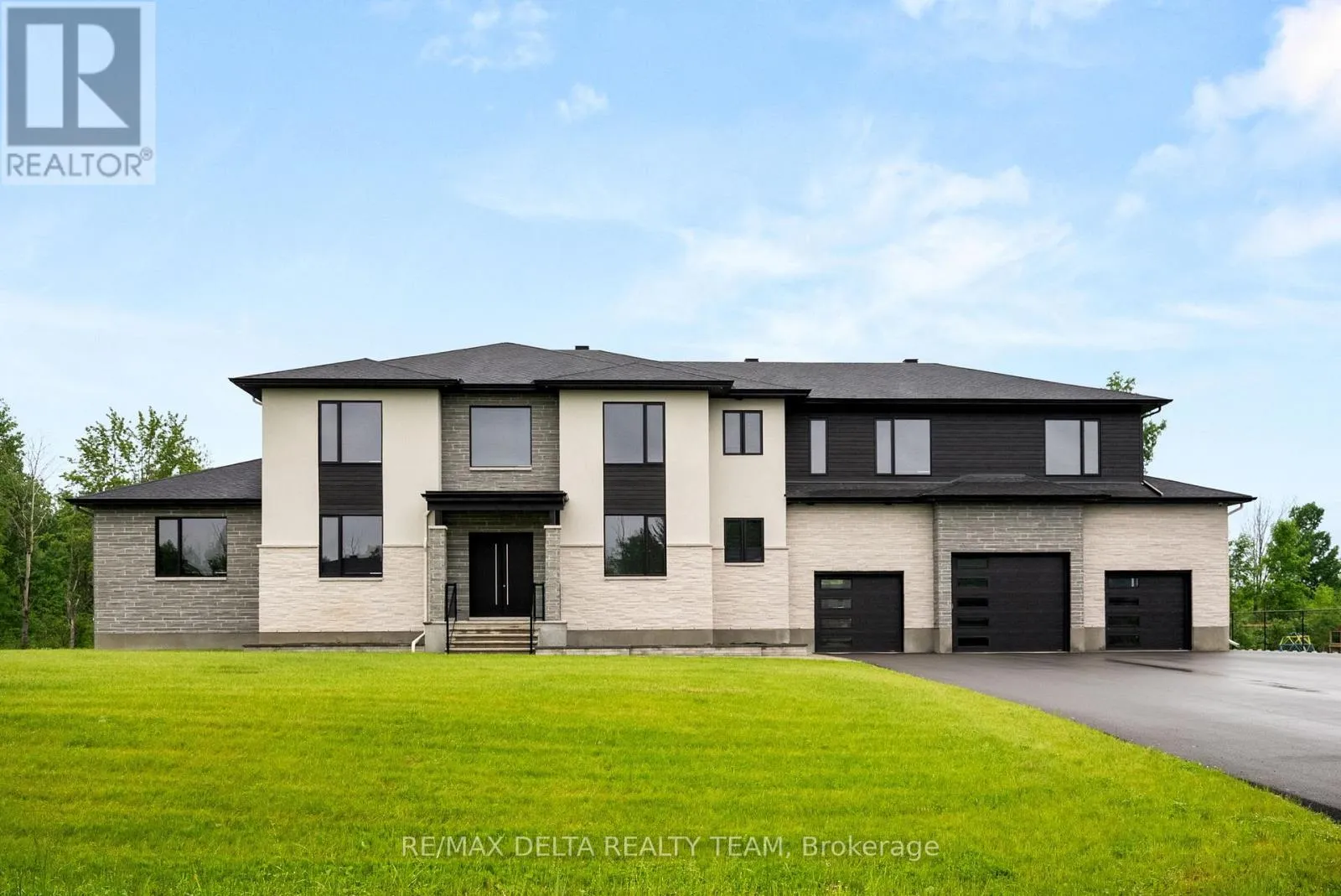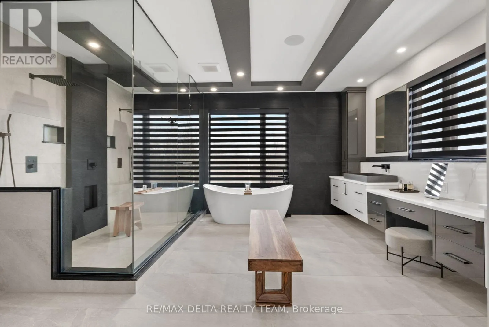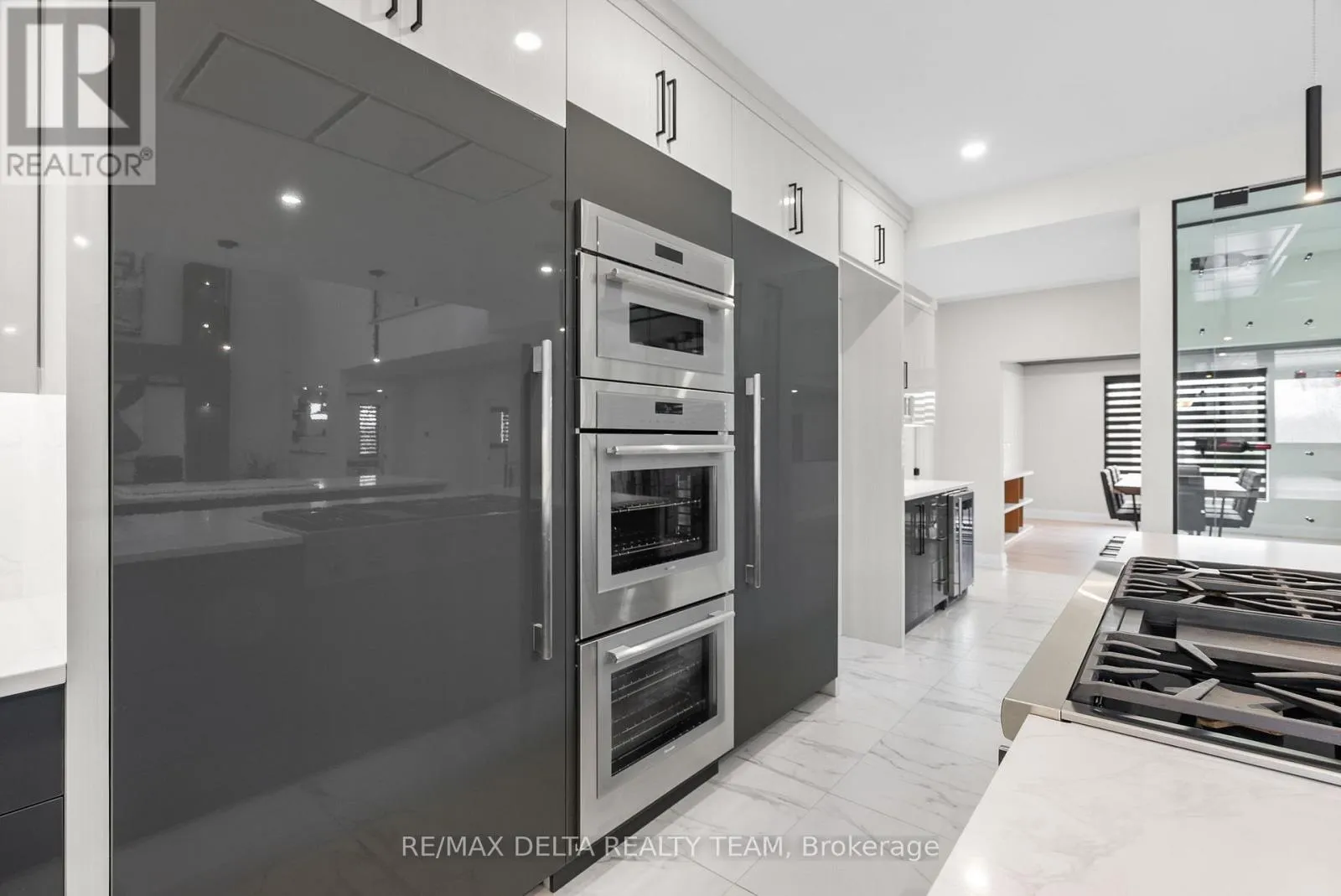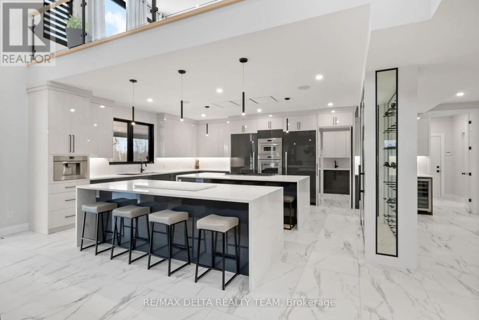 Albion Rd & Mitch Owens Dr. Tailored for the executive lifestyle, perfected for family living. Welcome to 663 Ballycastle Crescent a showstopping modern residence with commanding curb appeal, set on a quiet crescent lined with prestigious homes and backing onto peaceful open space. With over 5,700 sq. ft. of refined living space, this 5-bedroom, 6-bathroom home is a true architectural statement. The exterior offers bold, clean lines and grand scale, while inside, elegance meets innovation. Soaring 20-foot ceilings and a dramatic open-riser staircase set the tone in the main living area anchored by a double-sided porcelain-wrapped fireplace and lighted artwork niches. Maple and leather-finished porcelain floors run throughout the main level. The kitchen is both luxurious and functional, with dual waterfall quartz islands, Thermador appliances, a walk-in pantry, and a striking glass wine feature. A spacious main floor suite with walk-in closet and ensuite offers flexible comfort for guests or extended family. Upstairs, an 830 sq. ft. loft overlooks the great room, connecting two bedrooms each with private ensuites and walk-ins plus a bar area. The 540 sq. ft. primary suite offers a stunning gas fireplace, a dream walk-in closet with quartz island and a spa-inspired ensuite with freestanding tub, porcelain finishes, and custom-lit glass shower with rain heads and jets. The lower level features radiant-heated floors, a fireplace lounge, wet bar, theater, fifth bedroom and full bath, and a 900 sq. ft. commercial-grade gym with mirrors and glass dividers. Built-in media and smart systems run throughout. A 1,200 sq. ft. triple garage offers an oversized bay, loft storage, and backyard access. Two expansive decks add outdoor living space. Minutes from the new Hard Rock Casino and surrounded by luxury. This is a home that makes a statement. (id:27476)