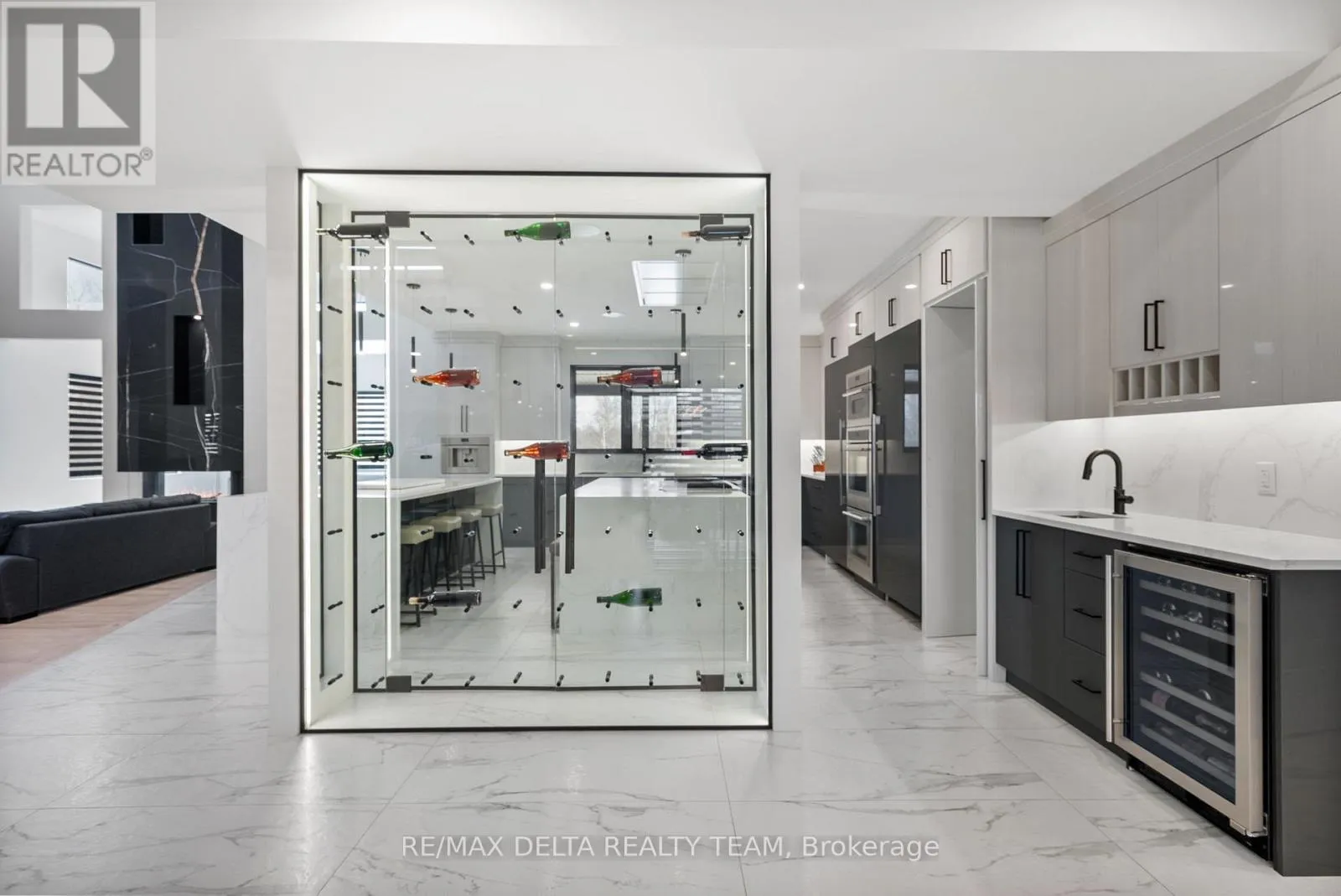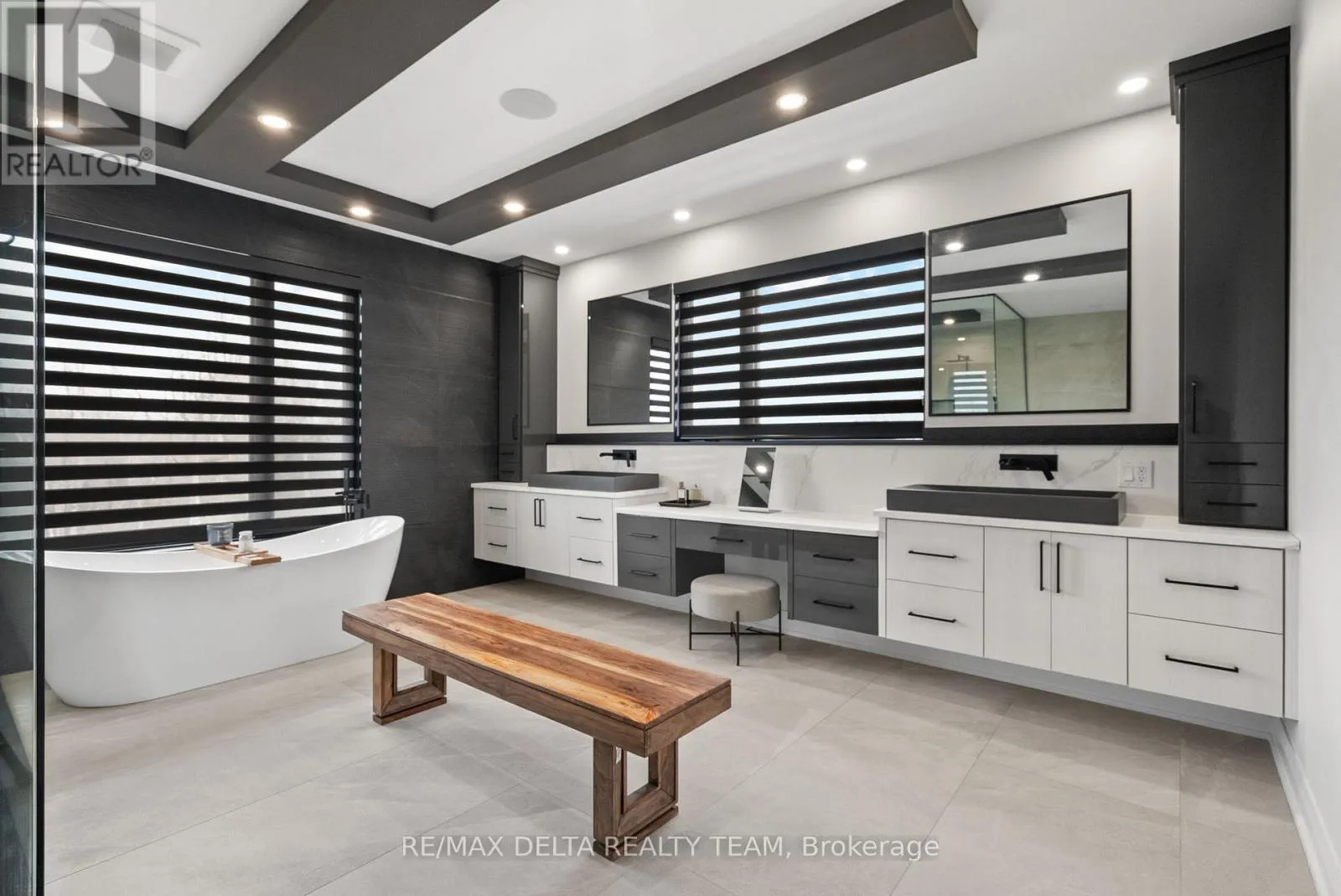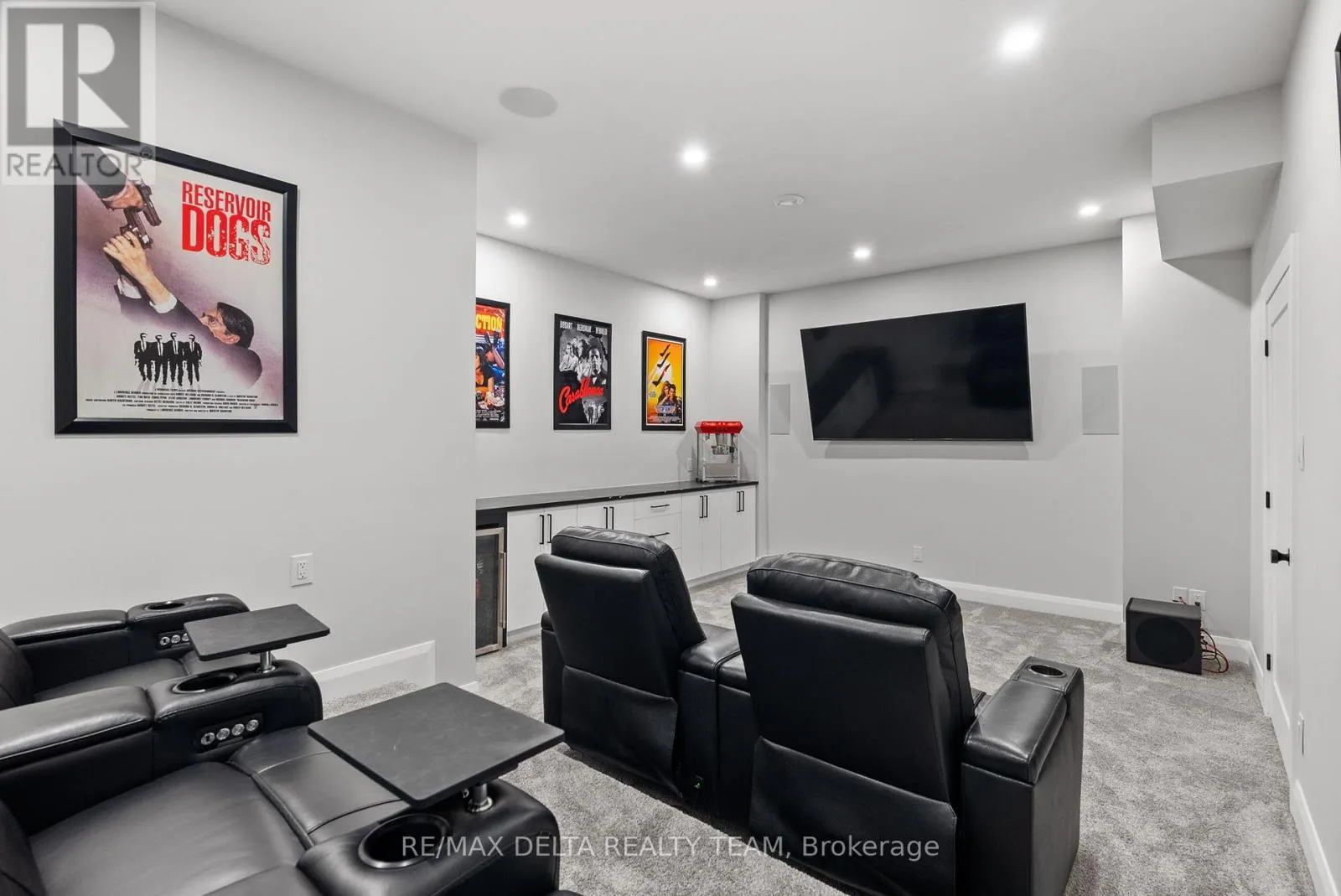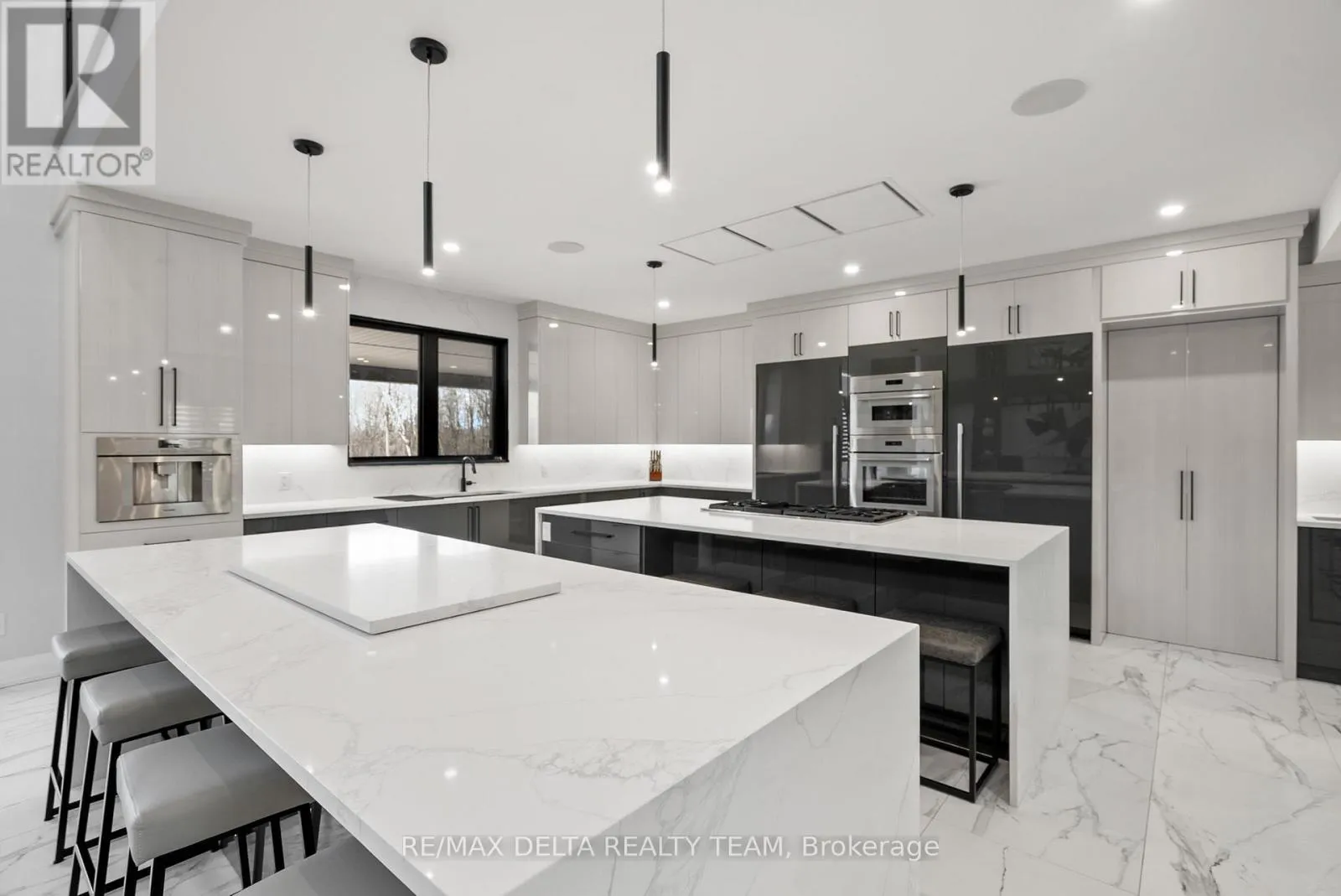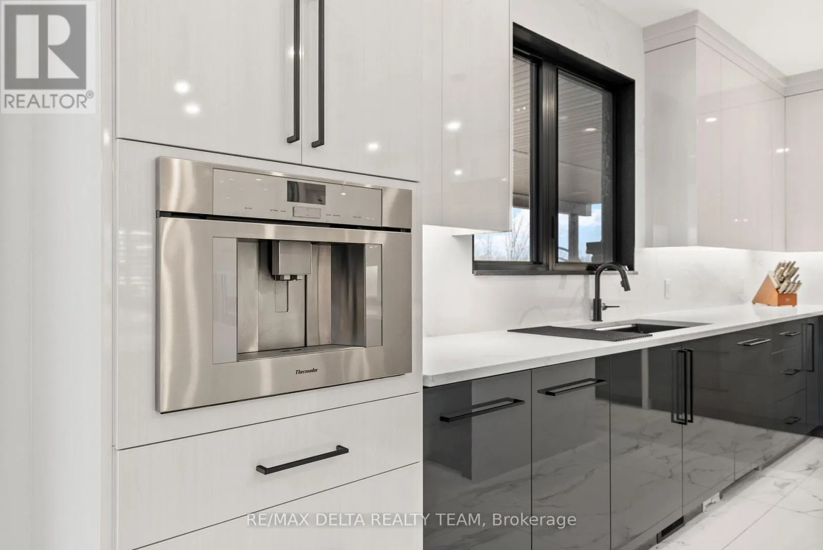 Albion Rd & Mitch Owens Dr. Tailored for the executive lifestyle, perfected for family living. Welcome to 663 Ballycastle Crescent a showstopping modern residence with commanding curb appeal, set on a quiet crescent lined with prestigious homes and backing onto peaceful open space. With over 5,700 sq. ft. of refined living space, this 5-bedroom, 6-bathroom home is a true architectural statement. The exterior offers bold, clean lines and grand scale, while inside, elegance meets innovation. Soaring 20-foot ceilings and a dramatic open-riser staircase set the tone in the main living area anchored by a double-sided porcelain-wrapped fireplace and lighted artwork niches. Maple and leather-finished porcelain floors run throughout the main level. The kitchen is both luxurious and functional, with dual waterfall quartz islands, Thermador appliances, a walk-in pantry, and a striking glass wine feature. A spacious main floor suite with walk-in closet and ensuite offers flexible comfort for guests or extended family. Upstairs, an 830 sq. ft. loft overlooks the great room, connecting two bedrooms each with private ensuites and walk-ins plus a bar area. The 540 sq. ft. primary suite offers a stunning gas fireplace, a dream walk-in closet with quartz island and a spa-inspired ensuite with freestanding tub, porcelain finishes, and custom-lit glass shower with rain heads and jets. The lower level features radiant-heated floors, a fireplace lounge, wet bar, theater, fifth bedroom and full bath, and a 900 sq. ft. commercial-grade gym with mirrors and glass dividers. Built-in media and smart systems run throughout. A 1,200 sq. ft. triple garage offers an oversized bay, loft storage, and backyard access. Two expansive decks add outdoor living space. Minutes from the new Hard Rock Casino and surrounded by luxury. This is a home that makes a statement. (id:27476)