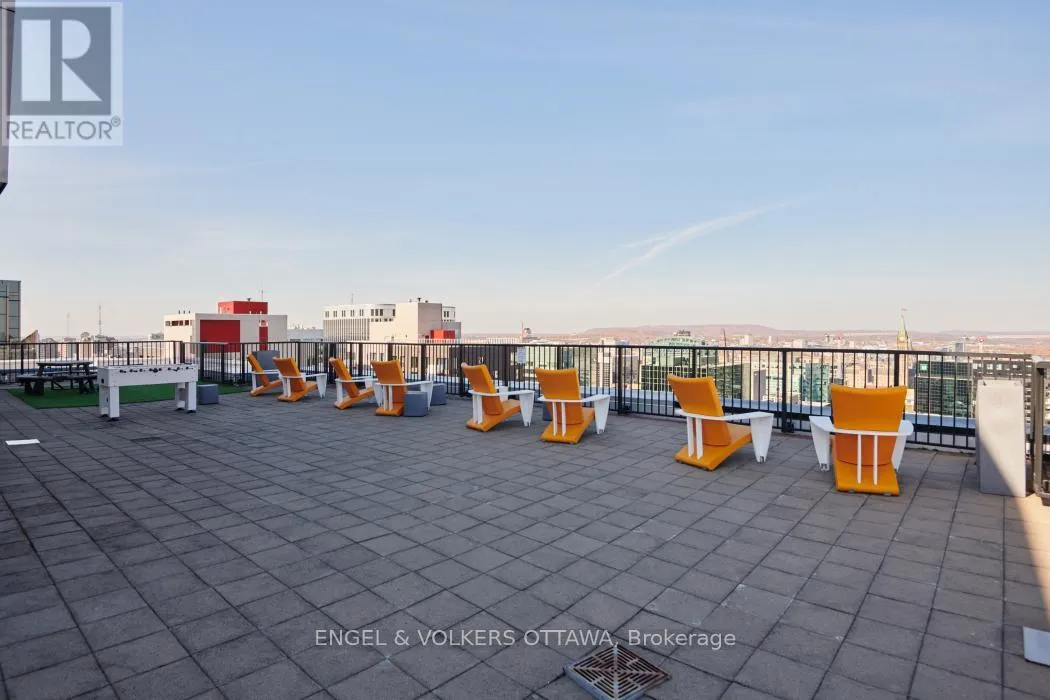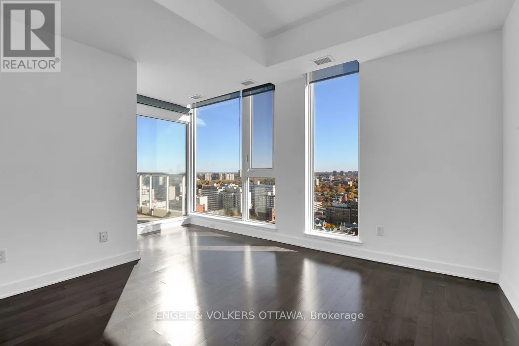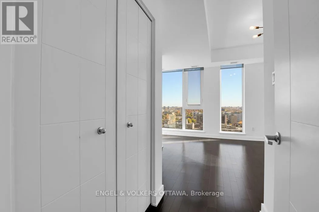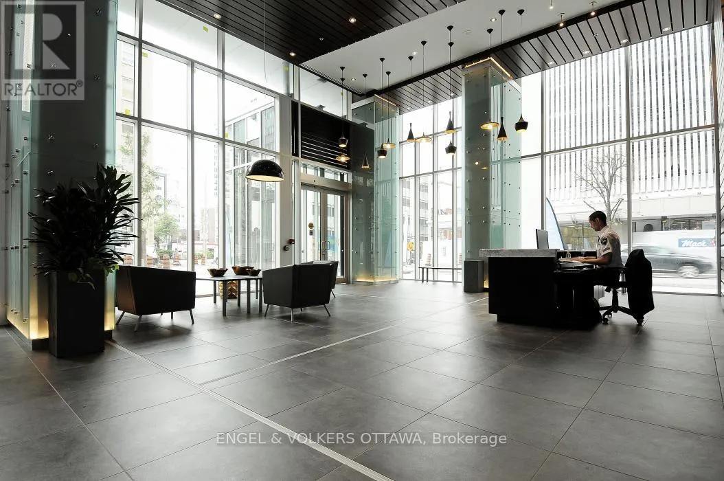 Cross Streets: Metcalfe St & Nepean St. ** Directions: From Elgin St toward Nepean St, turn right onto Lisgar St. Luxurious 1-bedroom + den CORNER unit, spanning 805 sq. ft.-one of the largest 1 bed. floor plans in its collection. This sophisticated residenceoffers an open-concept layout with floor-to-ceiling windows that provide million-dollar, unobstructed downtown views from the 20th floor. Thecustom kitchen is equipped with granite countertops, a beautiful new backsplash, and elegant white cabinetry. Sliding doors open to a privatebalcony, perfect for enjoying the city scape. The versatile office/den area is conveniently located to the right of the kitchen. The large primarybedroom boasts a corner window and a dedicated study area. Additional features include in-suite laundry (2024), custom roller blinds (2025),hardwood floors, and updated light fixtures throughout the unit. A parking space and storage locker are also included. Residents will enjoy anarray of amenities, including a 24-hour concierge/security service, a guest suite, a terrace, an outdoor patio with BBQs, an indoor pool, a gym,and a conference room. For ultimate convenience, Farm Boy is located on the ground level, with amazing restaurants and an LCBO just stepsaway. The building offers quick access to Parliament Hill, Rideau Centre, the University of Ottawa, and the Financial District. (id:27476)