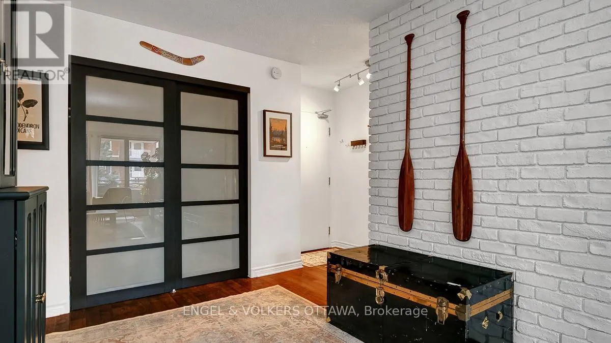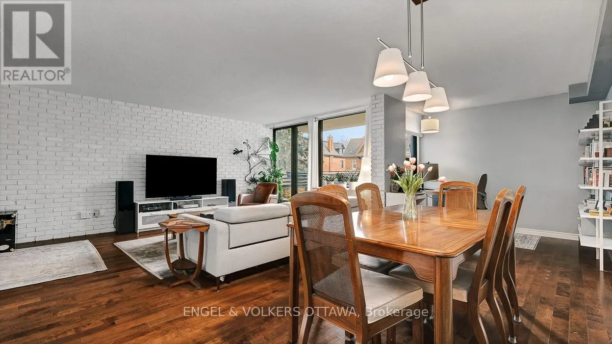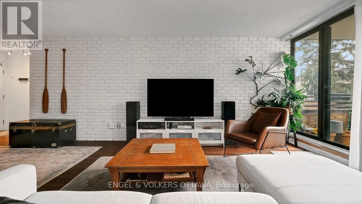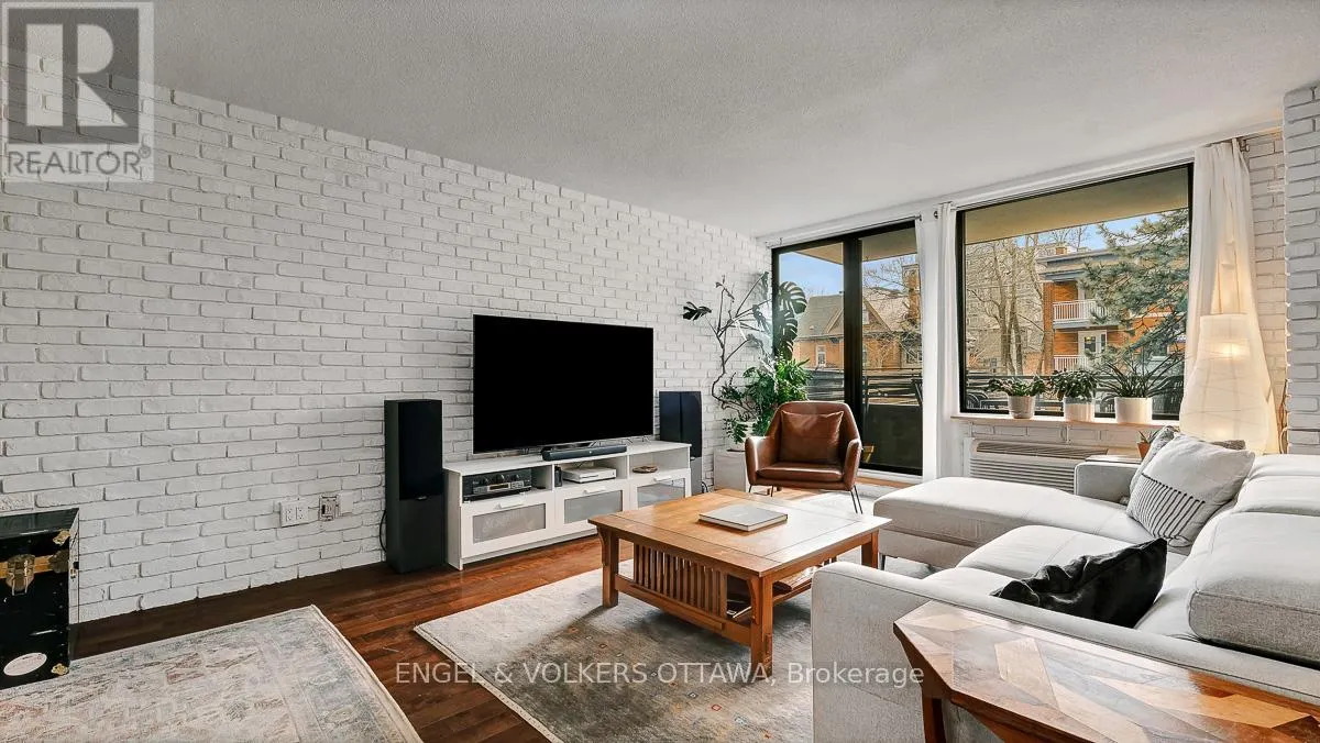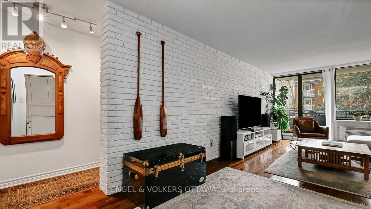 Cross Streets: Elgin and Somerset. ** Directions: Elgin to East on Somerset. Welcome to this bright and inviting two bedroom plus den unit in a highly sought after building, perfectly positioned in the heart of the Golden Triangle. Offering a blend of comfort and style, this centrally located home places you just moments from the Rideau Canal, the Parliament Buildings, and the vibrant shops and restaurants along Elgin Street.Inside, you will find hardwood flooring throughout, enhancing the warmth and character of the space. The renovated kitchen and updated main bathroom bring a fresh, modern feel, while the striking brick wall adds a contemporary design element that truly stands out. Large windows fill the unit with natural light, creating a sunny and uplifting atmosphere.The versatile den offers the perfect space for a home office or reading nook. Two private balconies provide added outdoor enjoyment, ideal for morning coffee or unwinding at the end of the day.With a functional layout, stylish updates, and an unbeatable central location, this home is ideal for those seeking an urban lifestyle. Flexible closing available. Locker and underground parking included. (id:27476)