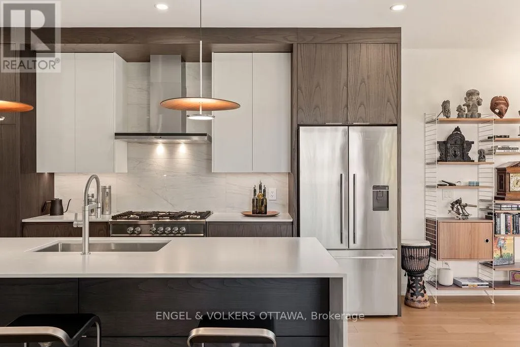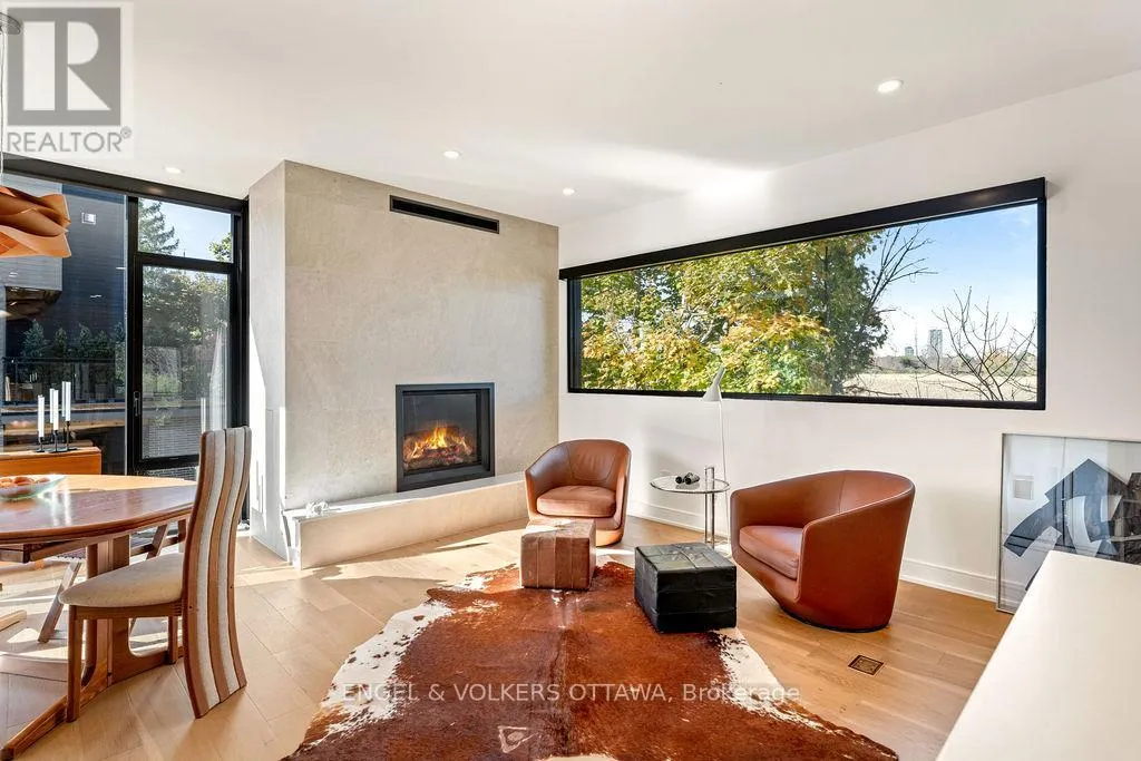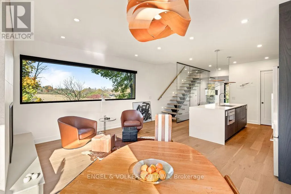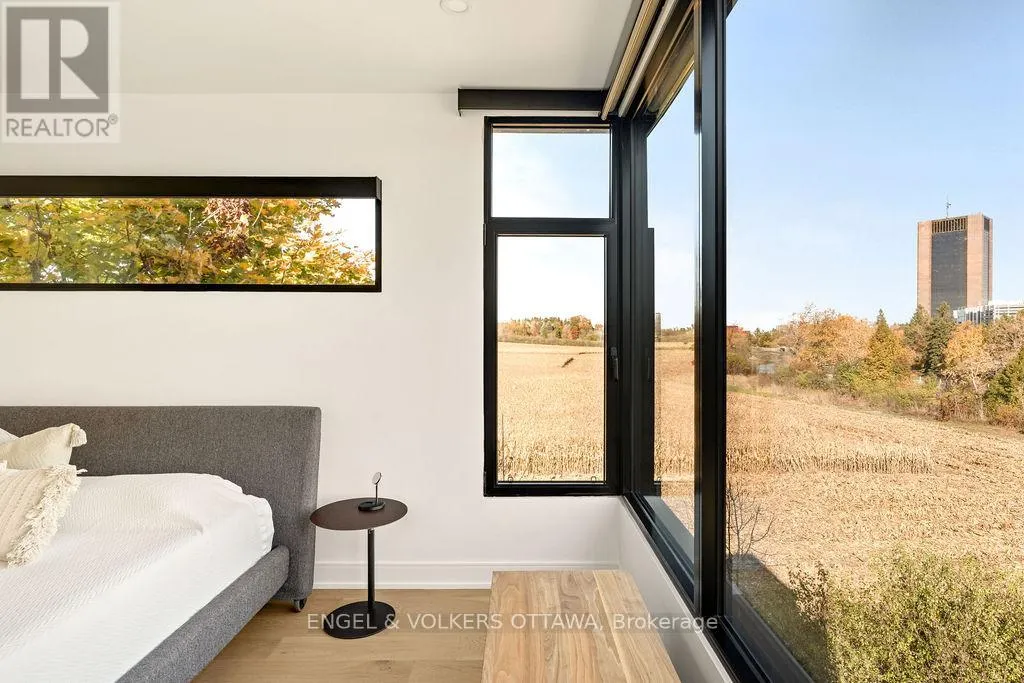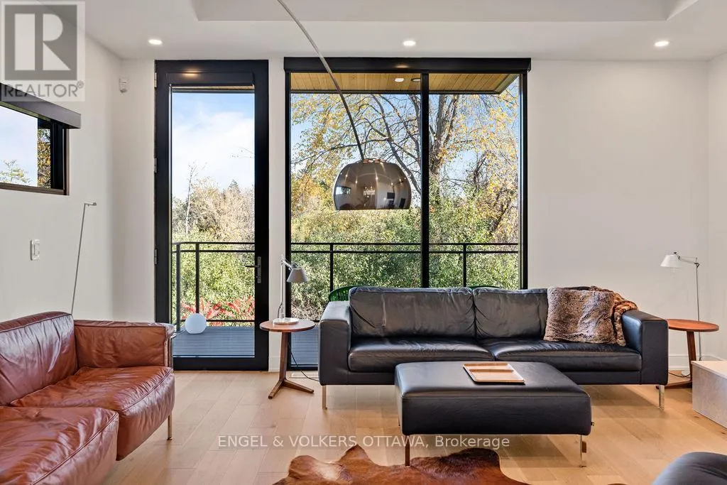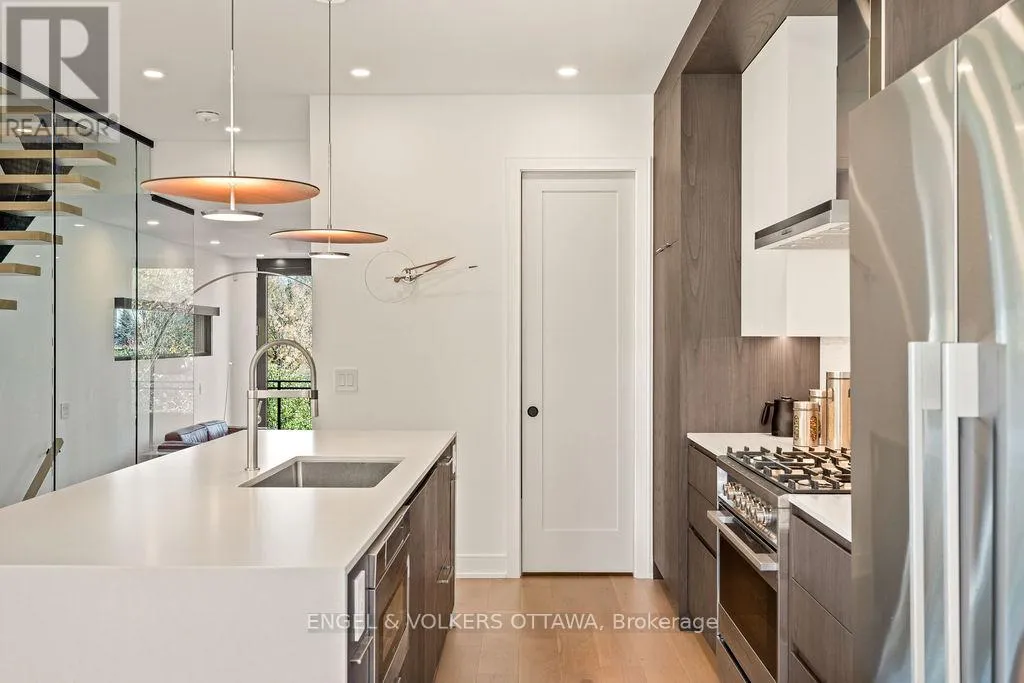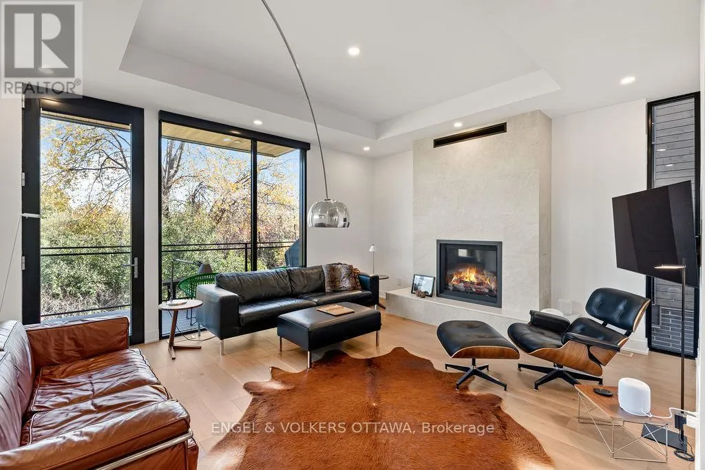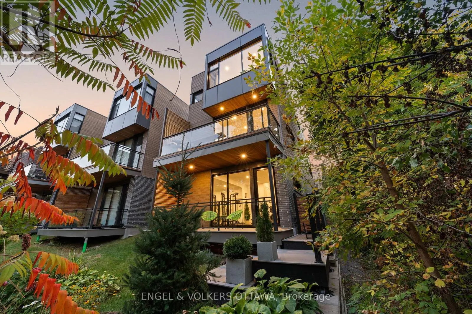 Cross Streets: Prince of Wales Dr. ** Directions: Prince of Wales to Peridot. Welcome home to this excquisite residence in a private enclave of just seven luxury homes, moments to Dow's Lake, Little Italy, Civic Hospital and CarletonU. The only home in the community featuring an extended private driveway and back deck, as well as incredible additional custom windows offering rare, unobstructed views of the Experimental Farm and the Rideau Canal. Winner of a GOHBA award for interior design, this 3-bedroom, 4-bathroom home showcases over 2,400 sq. ft. of thoughtfully curated living space. The main level is perfect for entertaining in style, featuring a chef's kitchen with a waterfall quartz island, custom cabinetry, gas range, walk-in pantry with sink, and designer finishes. Two elegant living areas with upgraded gas fireplaces and a sleek powder room complete the space. Amazing views from every room and private balcony off the back living room with a natural gas BBQ hook-up. Upstairs, the serene primary suite impresses with expansive windows and a spa-inspired ensuite with a soaker tub, expanded two-person glass shower, double vanity, and bidet. Two additional bedrooms, a full bath, and a laundry closet with a sink and custom cabinetry provide flexibility for guests or a home office. Ground level features a spacious foyer and a versatile area currently used as a gym, easily adaptable as a family room or office, along with a convenient powder room. Upgraded stringer staircase with open glass panels adds a striking architectural element while preserving the home's airy, contemporary feel. An extended lower back deck provides direct access to a beautifully landscaped backyard - offering a peaceful retreat surrounded by nature. Visit the website for full list of upgrades. Monthly association fee of $403 covers snow removal, maintenance and repairs of the private road. (id:27476)