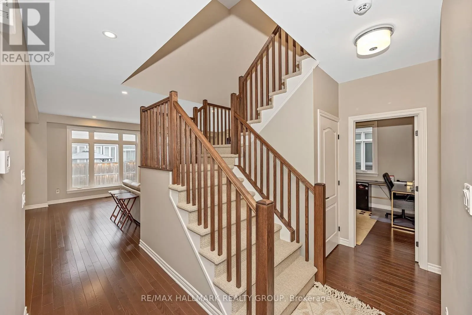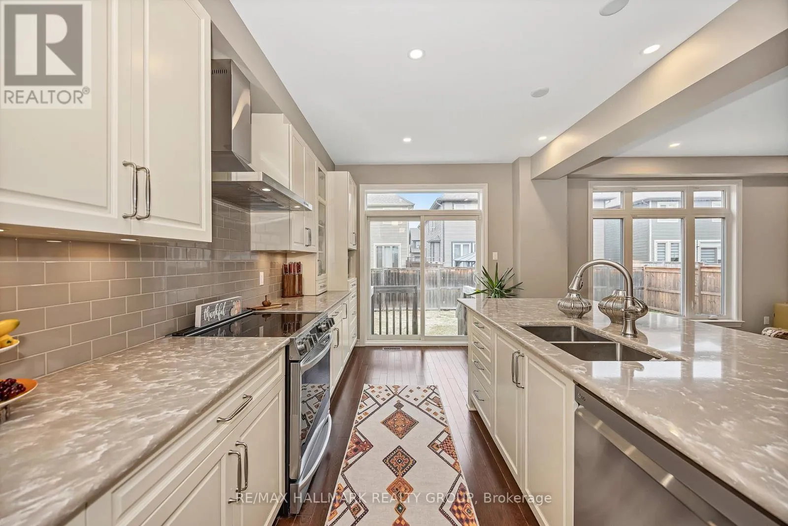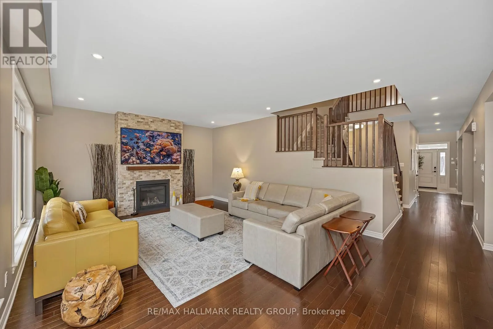 Cross Streets: Leitrim and Kelly Farm. ** Directions: Leitrim road to Kelly farm Dr to Trollius Way. Welcome to this beautifully upgraded 4-bedroom home in the desirable community of Findlay Creek, offering the perfect blend of modern style and warm, inviting living. Featuring a bright open-concept layout with high ceilings and hardwood flooring throughout the main level, this home is designed for both everyday comfort and effortless entertaining. The chef-inspired kitchen showcases custom Muskoka cabinetry, quartz countertops, an extended island, and high end LG smart appliances, all complemented by a convenient butler's pantry. The spacious family room is highlighted by a stunning stone fireplace wall with a remote-controlled fireplace and enhanced by pot lights throughout. Just off the living space, a main floor den/office provides the ideal spot to work from home in comfort and privacy. Upstairs offers four generous bedrooms, including two with private ensuites and walk-in closets. The primary suite features a luxurious 5-piece ensuite with dual sinks, a large soaker tub, and a separate shower. All bathrooms are beautifully finished with quartz countertops and custom cabinetry. Enjoy the added convenience of a spacious second-floor laundry room with built-in cabinetry and smart appliances. The large fenced-in yard offers ample space for the kids to run around and play with the family pet! Still covered under Tarion Warranty! (id:27476)