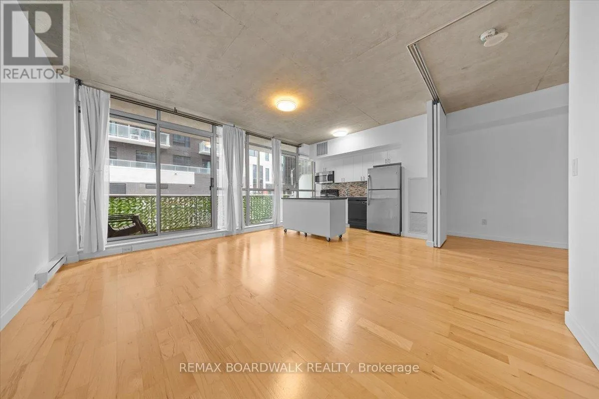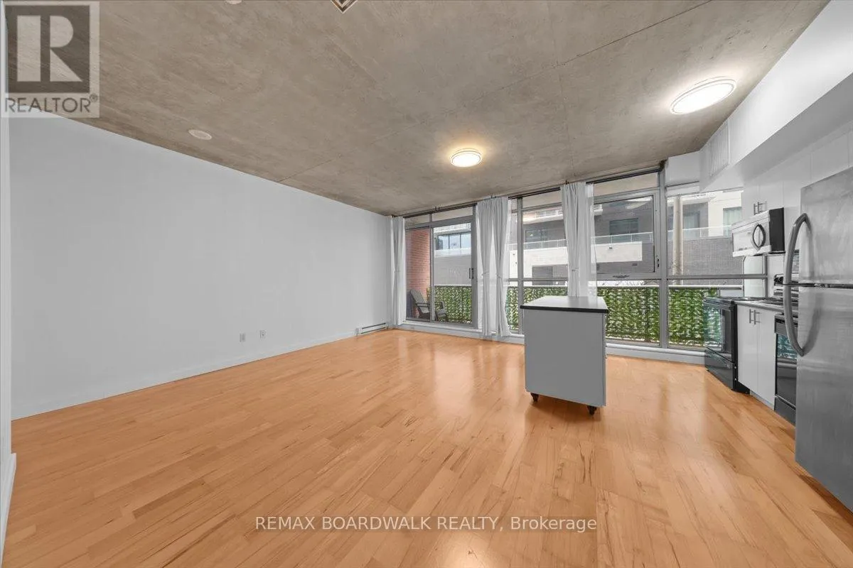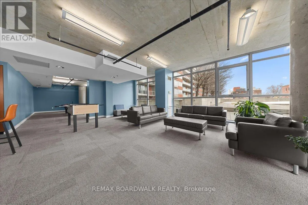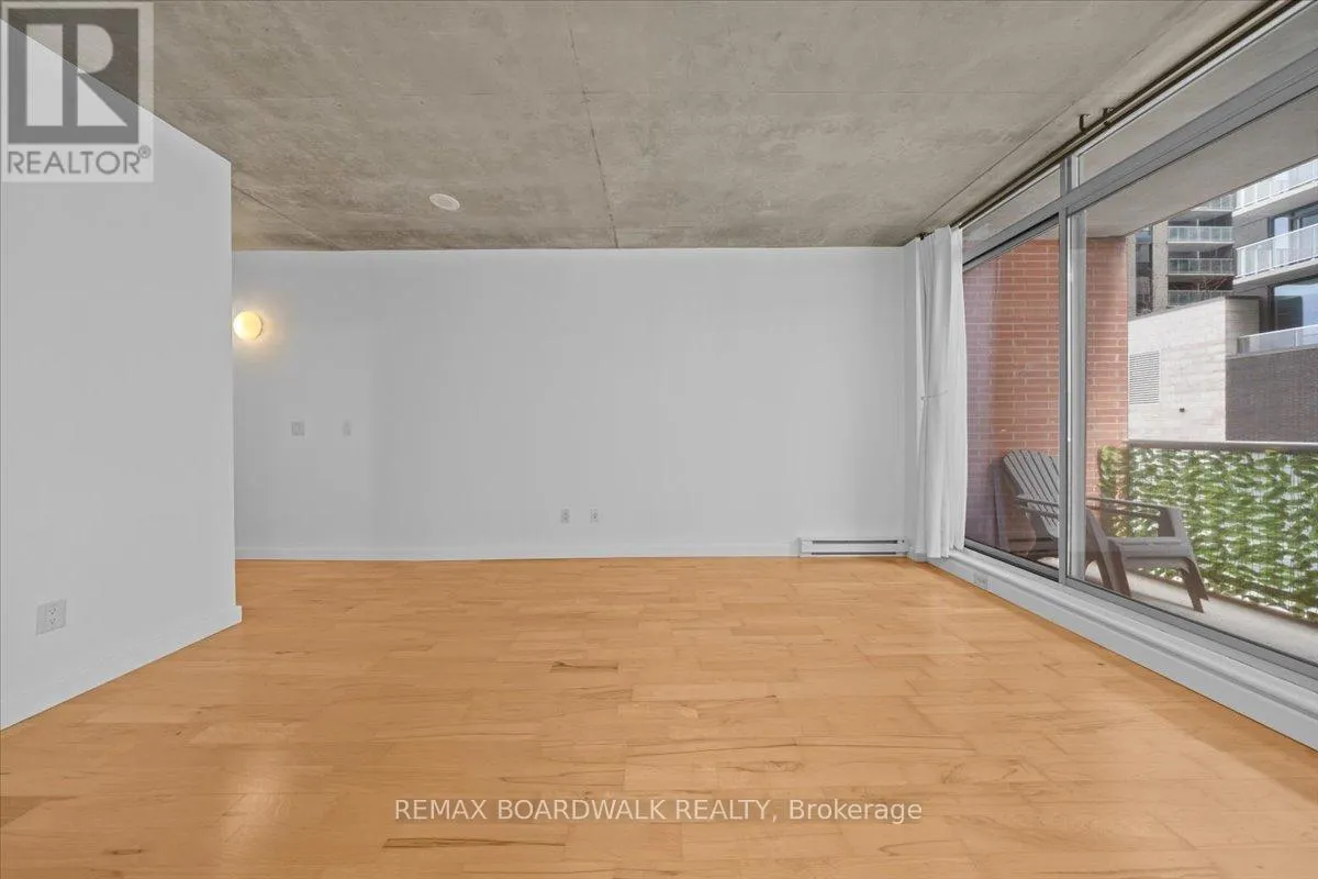 Cross Streets: Byward Market. ** Directions: Corner of George and Cumberland. Turn-Key living opportunity w/ concierge building service. Loft-style 1bdrm unit with high ceilings and exposed concrete, showcasing a modern-industrial feel. (4-piece) bathroom nearing the entry of the unit. Floor to ceiling windows, inviting light into the open concept kitchen and dining, maximizing usable space. Hardwood throughout. South-facing balcony. Modern living with low maintenance. Amenities: Equipped Gym, Party Room, Outdoor Terrace w/ BBQ area, 30+ underground visitor parking, concierge. Located in the Byward Market nearing Restaurants, pubs & cafes, Rideau Center, Universities, LRT, Parliament, Major Hill Park. Perfect for professionals or students. Opportunity to live in downtown Ottawa for less than renting options. In-Unit Laundry + A Storage Locker. Major utilities are bundled into the condo fees (heat, hydro, water, sewer, building insurance) simplifying ownership and budgeting. 48 Hour Irrevocable on Offers (id:27476)