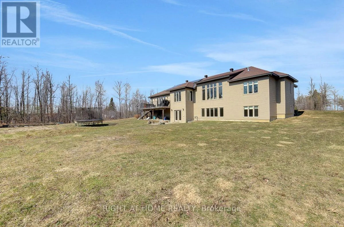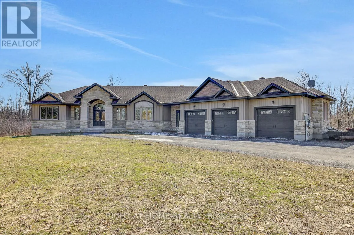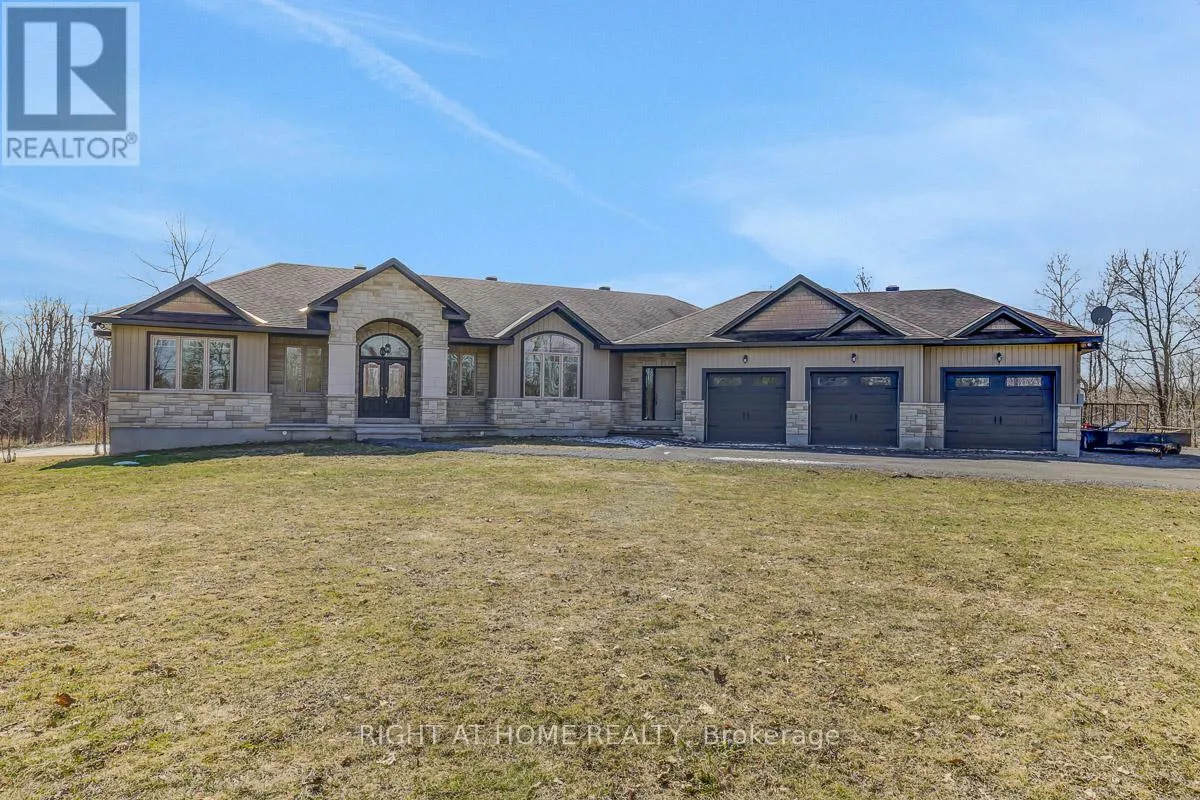 Stittsville Main Street to Flewellyn Open House Sunday April 19th 1-3pm. One of a kind custom built bungalow with finished walkout lower level located on a treed 3 acre lot with pond just minutes from City! Features & upgrades too numerous to mention. Open concept design, hardwood & tile flooring on main floor, hardwood stairs with decorative iron spindles to lower level, plenty of natural light with large windows throughout, impressive formal entrance with decorative ceiling & niche, 2nd front entrance to huge mudroom with plenty of storage space, access to triple car garage with 4th door to backyard, 2 auto garage door openers, powder room & built-in storage, beautiful living room with decorative ceiling & stoned propane fireplace, formal dining room with crown moulding & niche for hutch, spacious eat-in kitchen offers breakfast island, built-in appliances, gas cooktop, plenty of rich cabinetry, granite counters & wine rack, large laundry and butlers area with lots of cupboard and counter space, primary bedroom with tray ceiling, huge walk-in closet & elegant 5 piece ensuite with double sinks, private toilet area & glass enclosed shower, 2 additional good size bedrooms on main, big and bright finished walkout lower level offers foyer, family room with pellet stove, office, storage, kitchen area, games area, 2 big bedrooms & 3 Piece bath. Solar panel income, back up generator, electric car charger plug, sump pump, central vac canister & accessories plus 2 sweeps. Enjoy the peace and quiet of country living in this quality built estate home with the quick access to your City needs! (id:27476)