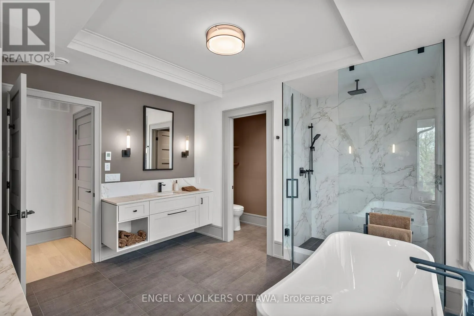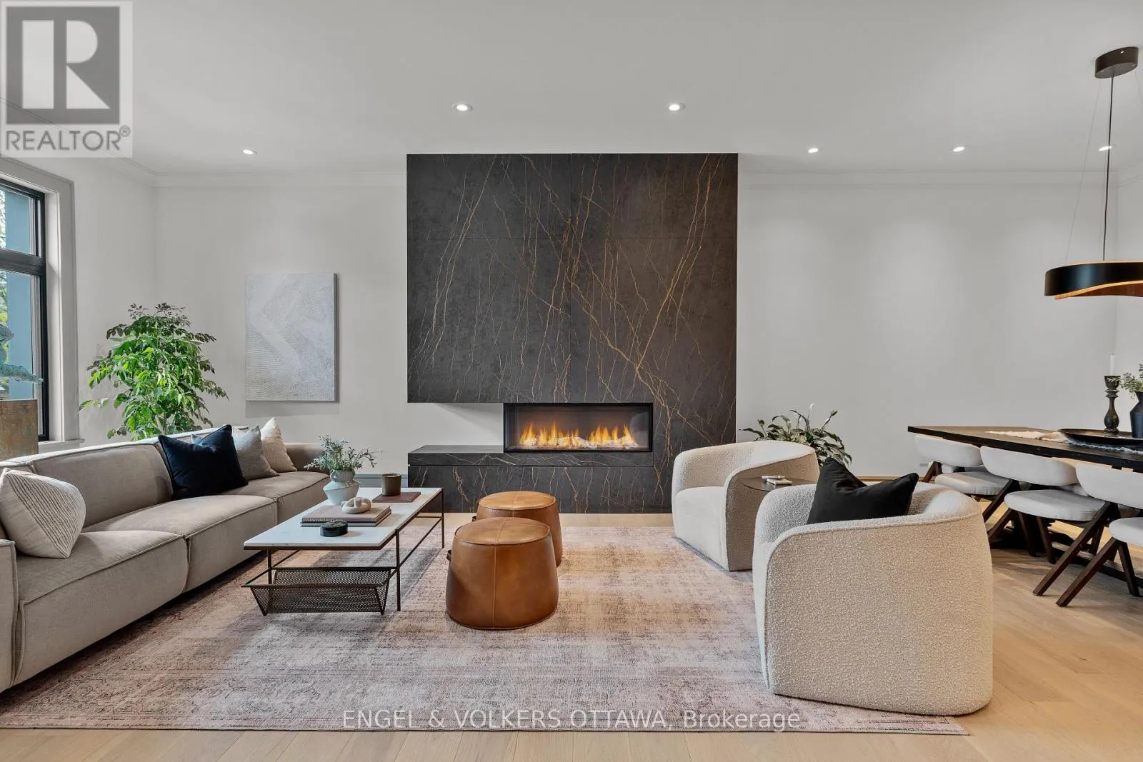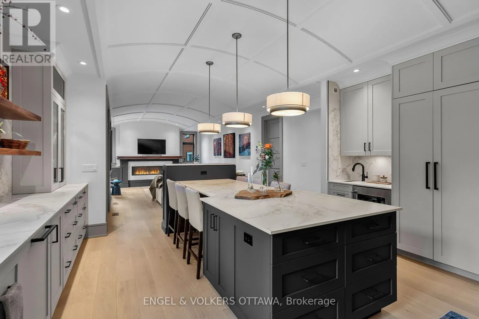 Cross Streets: Byron Ave/Clarendon Ave. ** Directions: From Wellington St W, turn onto Clarendon Ave. This high-quality, 3,500 sq. ft. custom home in the heart of Wellington Village is not only beautiful, the layout is functionally fabulous and features a rare double-height garage w/ reinforced floors, zoned HVAC and elevated ceiling heights. The entry is anchored by a dramatic 22 ft high foyer w/ custom walnut niche, walnut light fixtures, and heated porcelain floors that lead to an adjacent mudroom or the open-concept living & dining area featuring a floor-to-10-foot-ceiling-height fireplace clad in Dekton porcelain slabs & a custom staircase featuring walnut handrails and newel posts milled from a tree once on the property. At the heart of the home, a chef-inspired kitchen boasts a barrel-vaulted ceiling that extends thru to the connected family room, Dekton countertops & walls, 10 ft island, a beverage station & premium Fisher & Paykel appliances and an adjacent screened porch. Arriving at the second level, you're met w/ a 2nd barrel-vaulted ceiling, 9 ft high and four spacious bedrooms all with ensuite bathrooms & a nursery/office. The primary suite features his & hers walk-in closets & an ensuite w/ Dekton counters & shower surround, wood-accent shelving as with other bathrooms, & a free-standing tub. A well-appointed laundry room with a proper sink, quartz counters & ample storage. The lower level provides bonus living space w/ a sprawling recreation room w/ rough-in for a bar, a bedroom w/ an ensuite, a powder room, & heated flooring throughout. 8'-4" ceilings, w/ pot lighting & LVP wide-plank floors maintain the character of the home's upper levels. The remainder of flooring throughout the home is wide-plank, white oak engineered hardwood. The landscaped, fully fenced backyard includes an interlock patio, a cedar pergola-topped BBQ deck, defined garden beds & mature trees. Set on a tree-lined street in Wellington Village, this home is just steps from Elmdale Public School, Parkdale Market, and the shops, cafés, & restaurants of Wellington West & Westboro. (id:27476)