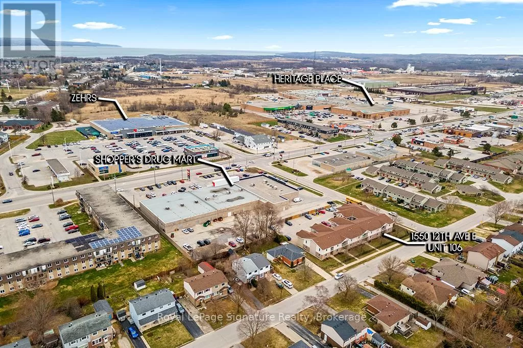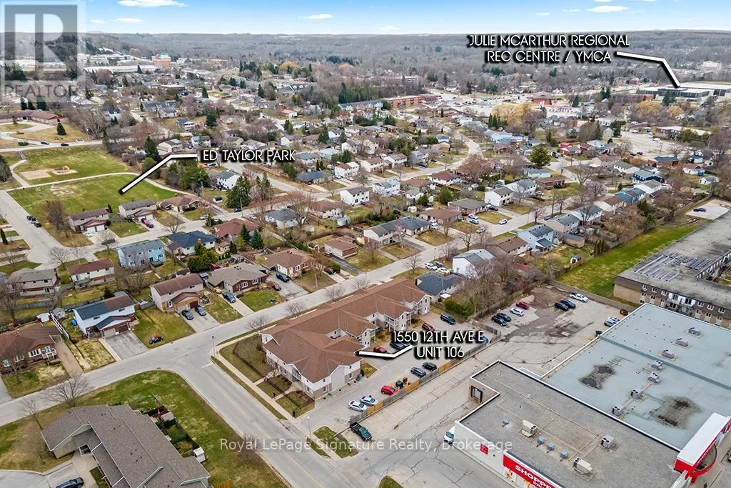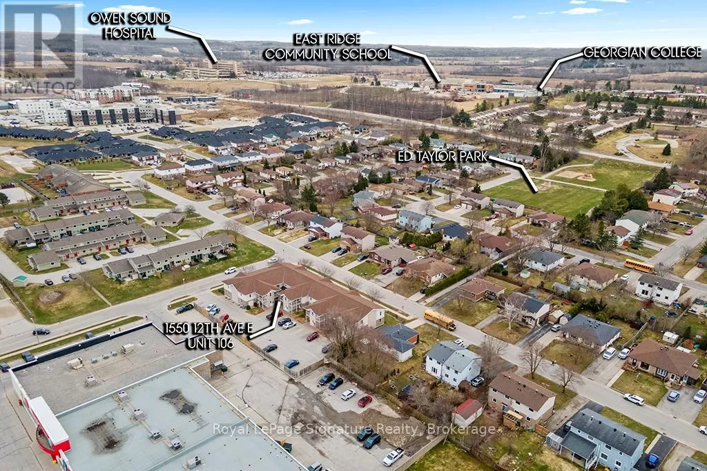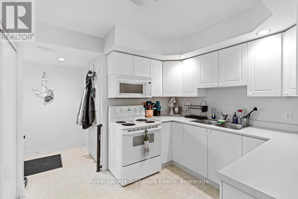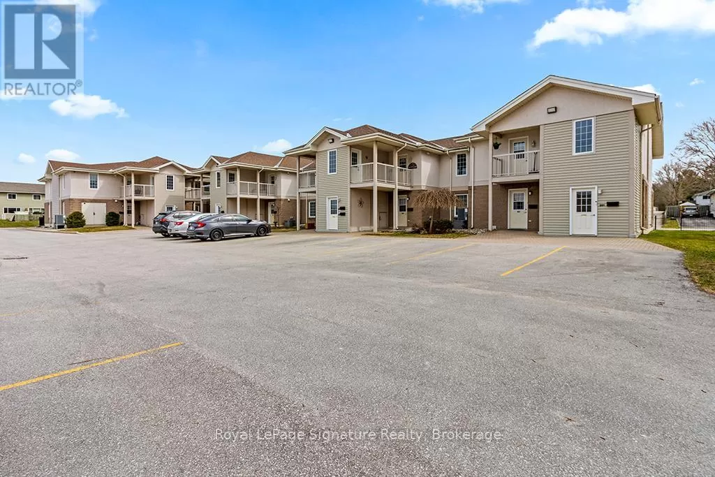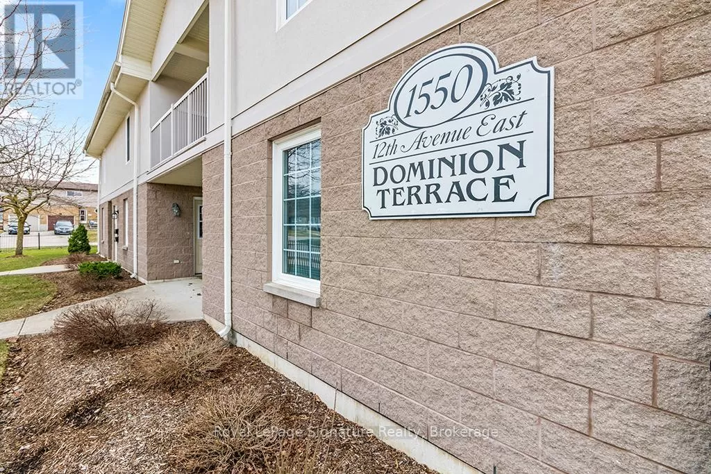 Cross Streets: 12th Ave E & 16th St E. ** Directions: Turn south onto 12 Avenue East from 16th St E (located behind Shoppers Drug Mart). AFFORDABLE LIVING with low condo fees in a convenient east side location. Welcome to Dominion Terrace! This ground-level, two-bedroom unit offers both a front entrance and direct access from the parking area making coming and going a breeze. Step inside to find a bright, open-concept living and dining space, complete with a white kitchen that provides plenty of cupboard storage and counter space. The in-suite laundry and generous storage area add to the everyday convenience. Enjoy your morning coffee or unwind in the afternoon on your outdoor patio. The spacious primary bedroom is large enough for a king sized bed & features a double closet, while the second bedroom easily adapts as a home office, guest room, or den with cupboards for additional storage. Economical condo fees, forced-air electric heating, and central air ensure comfort and affordability year-round. Located near grocery stores, restaurants, public transit, Georgian College, and the hospital, this condo is perfectly situated for retirees, busy professionals, or students. Don't miss this opportunity to enjoy low-maintenance living in a well-maintained building! (id:27476)