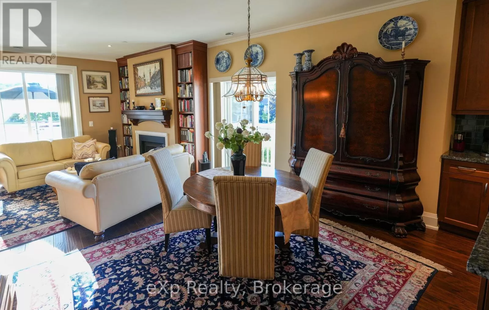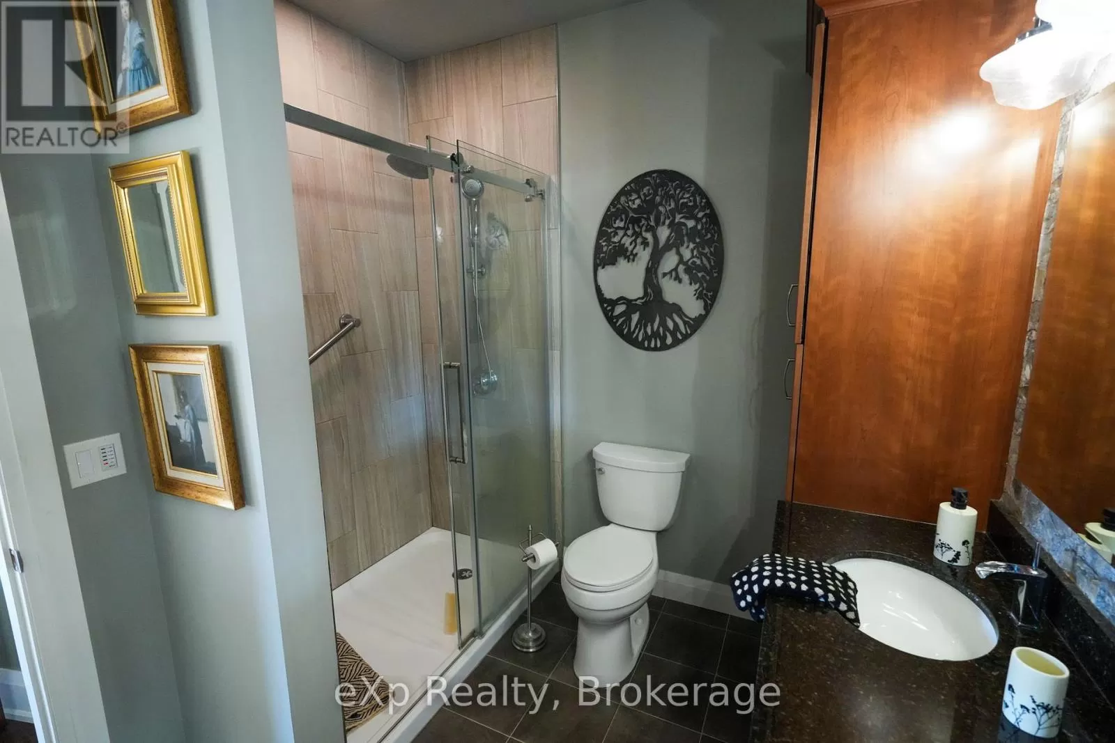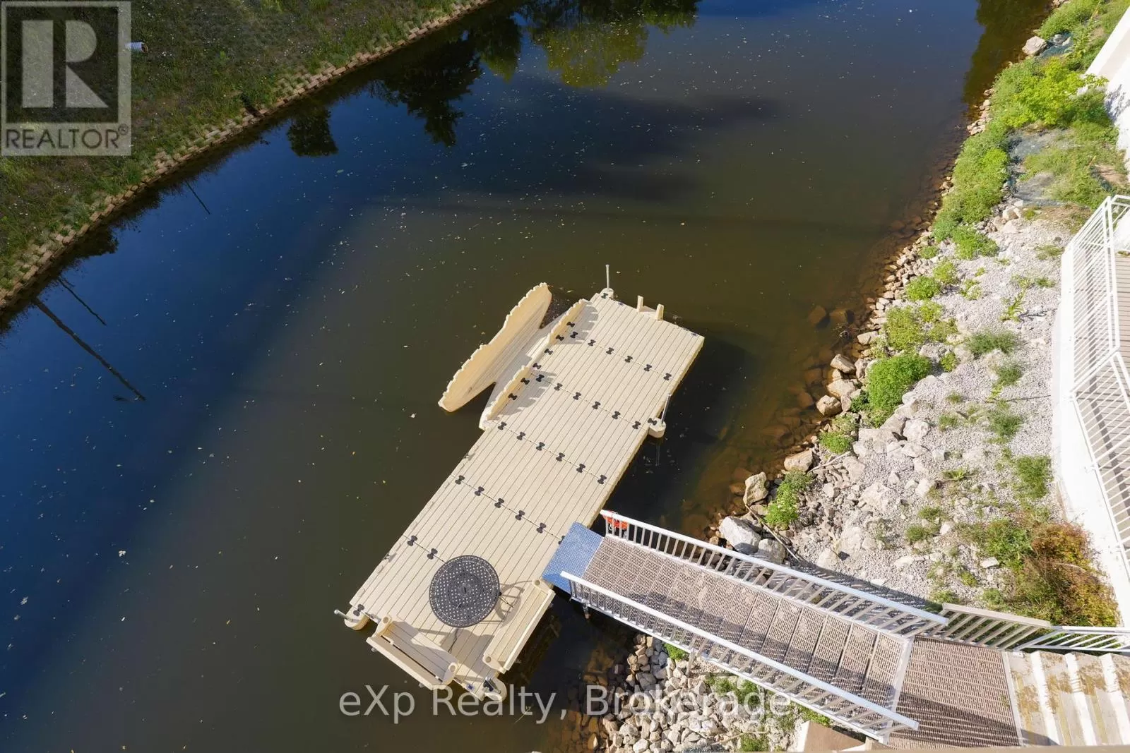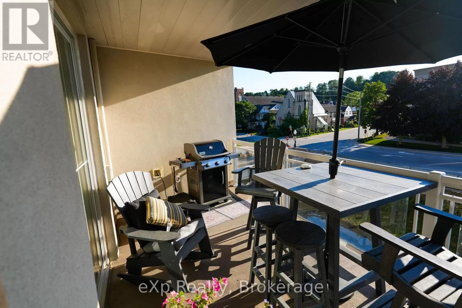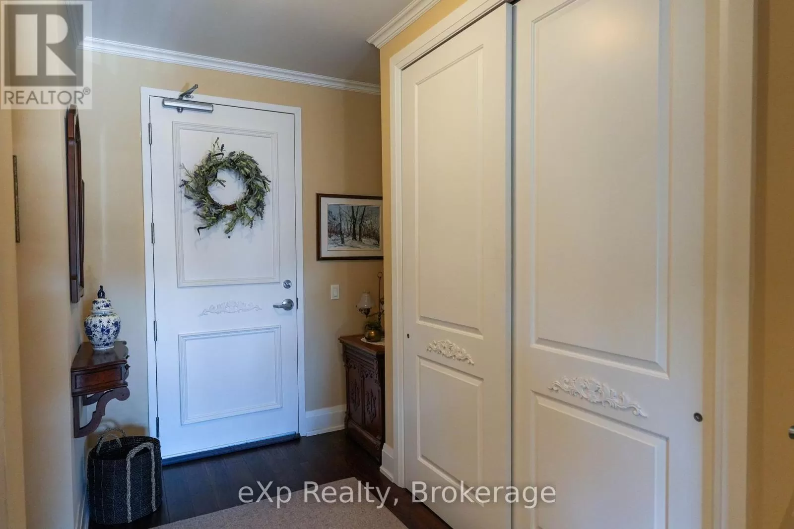 Cross Streets: 9th St E & 1st Ave E. ** Directions: Northwest corner of 9th St E and 1st Ave E. An exceptional residence in the heart of Owen Sound, this second-floor condominium is at once refined and comfortable. A private elevator opens directly into the home, setting a tone of distinction. The open-concept living, dining, and kitchen area is defined by hardwood floors, a soft, sophisticated palette, and crisp white trim. The kitchen is appointed with built-in appliances and quartz countertops, while the living room, with its gas fireplace framed by floor-to-ceiling bookshelves, extends to a broad balcony overlooking the Sydenham River.The primary suite features balcony access, a generous walk-in closet, and a private four-piece ensuite. At the opposite end of the home, the second bedroom, complete with its own walk-in closet and adjacent full bath, offers privacy for family or guests.The balcony spans the length of the residence, with room for dining, lounging, and entertaining while taking in uninterrupted river views. A second, smaller balcony off the dining area provides another unique vantage point. Residents also enjoy a kayak dock and storage, secure entry, and underground parking with an exclusive parking space (with EV hookup capability) and large storage locker.This preferred condominium building offers a highly walkable lifestyle, steps from the theatre, library, and the shops and restaurants of downtown Owen Sound. An elegant urban retreat with riverfront vistas. (id:27476)