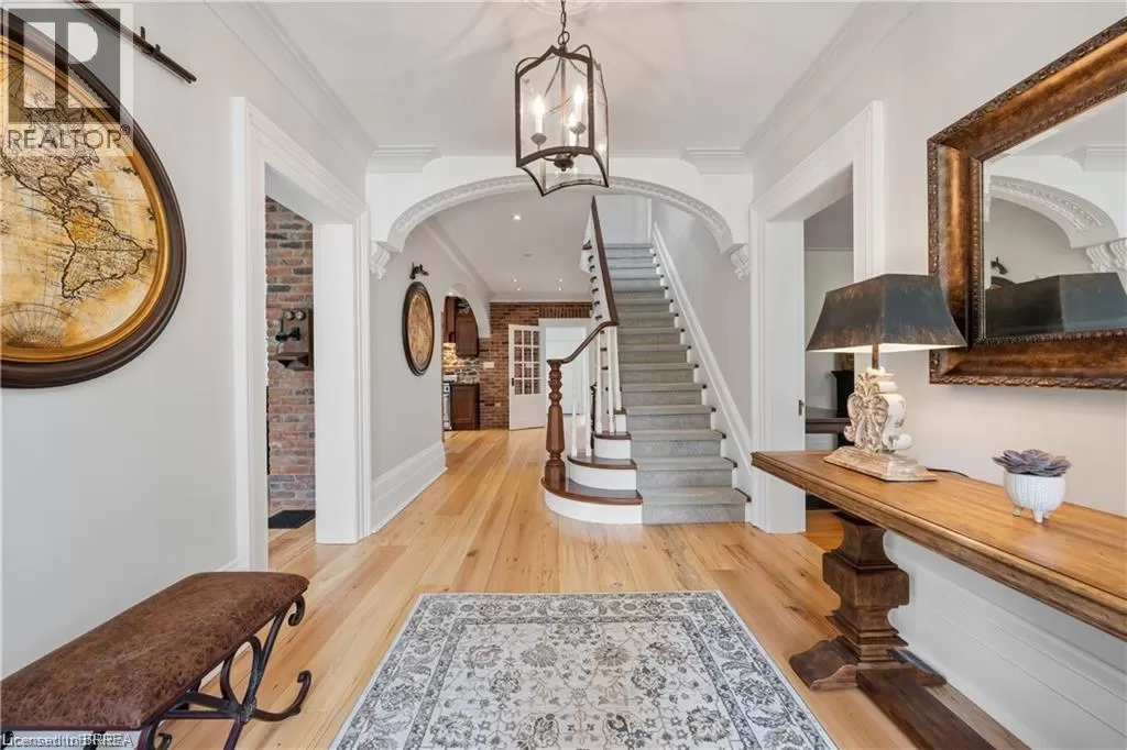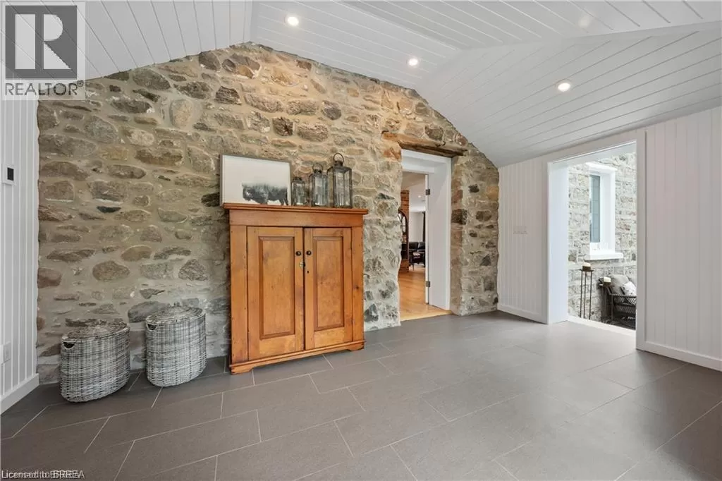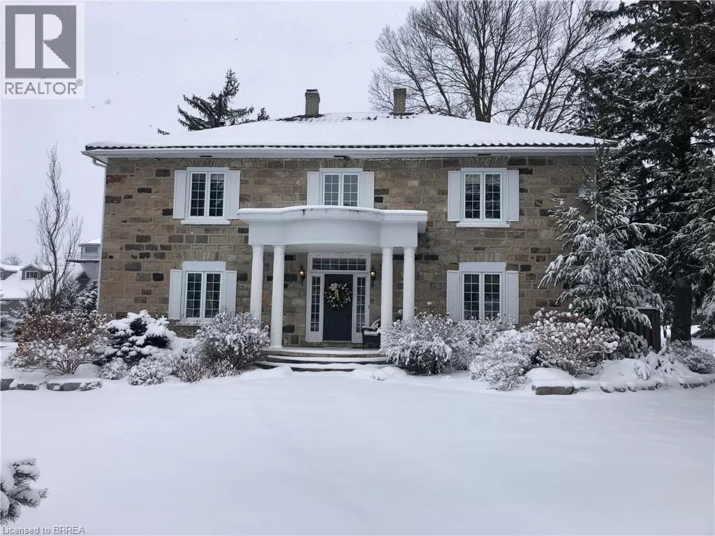 Take Green Lane north to the end. Turn right on East River Road, Approx one mile on the left side Here is your opportunity to own a piece of history on the Grand River in Paris, Ontario. This 2-story, Landmark, georgian style, original stone home is One of a Kind! Sitting on over 3 acres in a picture perfect setting. An abundance of trees creates natural privacy. This stately home features large windows deeply set within thick stone walls, open stone feature walls, large baseboards and original archways that highlight past workmanship. This home has had many renovations including upgraded attic insulation, newer furnace and water heater as well as updates and/or complete renovations to most rooms. Including two ensuites, the house has total 5 bathrooms. The home includes a finished basement with both inside and outside entries and has potential in-law capability. Bedrooms are large and two have ensuites. The open kitchen/living area has large island, reclaimed hardwood floors, propane wood stove and separate pantry. The added sunroom has its own heat and air conditioning as well as a wood burning stove. The home has total of 4 fireplaces. On hot days, enjoy a dip in the large inground swimming pool which is located off the custom built garage with upper living space. The garage easily fits 4 or more cars, has heat and a/c and features a large upper living space with 2 pc bath. This building could easily be converted to separate residence. Beyond this, a lane leads to the walking trail and river, with access to the water for fishing or canoeing. Poolhouse has its own 2 pc bath as well, and another storage shed also on the property. Abutting property, 7.6 acres with two large buildings, same owner, is also available if purchased in combination. (id:27476)