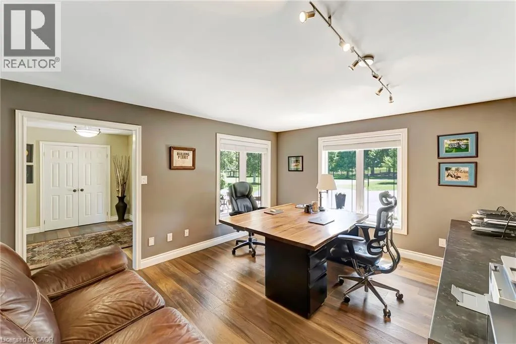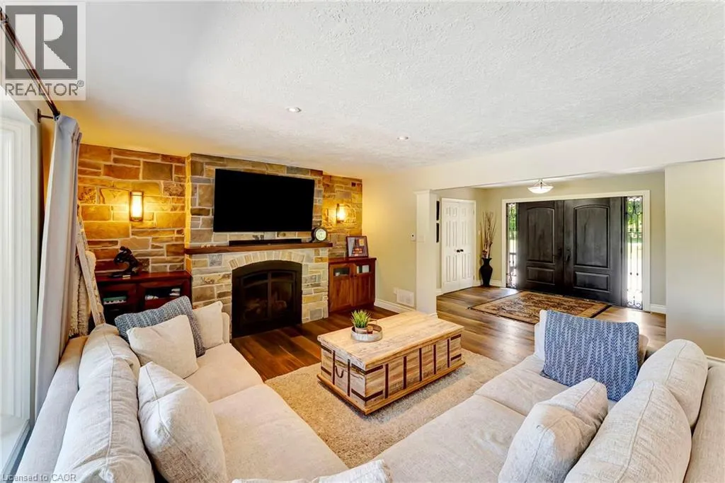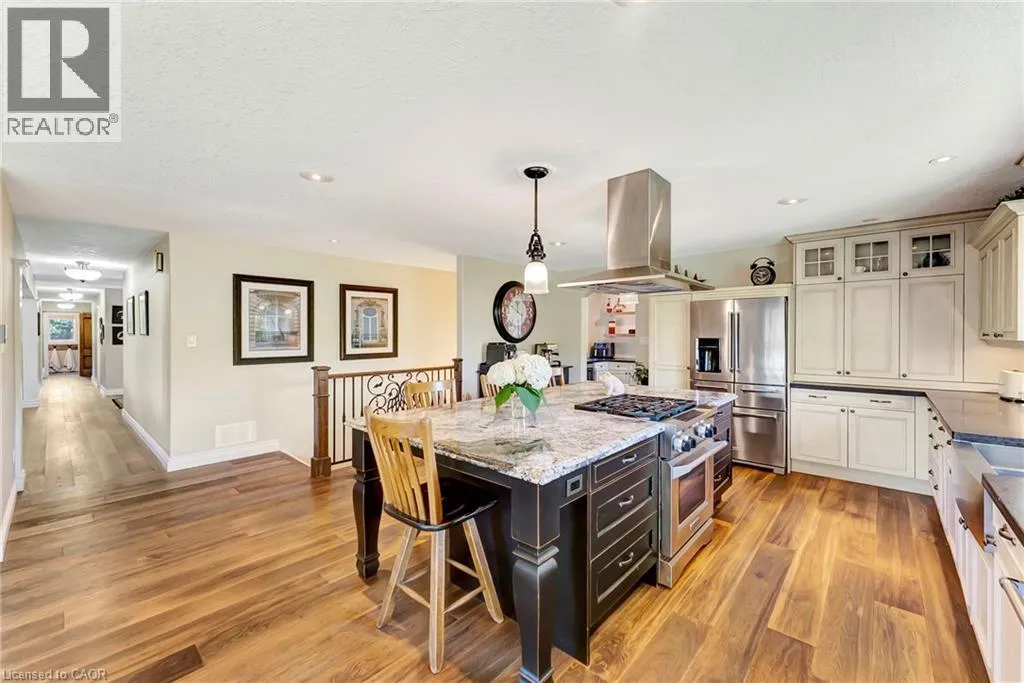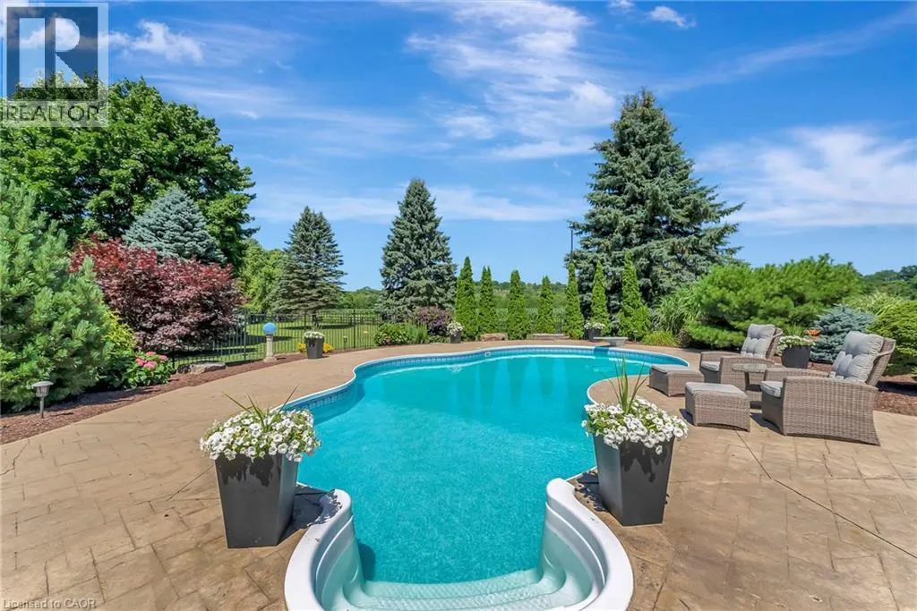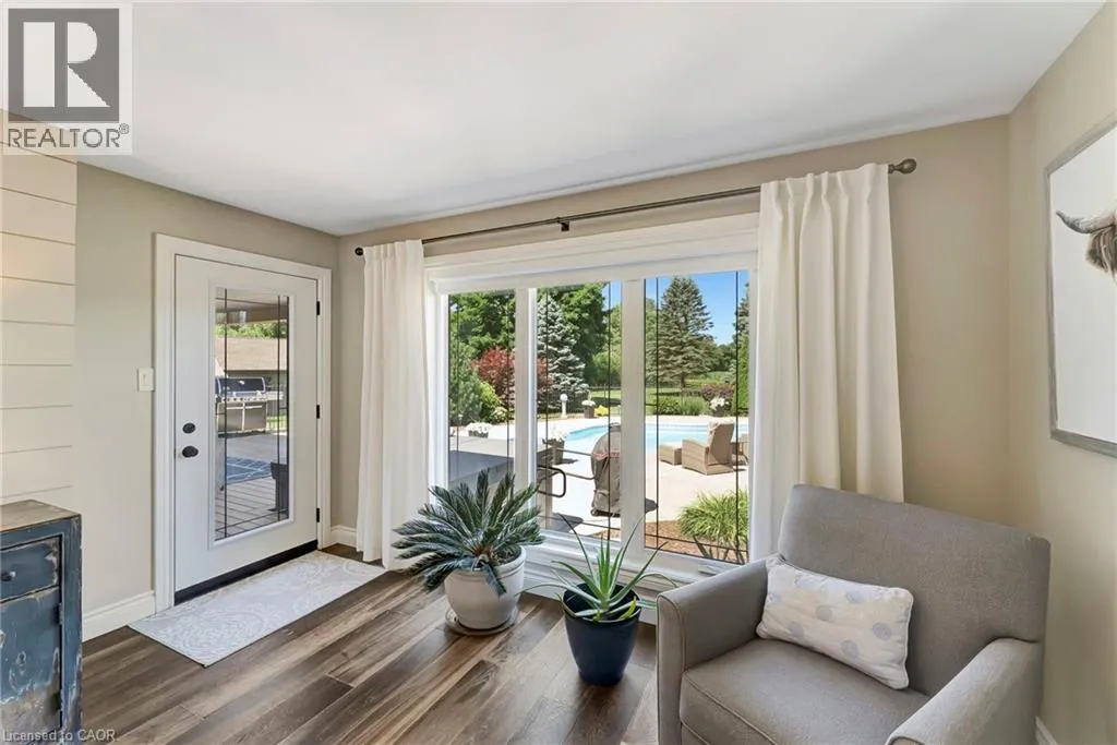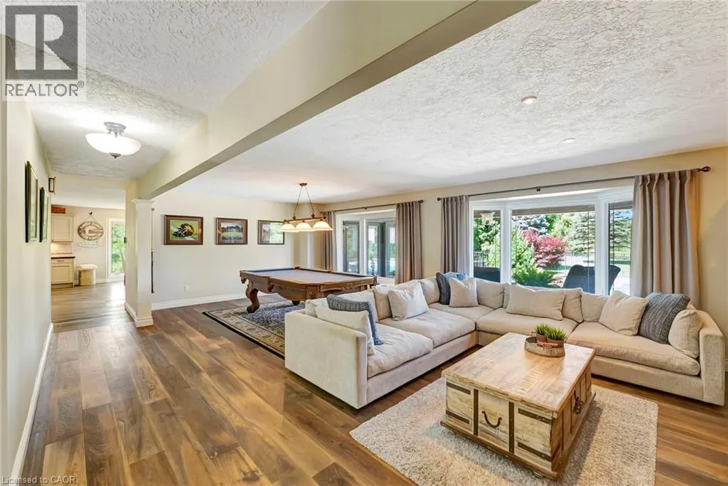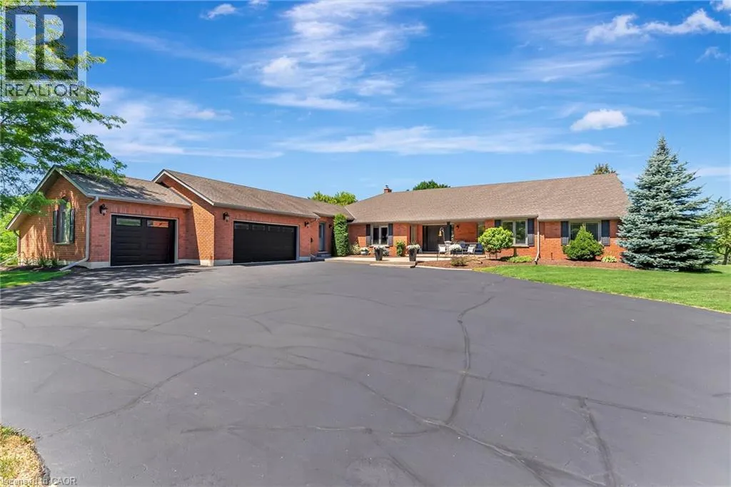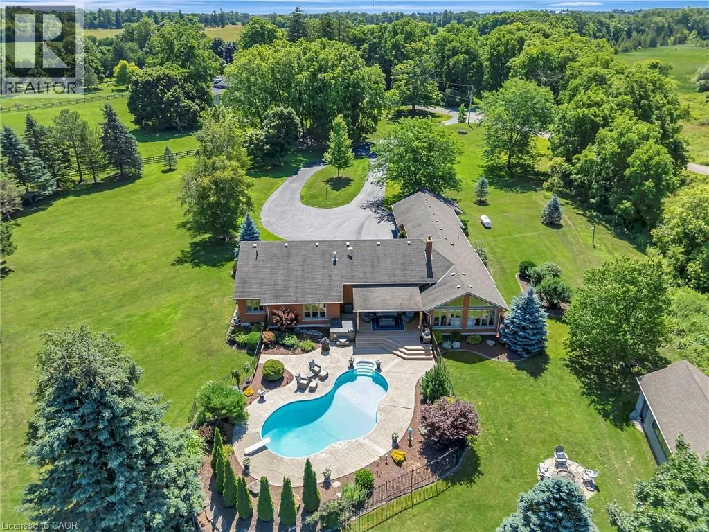 Trussler Road/Puttown Rd/Governors Road W Executive bungalow on 3.79 acres, located in a picturesque setting. The present owners have elevated this home with renovations & design choices to please the most discriminating Buyer. The custom bungalow offers over 3300 sq ft on the MF. The foyer opens to an inviting Greatroom with custom FP & views of the property, outdoor entertaining areas & pool...it really sets the stage for this tranquil setting. The kitchen area boasts a custom island with granite counters & seating, a gorgeous stone FP, oversized dining area & more great views of the private property... there is a designated bar area & a laundry room that will exceed all expectations. There is a 2pc bath in this wing as well as access to the 3 car garage. The oversized garage has a walkup from the lower level. The custom outbuilding offers good storage or retreat space! There is a bright & spacious den/sunroom off the kitchen with walkout to the covered patio & pool area. This room definitely exudes zen & will be a room you will want to unwind in & enjoy conversations -morning coffees & libations would surely find their way here as well. There is an attractive home office that offers a private space for those who work from home- another great room. The primary suite has a walkout to the hot tub area, two walk in closets & a bright custom ensuite featuring a stand alone tub, double sink vanity and oversized spa shower. You will love this ensuite. There is a newly renovated main bath and two generous bedrooms. The main floor boasts hand scraped hardwood floors & stone/tile floors in bath and kitchen areas. The lower level really showcases the size of this sprawling bungalow. There is a recroom area & flex space, a home gym & a spacious finished storage area with access to the walkup to the garage. There is approximately another 1800 sq ft of unfinished space to work with! Location allows good access to 403.. but the drawing card has to be this private location! Prepare to be impressed. (id:27476)