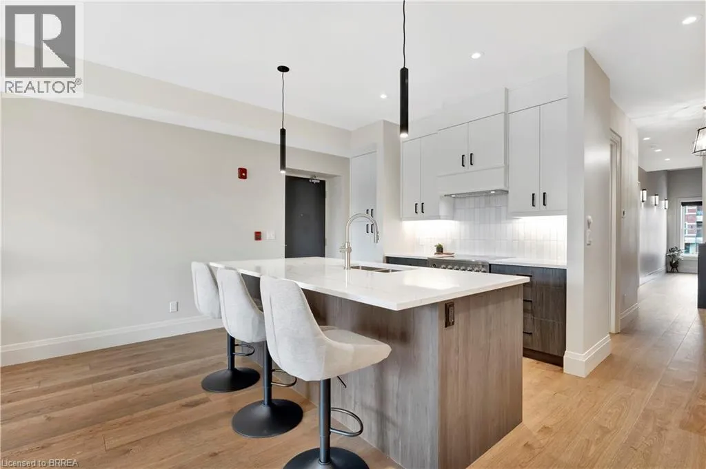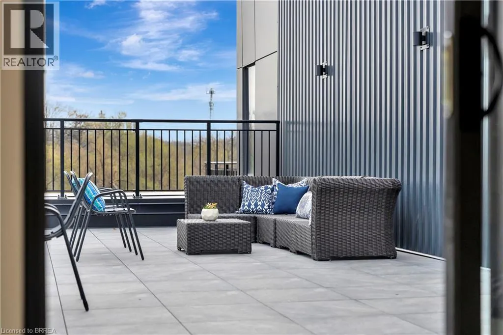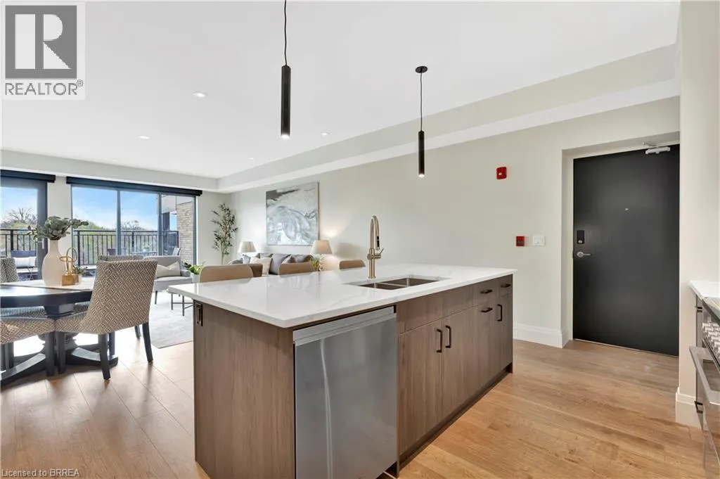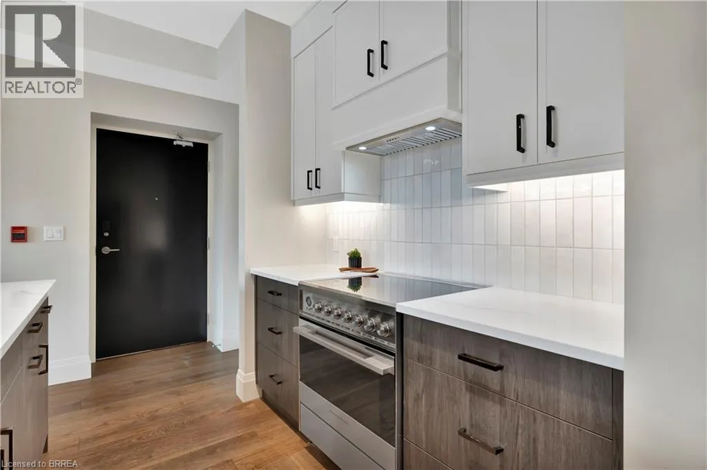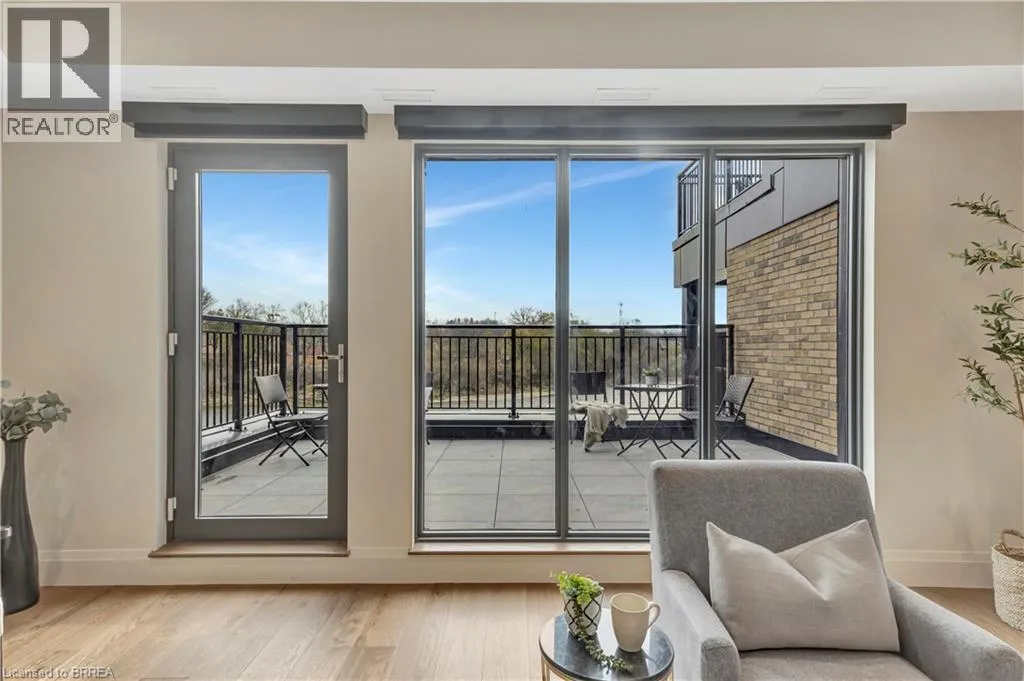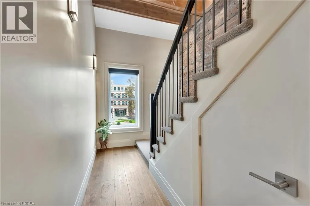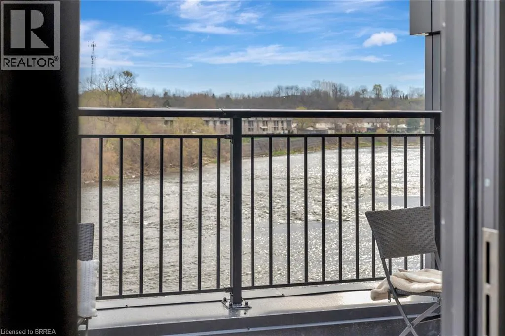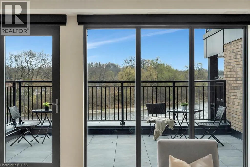 Downtown on Grand River St N across from the Cenotaph One of the most distinctive homes in the building, nicknamed The Townhome. This two-storey residence blends architectural character with contemporary design across 1,693 sq/ft of living space and over 800 sq/ft of private outdoor space. Showcasing original exposed brick and beam details, Unit 204 offers a unique sense of warmth and history while still delivering modern luxury. Wide plank hardwood flows through the main level, paired with a striking kitchen outfitted with Fisher & Paykel appliances, quartz countertops, and custom cabinetry. Both bathrooms feature spa-inspired finishes, including heated floors. The primary bedroom features a generous walk through closet and lovely bathroom, and a generous den on the 2nd level makes the perfect home office, sleeping space or second lounge. With elevator access from the second level and direct street-level entry (the only unit with this in the building), this unit lives like a private townhome. Two expansive riverside patiosâincluding one oversized terraceâoffer spectacular outdoor living and breathtaking views of the Grand River. The upper level terrace is roughed in for an outdoor kitchen, with Hot/Cold Water, Natural Gas and Electrical, while the main wall has been pre-wired for an electric awning. Included is a large storage locker and access to the resident only riverside patio perfect for casting a line or launching a canoe. (id:27476)