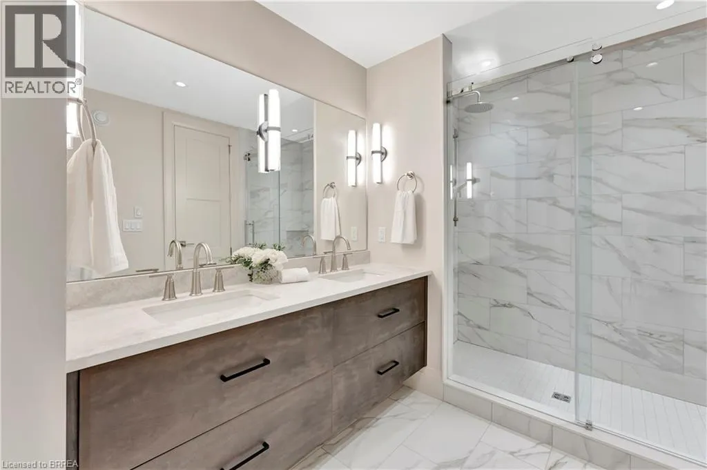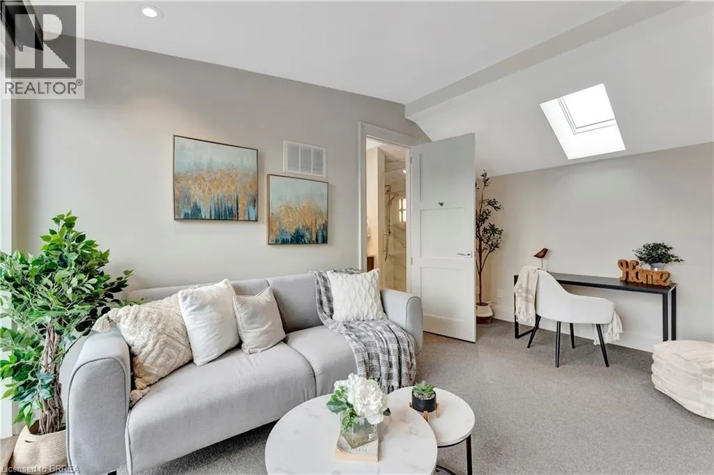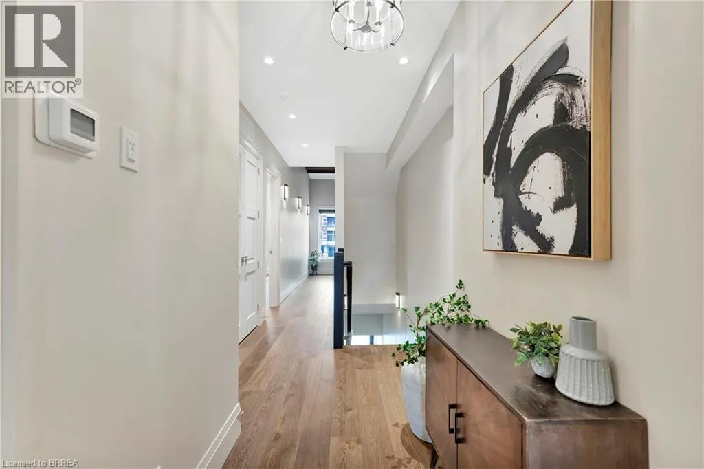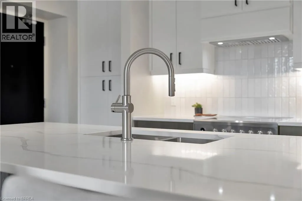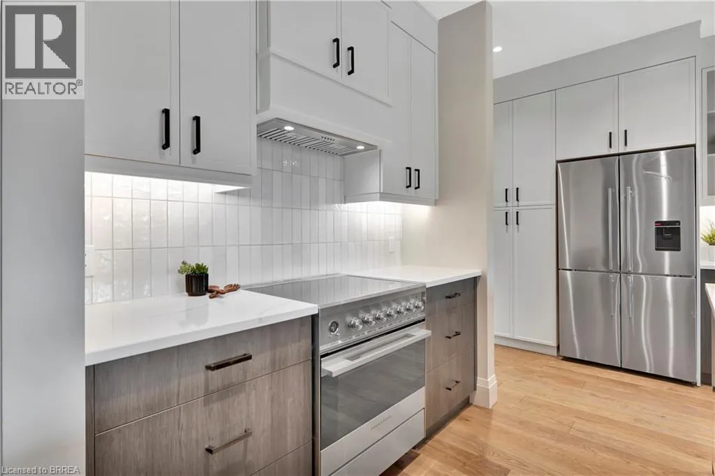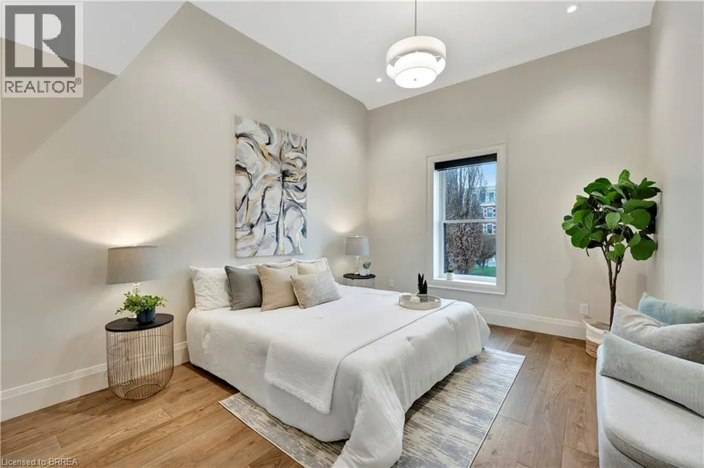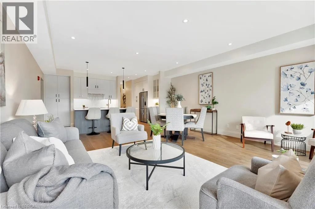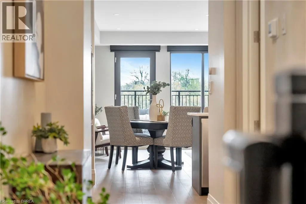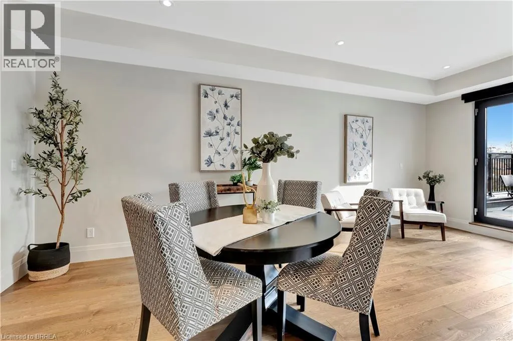 Downtown on Grand River St N across from the Cenotaph One of the most distinctive homes in the building, nicknamed The Townhome. This two-storey residence blends architectural character with contemporary design across 1,693 sq/ft of living space and over 800 sq/ft of private outdoor space. Showcasing original exposed brick and beam details, Unit 204 offers a unique sense of warmth and history while still delivering modern luxury. Wide plank hardwood flows through the main level, paired with a striking kitchen outfitted with Fisher & Paykel appliances, quartz countertops, and custom cabinetry. Both bathrooms feature spa-inspired finishes, including heated floors. The primary bedroom features a generous walk through closet and lovely bathroom, and a generous den on the 2nd level makes the perfect home office, sleeping space or second lounge. With elevator access from the second level and direct street-level entry (the only unit with this in the building), this unit lives like a private townhome. Two expansive riverside patiosâincluding one oversized terraceâoffer spectacular outdoor living and breathtaking views of the Grand River. The upper level terrace is roughed in for an outdoor kitchen, with Hot/Cold Water, Natural Gas and Electrical, while the main wall has been pre-wired for an electric awning. Included is a large storage locker and access to the resident only riverside patio perfect for casting a line or launching a canoe. (id:27476)