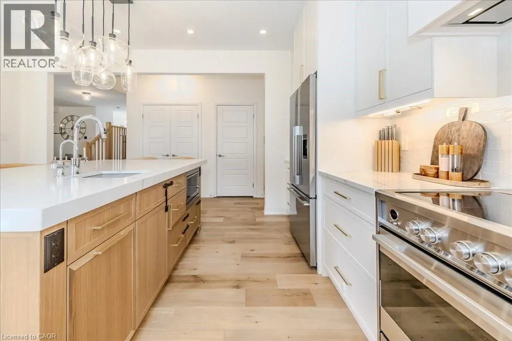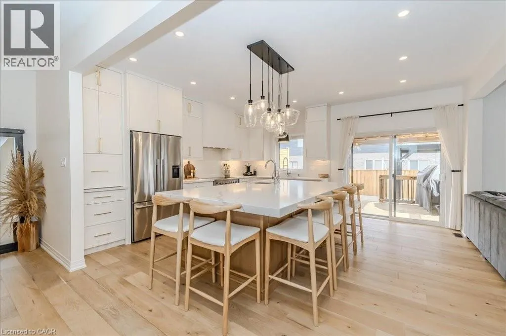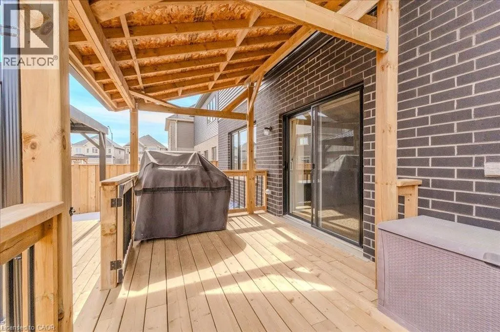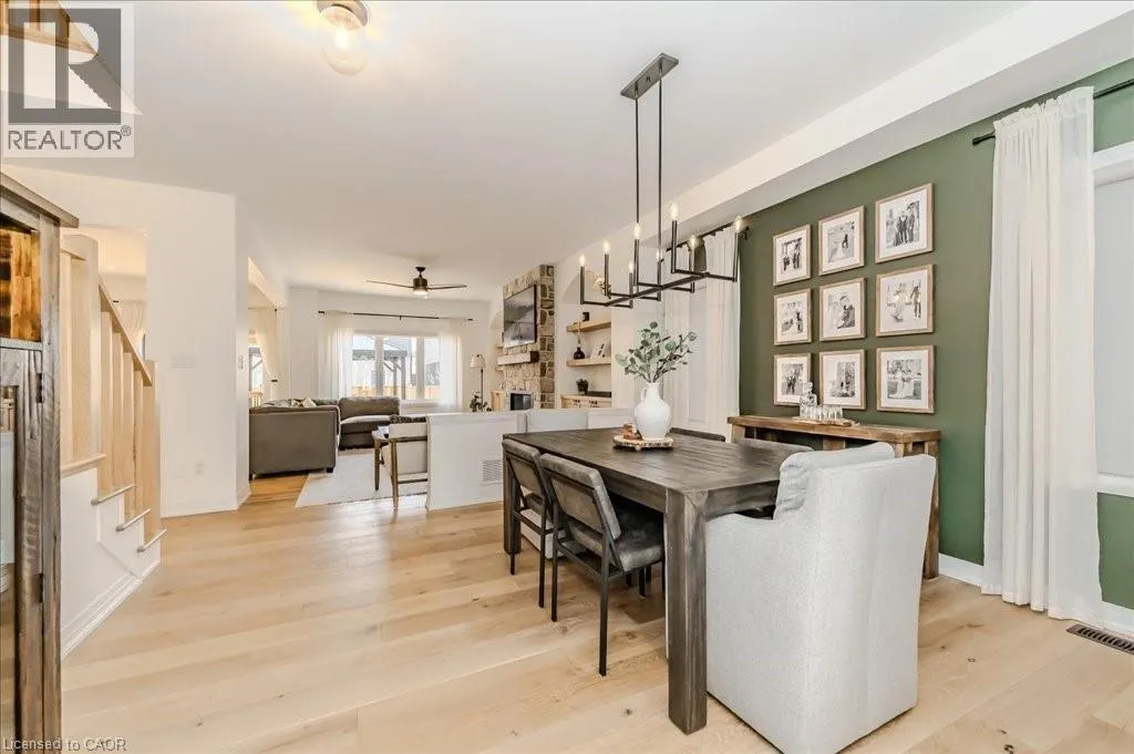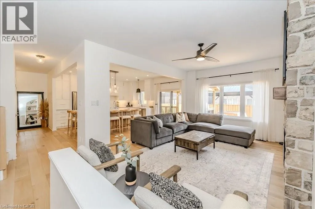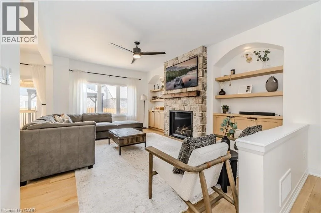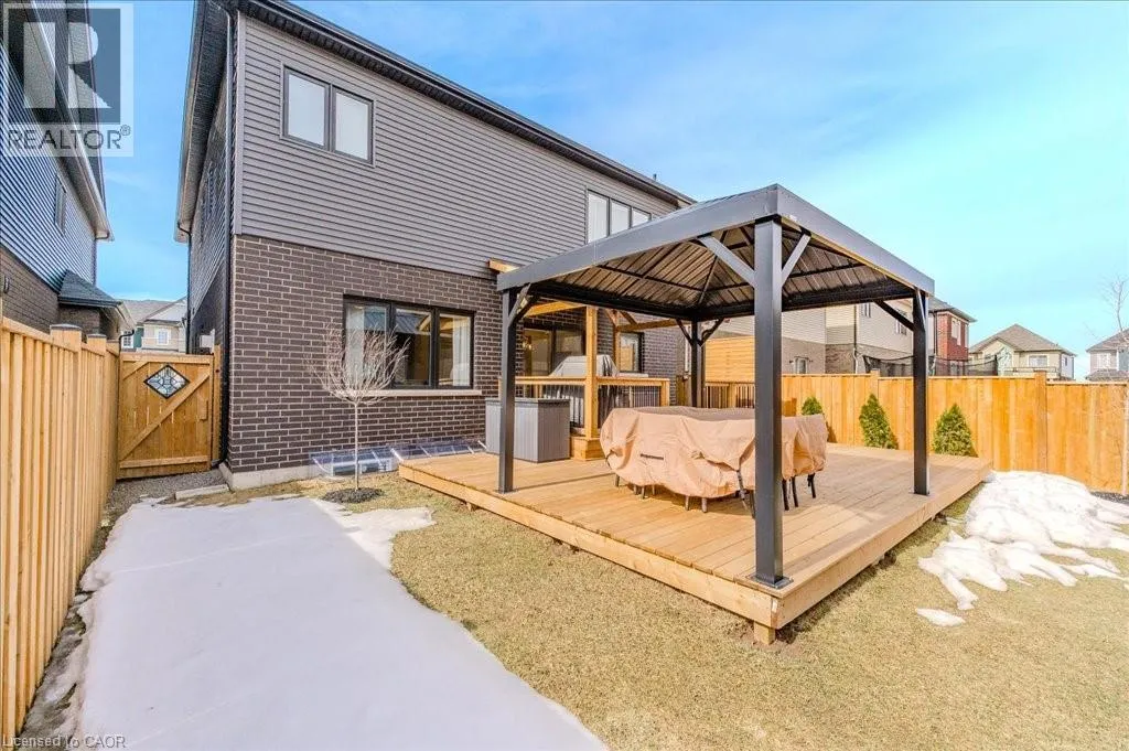 Stunning 4-bedroom, 3.5-bathroom home in the heart of Paris, Ontario, built by LIV Communities, offering 2,646 sq ft of luxurious living space. This fully upgraded home features wide plank European white oak hardwood throughout, 9-foot ceilings on the main floor, and custom lighting and window shades throughout (2022). The grand living room boasts a quarried stone fireplace with custom white oak built-ins and a large premium Napoleon gas fireplace (2023). The chef-inspired kitchen (2022) is a dream, with floor-to-ceiling soft-close cabinetry, a 36 Fischer & Paykel induction range, Miele dishwasher, and an oversized quartz island with seating for six. Enjoy convenient extras like a built-in Insinkerator for instant near-boiling water, reverse osmosis system, a large pantry, and hidden appliance garage.The spacious primary ensuite offers a large double vanity, tempered glass shower, and a large soaker tub. Two more bedrooms offer a Jack & Jill ensuite bathroom and the third bedroom boasts its own ensuite bathroom. The upstairs is complete with an LG washer and dryer (2021) which provides added convenience. The private backyard features a new wooden privacy fence (2024), a two-tiered deck (20' x 25'), and a new 12' x 10' gazebo, perfect for entertaining. Additional highlights include a 4-car driveway, 2-car garage with Wi-Fi opener, and a covered porch and second floor balcony. The basement is unspoiled and waiting for your finishing touches.This home blends modern upgrades with classic craftsmanship and is ready for you to move in and enjoy. (id:27476)