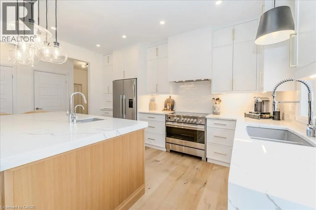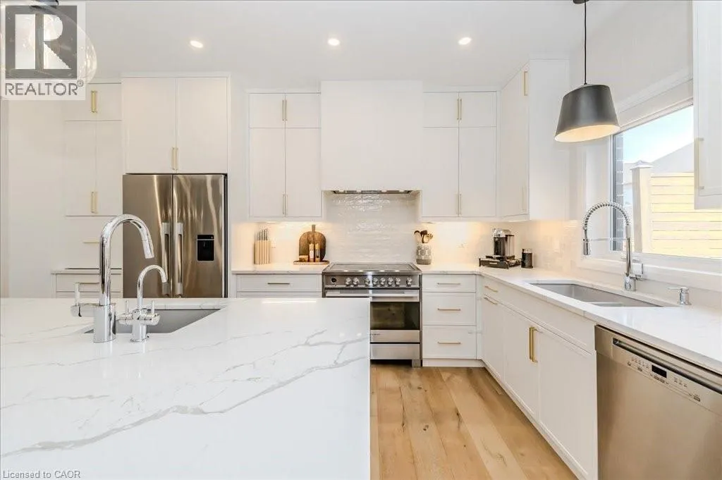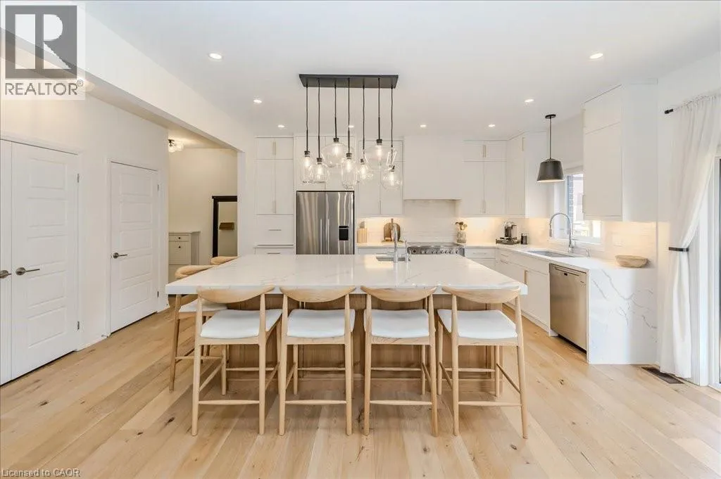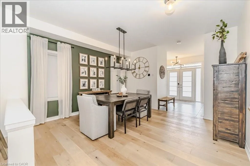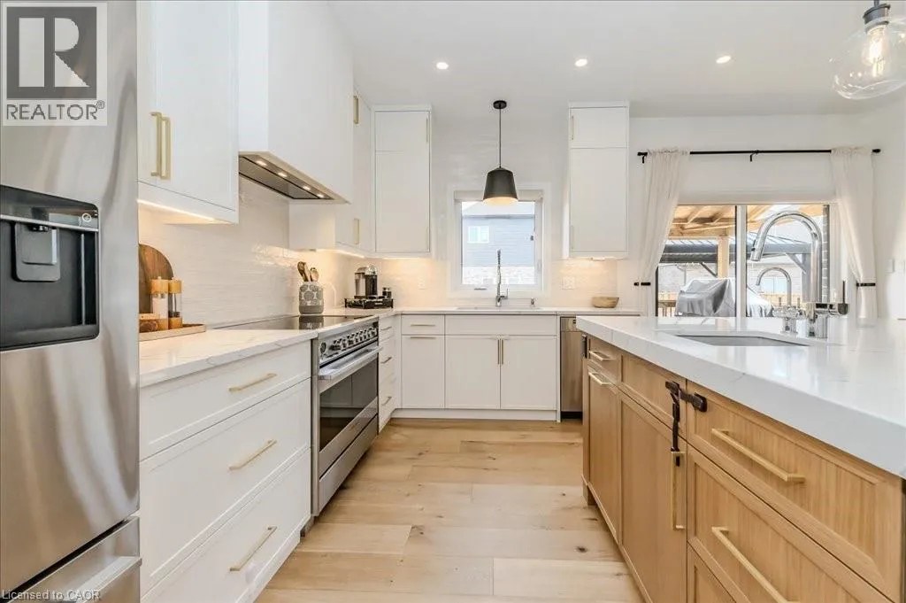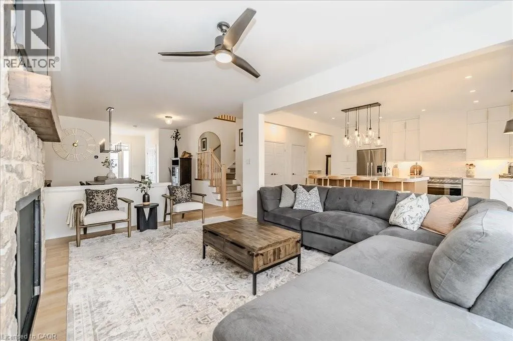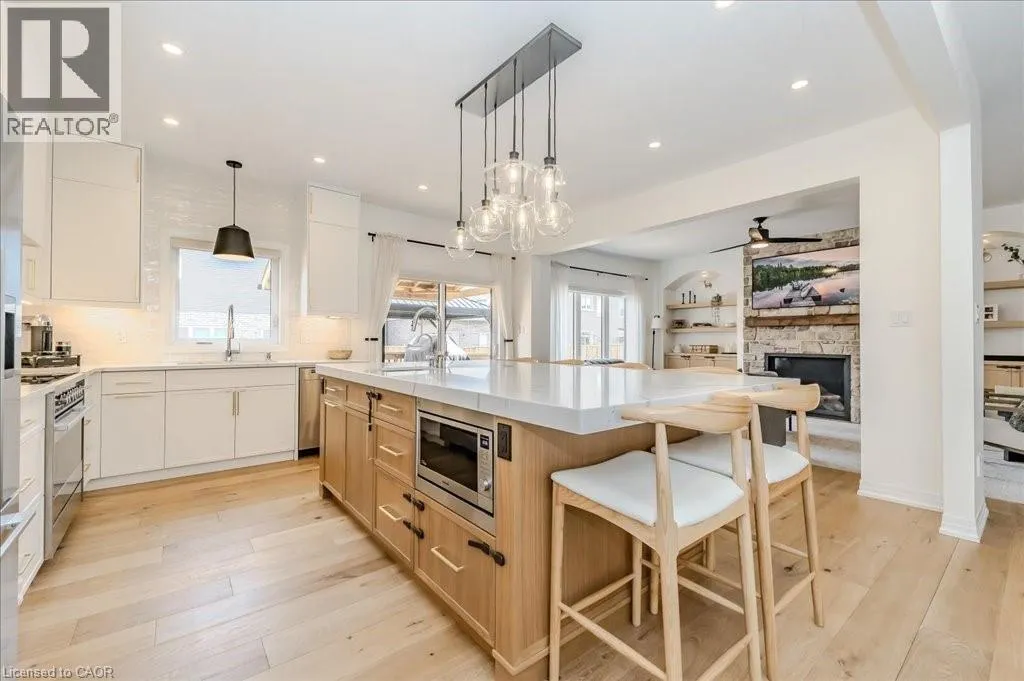 Stunning 4-bedroom, 3.5-bathroom home in the heart of Paris, Ontario, built by LIV Communities, offering 2,646 sq ft of luxurious living space. This fully upgraded home features wide plank European white oak hardwood throughout, 9-foot ceilings on the main floor, and custom lighting and window shades throughout (2022). The grand living room boasts a quarried stone fireplace with custom white oak built-ins and a large premium Napoleon gas fireplace (2023). The chef-inspired kitchen (2022) is a dream, with floor-to-ceiling soft-close cabinetry, a 36 Fischer & Paykel induction range, Miele dishwasher, and an oversized quartz island with seating for six. Enjoy convenient extras like a built-in Insinkerator for instant near-boiling water, reverse osmosis system, a large pantry, and hidden appliance garage.The spacious primary ensuite offers a large double vanity, tempered glass shower, and a large soaker tub. Two more bedrooms offer a Jack & Jill ensuite bathroom and the third bedroom boasts its own ensuite bathroom. The upstairs is complete with an LG washer and dryer (2021) which provides added convenience. The private backyard features a new wooden privacy fence (2024), a two-tiered deck (20' x 25'), and a new 12' x 10' gazebo, perfect for entertaining. Additional highlights include a 4-car driveway, 2-car garage with Wi-Fi opener, and a covered porch and second floor balcony. The basement is unspoiled and waiting for your finishing touches.This home blends modern upgrades with classic craftsmanship and is ready for you to move in and enjoy. (id:27476)
