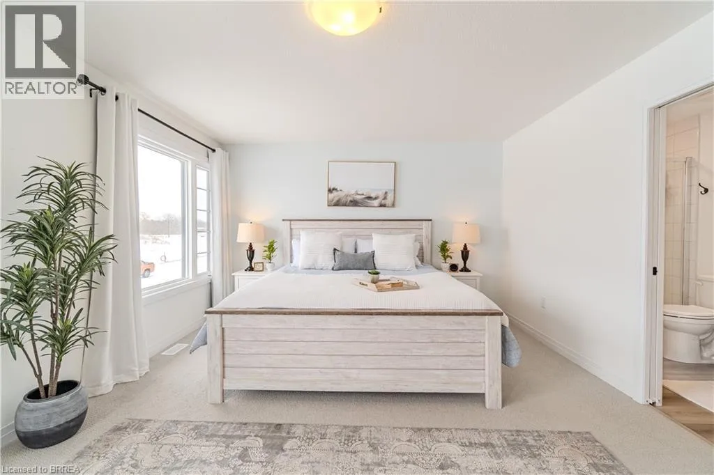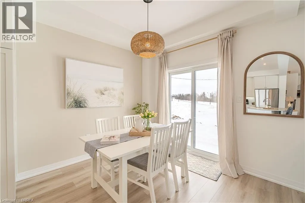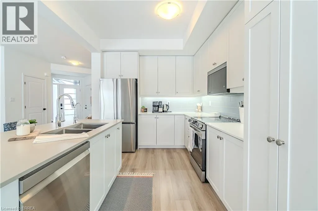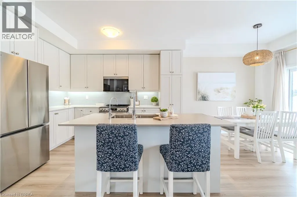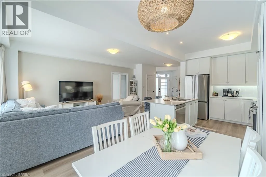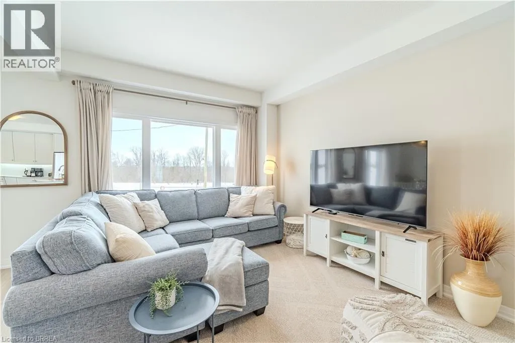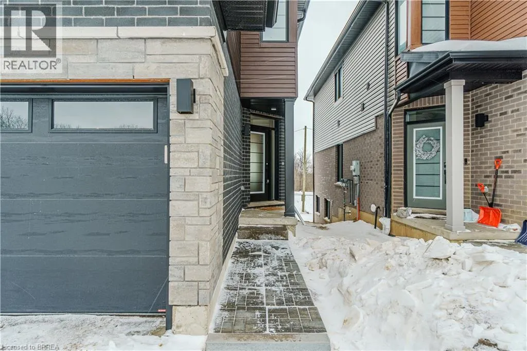 This exceptional freehold (no condo fees) end-unit townhome, built in 2025 by Losani Homes, features the Ambrosia Model with over 1,700 sq ft of refined living space. Encircled by nature and bordered by the Nith River, it offers an unmatched lifestyle. Trails at your doorstep invite canoeing, kayaking, hiking, fishing, and dog walks. Stroll through family-friendly Lions Park along the river past festivals, live music, the outdoor pool, splash pad, ball diamonds, then cross the rustic bridge into the charming downtown core to browse Wincey Mills Marketplace for fresh ingredients, coffee, fresh flowers, stop at Paris Beer Co., and wander home along the river. Striking curb appeal with dramatic dark trim, oversized windows, wood accents, modern glass door, and a large driveway to the double insulated garage. Detached homes planned behind and across the street enhance privacy and long-term value. Inside, the open-concept main floor with generous layout is perfect for entertaining, featuring shaker-style white cabinetry, quartz countertops with a statement island, designer backsplash, under-cabinet lighting, pot lights, soft-close cabinetry, fully tiled shower surrounds with niche and frameless glass, and huge windows that flood the space with light. Upstairs, the massive master suite features large windows with stunning views of the Nith River Valley, a spacious walk-in closet, and a luxurious ensuite. Two additional bedrooms, laundry, and open space complete the upper level. Additional highlights include keyless entry, extreme lookout basement window, upgraded garage insulation, high-end LG appliances, r/o water system, humidifier, central air, garage door opener, and custom window coverings. Sod and a future deck are yet to be completed, allowing personalized outdoor space, while a proposed park just down the street adds appeal. Expertly built with superior soundproofing, this home offers a level of privacy rarely found in townhome living. (id:27476)