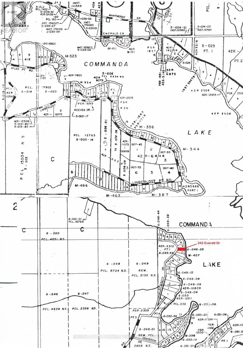 Cross Streets: Everett Dr & Graybow Dr. ** Directions: Hwy 522 to right on Commanda Lake Rd to left on Lambs Rd straight to Everett Dr to #242. Cozy Four-Season Cottage on Commanda Lake. Tucked away on a private, tree-lined lot, this turn-key three-bedroom, one-bathroom cottage offers the perfect blend of comfort and charm with 163 feet of owned sandy shoreline on beautiful Commanda Lake. Step inside to an inviting open-concept living space with maple hardwood floors, a fully renovated bath, and the warmth of a propane furnace (2020). With 200-amp hydro service, full septic, laundry, and a durable steel roof, this cottage is ready to be enjoyed year-round. The property also includes a three-piece docking system and newly installed screw pile supports - perfect for your future lakeside deck. Commanda Lake is a peaceful, scenic lake, ideal for swimming, fishing, water sports, or simply relaxing by the water. Mature hardwood trees surround the property, creating a natural setting thats both beautiful and private - your very own northern retreat. Easily accessible on a municipally maintained four-season road, and located in an Unorganized Township with ultra-low taxes, this cottage is just three hours from the GTA close enough for weekend escapes, yet far enough to feel like a true getaway. (id:27476)