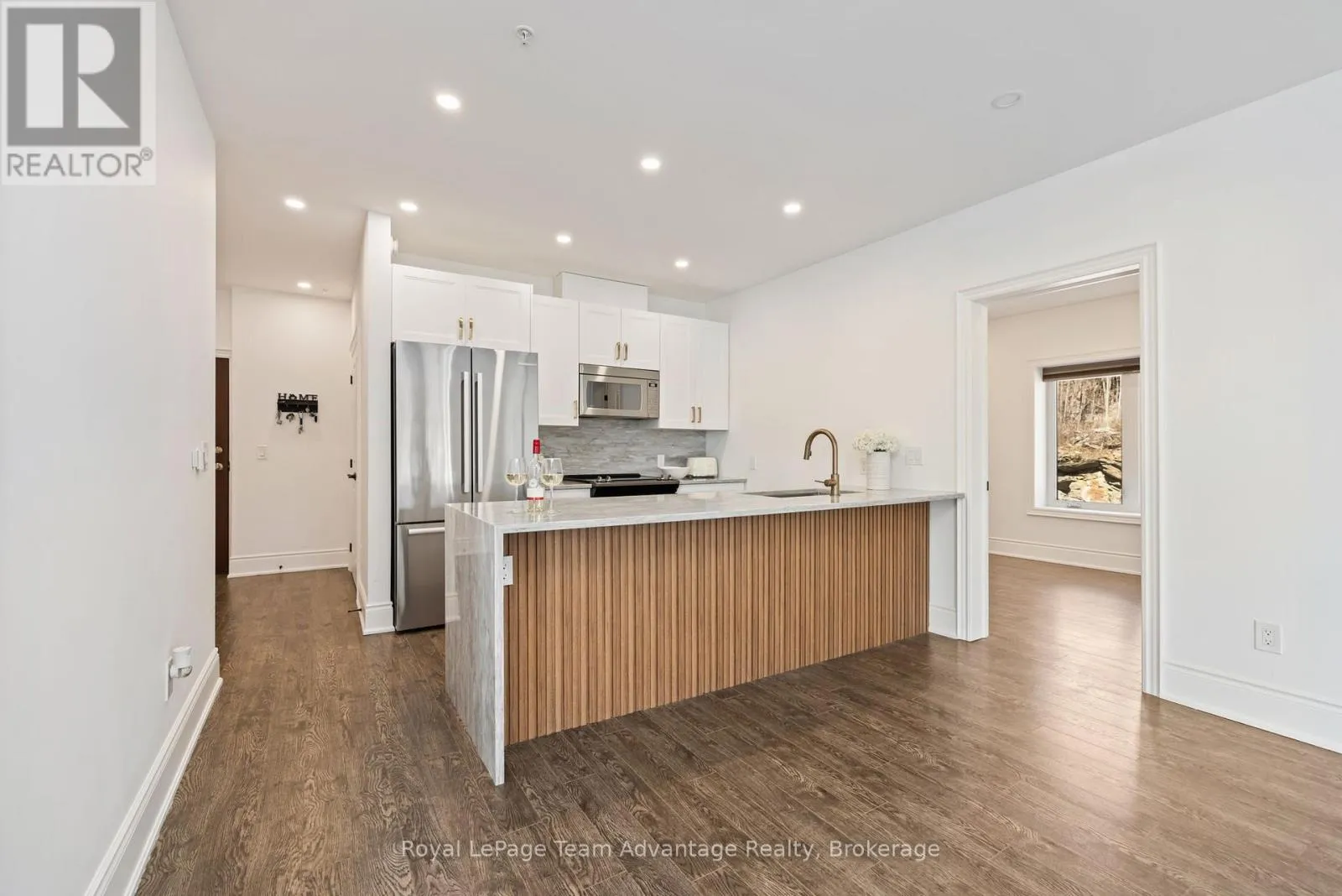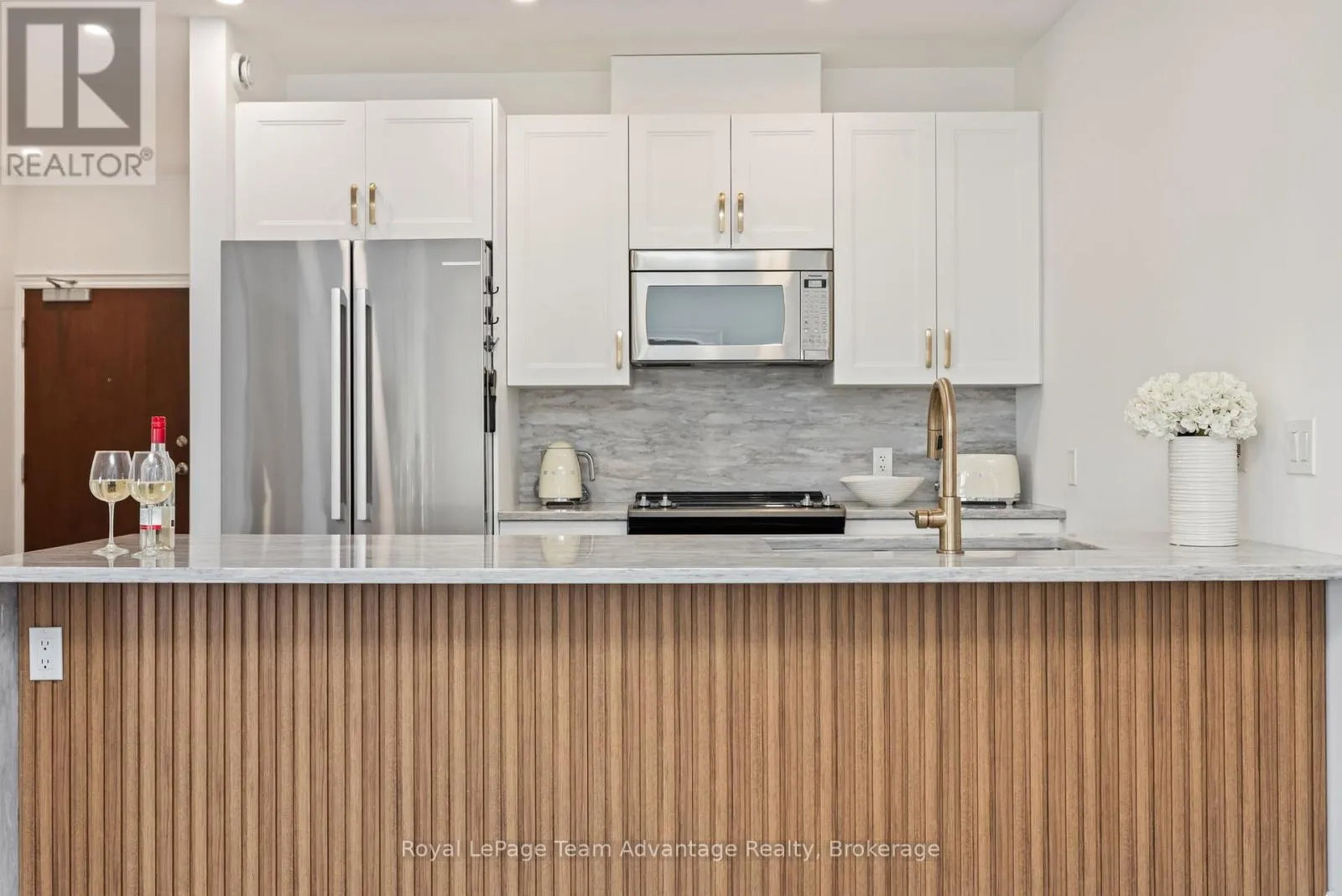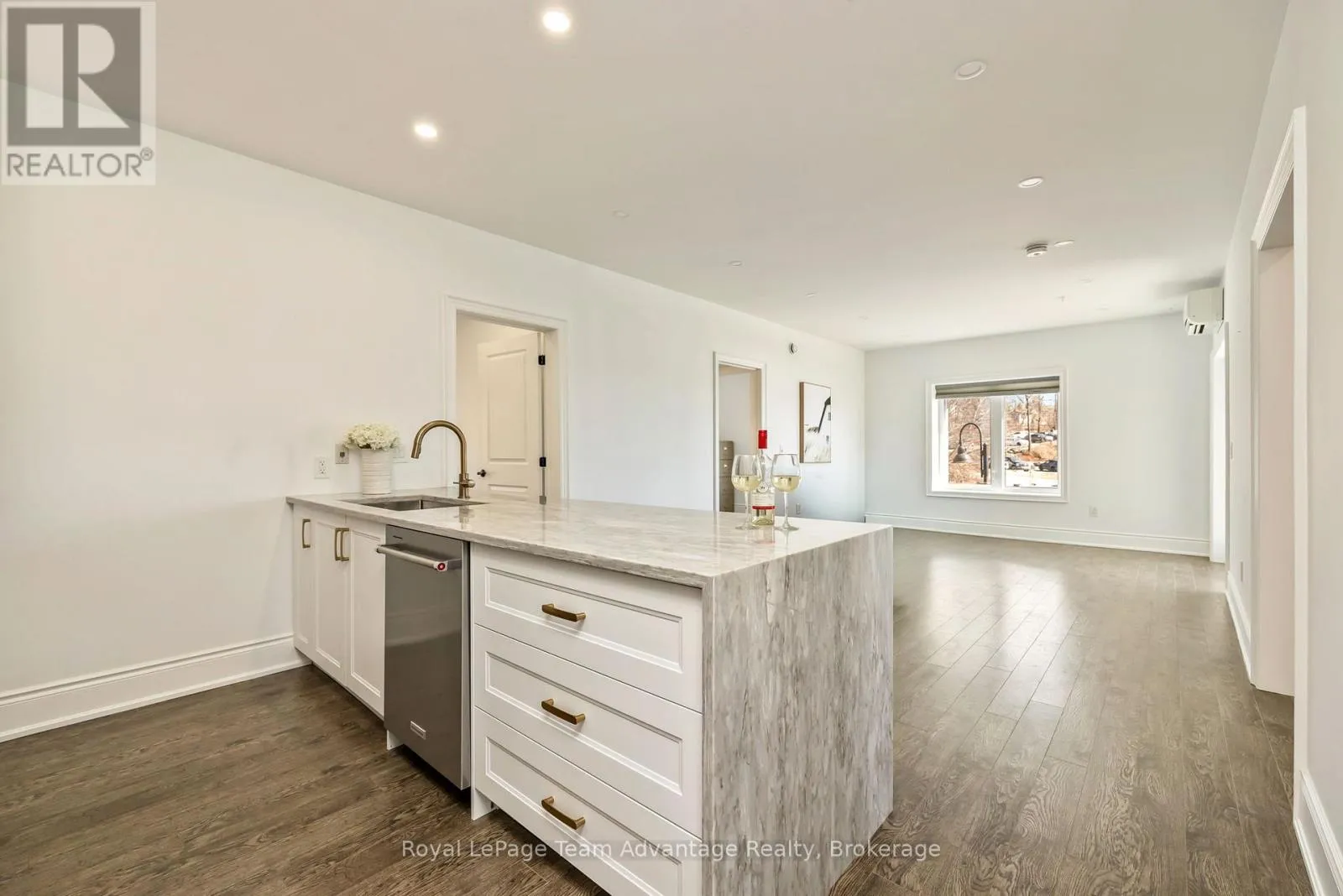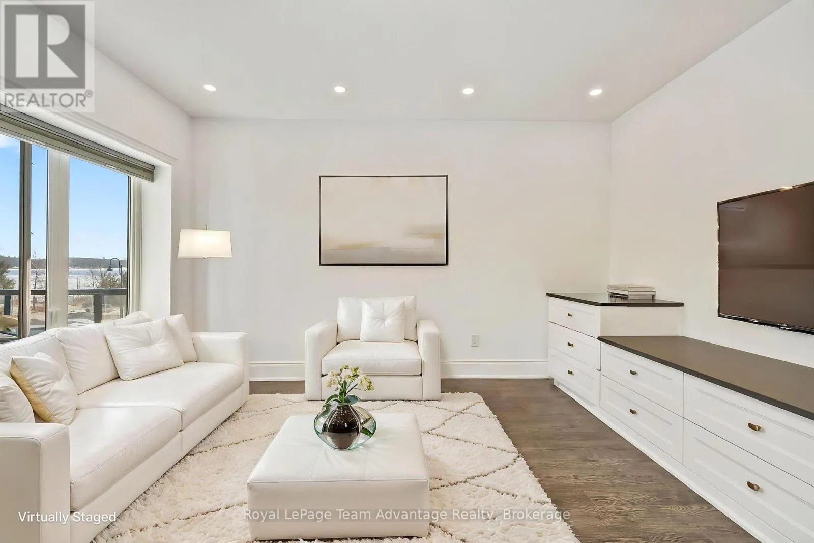 Cross Streets: Marion Ave and Salt Dock Road. ** Directions: Wood St to Marion Ave to Salt Dock Road. Experience breathtaking Georgian Bay waterfront views from this stunning open concept 2 bedroom, 2 bath + den condo. The beautifully appointed kitchen boasts a large peninsula island with waterfall countertop and stainless steel appliances - perfect for entertaining or casual dining. Step out from the living room onto your private balcony and take in picturesque views of Georgian Bay. The primary bedroom offers a walk-in closet and a private ensuite while the second bedroom enjoys adjacent access to a 3-piece bath. The den/media room is enhanced with gorgeous built-in cabinetry providing style and functionality. Located in Parry Sound - this exceptional residence in 'The Breakers' places you a short distance from the fitness trail, sailing club, beach, restaurants and Stockey Entertainment Centre making it easy to enjoy a relaxed, low-maintenance lifestyle. Welcome home. (id:27476)