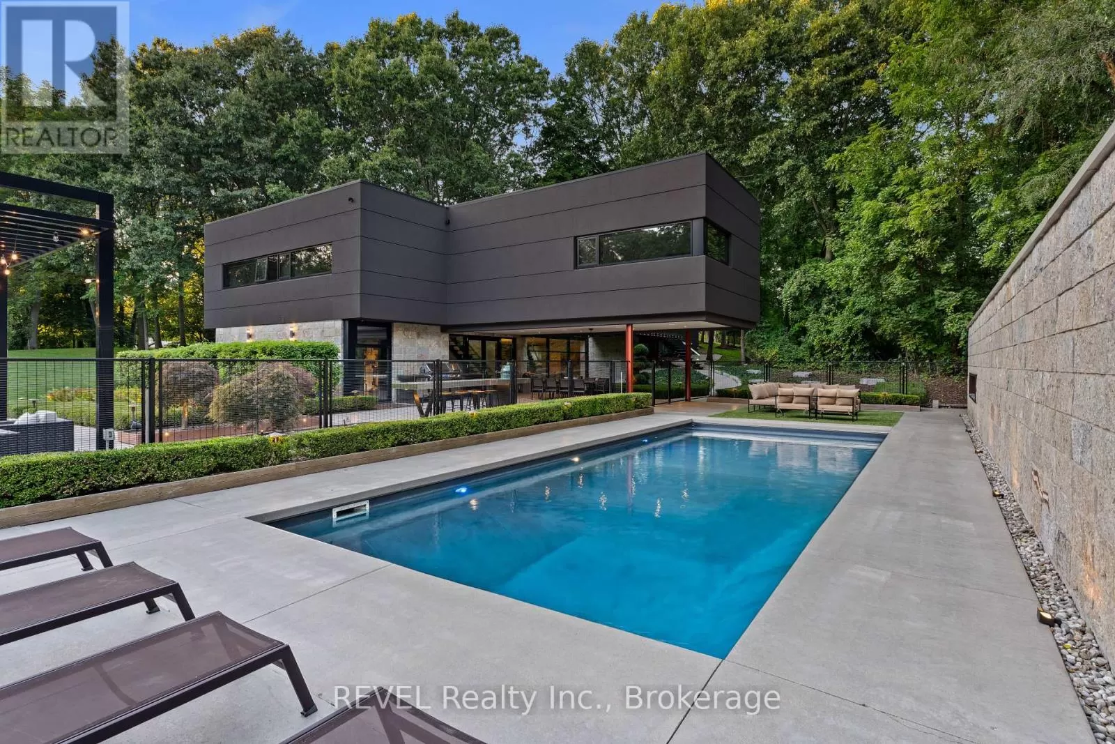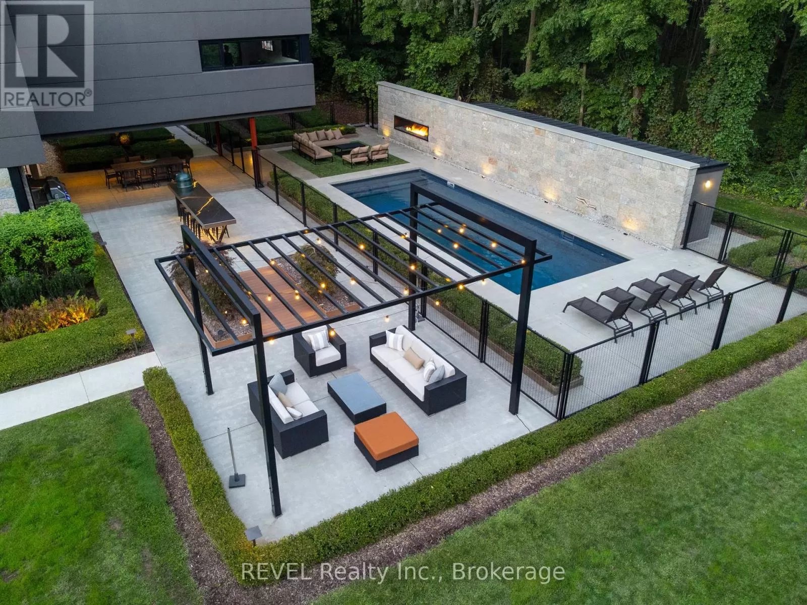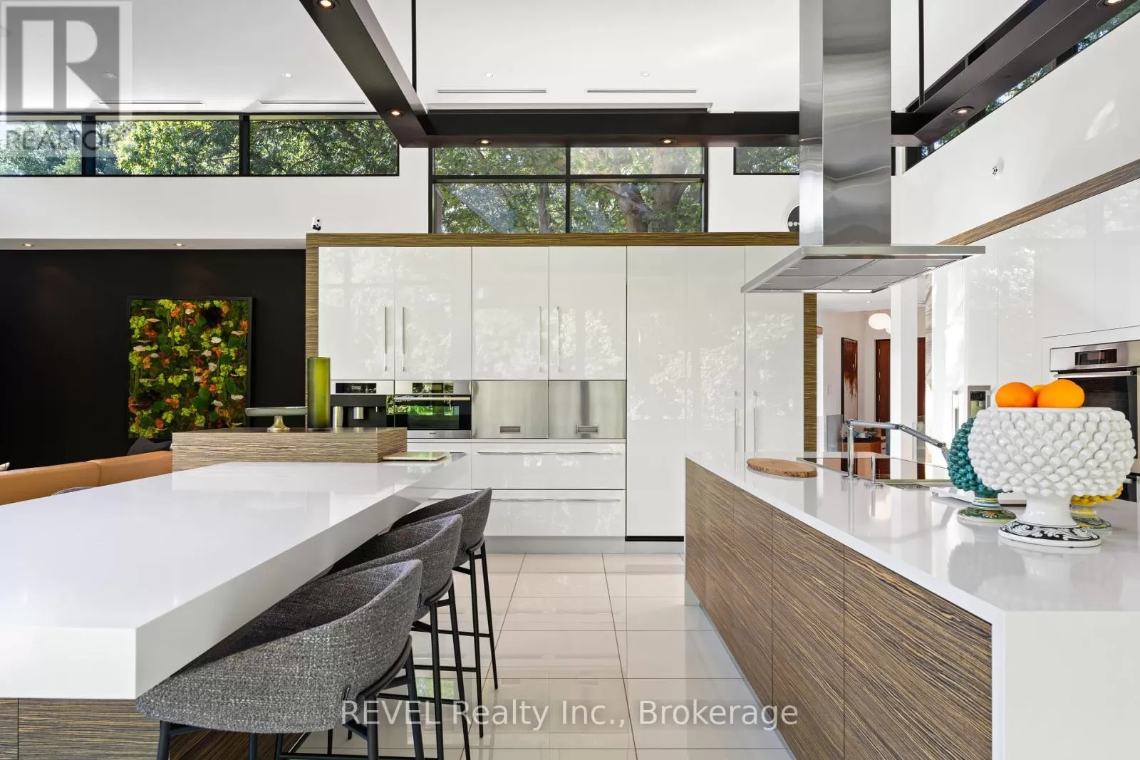Cross Streets: Haist, Effingham. ** Directions: HWY20, to Haist, to Canboro. Architectural majesty and artistic risk define luxury for this modern bungalow estate in the charming township of Fonthill. Emerging from a 2.9 acre property populated by picturesque, Carolinian trees, this modernly unique one story creation with full walkout and floor to ceiling curtain wall windows, fuses a designer eye with an environmentalist's appreciation for natural integration. Structured with steel frame construction, and offering in floor heating via boiler and concrete floors on both main and lower levels, this mansions elite finishes, set against the views of forested privacy, present pleasurable pastoral perspectives and authentic tranquility, inside and out. Features include 16' ceilings in main living area; specialty imported glass porcelain tiles; engineered hardwood; fully automated light and sound systems by Crestron Products; surround sound theater area with power drop down screen; wine and artisanal meat cellar; enormous upper and lower designer kitchens with quartz stone countertops; three plus one spacious bedrooms; main floor glass walled office; master ensuite with oversized shower; and customized built ins throughout for exceptional storage capacity. The sauntering transition to resort worthy outdoor amenities is just as dazzling, with walkouts that seamlessly flow into a heated saltwater pool area with feature stone wall, outdoor gas fireplace, cedar clad washroom and change rooms. For the luxury car enthusiast, and with 400 amp electrical service available, enjoy the recently built 2600sq.ft showcase accessory garage(detached) that complements an oversized four car garage attached to the home. With approximately 5400 sq. ft of fully finished and fully serviced living space conceptualized to exploit every possible vantage point of this incredible landscape, this estate sets a new standard as the epitome of luxury listings. (id:27476)
