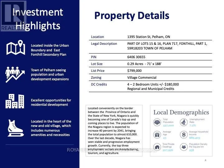 Cross Streets: SUMMERSIDES BLVD AND STATION ST. ** Directions: HIGHWAY 20 TO STATION STREET. Excellent small-scale development opportunity in the heart of Fonthill. This 0.29-acre property offers 71' of serviced frontage and includes $180,000 in development charge credits. With fewer than 10 units, the site can proceed without site plan control, offering a streamlined approval process for builders and developers. Preliminary concept plans show 8 stacked townhouse units, with potential for alternate layouts or freehold residential development. Zoned Village Commercial, the property allows for a wide variety of permitted uses, including: apartment dwellings, townhouses, bakery, restaurant, retail, offices, hotel, microbrewery, cultural use, live-work units, and short-term accommodation, among others. Ideally located within walking distance to Fonthill Town Square, shopping plazas, restaurants, grocery stores, LCBO, schools, churches, parks, and the Meridian Community Centre with its new arena and recreation facilities. (id:27476)