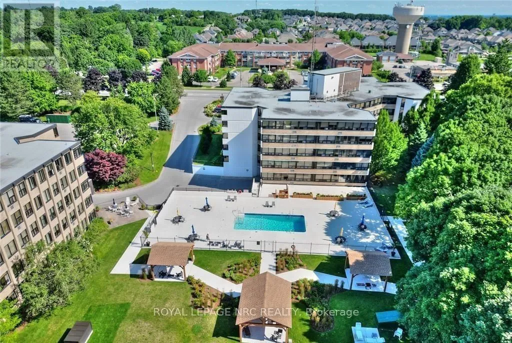 Cross Streets: Lookout Street/Hwy 20. ** Directions: 200 Hwy 20 in Fonthill on South side of Hwy 20. Rarely offered & Highly Sought after - Lookout Village - 6th floor (top floor) unit overlooking 7 acres of picturesque and coiffured grounds. One of the few condo units with 1500 +/- Sq. Ft. of living space, including 2 bedrooms & Den as well as an over-sized Living/Dining combination. Stunning kitchen complete with built in appliances -Stove Top, BI Oven, Bi Microwave (2023), Bi Dishwasher, BI Wine Fridge (2025) & Double Door Fridge (2025) . Flooring is Ceramic Tile and the cabinets are a warm blonde with modern brushed nickel pulls, and drawers are soft close. Counters are quartz. The kitchen was extended to include a pantry area for ample storage of dry goods etc. Primary ensuite and Main Bath were also renovated in 2009 with new cabinetry and quartz vanities. Bedrooms and Liv/Din areas are engineered hardwood and all windows are covered with UV blocking Solar Shades in neutral tones. AC Wall units new in 2019. Residents have the use of many amenitities including the outdoor I/G pool, tennis courts, barbecues, well equipped exercise room, and party/reading room and even ping pong! This is a smoke and pet free building, as per By-Laws and Rules & Regulations. You won't feel as though you are iving in a high rise apt with nothing but concrete as far as the eye can see but rather you will marvel at the changing seasons and with the beautifully kept grounds you can enjoy the outdoors and entertain your guests with room to spare. A wonderful lifestyle for retirees, executives and professionals. Residents are responsible for Hydro, (averaging $130/ month) and tenant insurance. (id:27476)