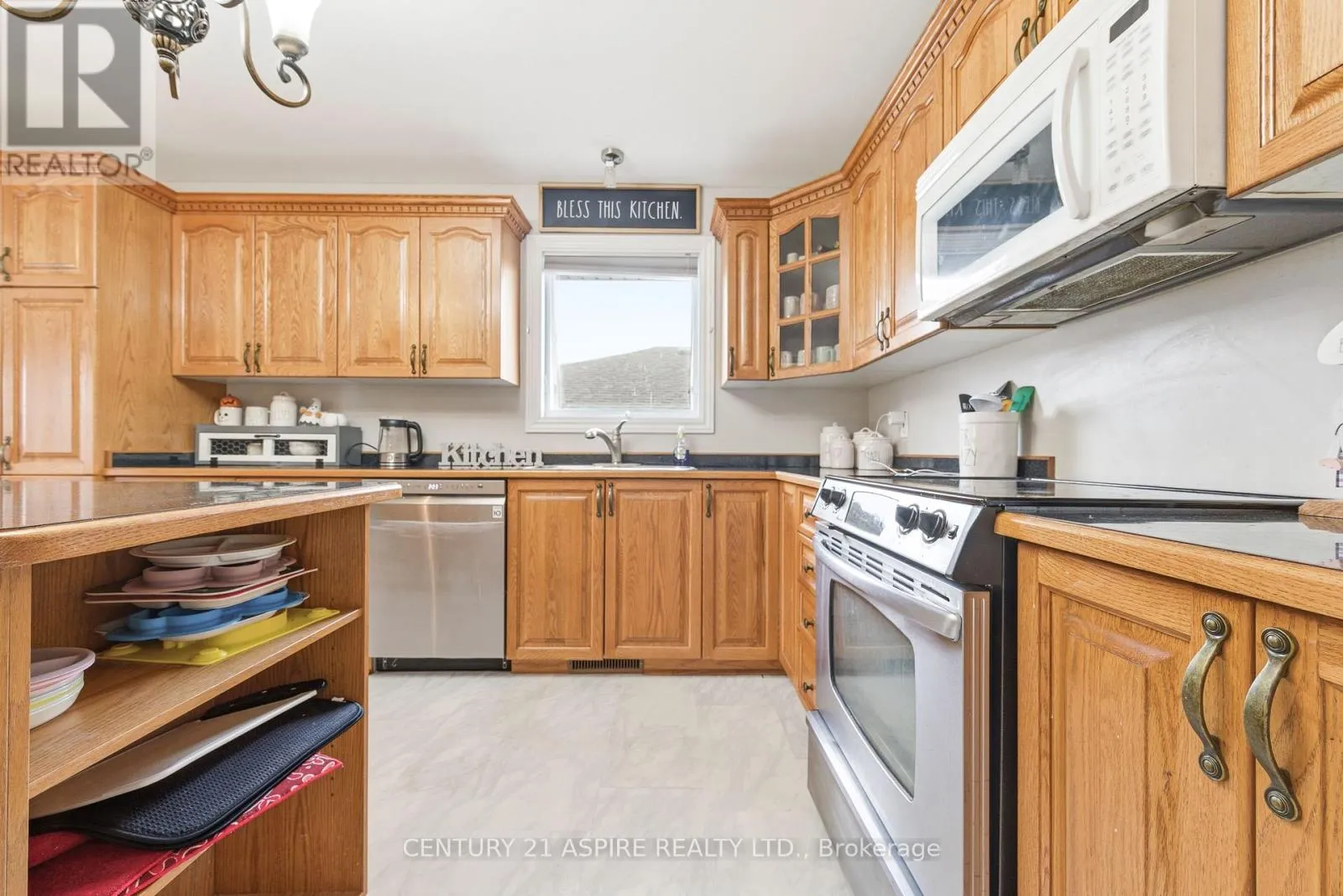 Cross Streets: Cockburn and Sydenham. ** Directions: From Pembroke Street E to Angus Campbell Drive. Welcome to this bright and spacious custom-built side split home, offering approximately 1,450 sq. ft. on each level. Perfectly situated in one of Pembroke's most desirable east-end neighbourhoods, this beautiful property sits on a generously sized lot, set well back from the road for added privacy. Step inside to a large, inviting foyer with ceramic tile flooring. The main level showcases timeless hardwood floors throughout the open-concept living and dining areas, along with a spacious kitchen featuring solid oak cabinetry and a large island - ideal for family gatherings and entertaining. Three bedrooms, including a sizeable primary bedroom, and a large 4-piece bathroom round out the main level. The lower level boasts a massive rec room complete with a cozy natural gas fireplace, abundant storage, a huge fourth bedroom, a full bathroom with a relaxing jacuzzi tub, and a laundry room. The attached double garage provides ample space for two vehicles, lawn equipment, and includes a convenient rear overhead door for easy backyard access. The backyard is surrounded by mature trees, a large deck, and green space to enjoy. This one-of-a-kind home perfectly combines comfort, space, and privacy in an unbeatable location. (id:27476)