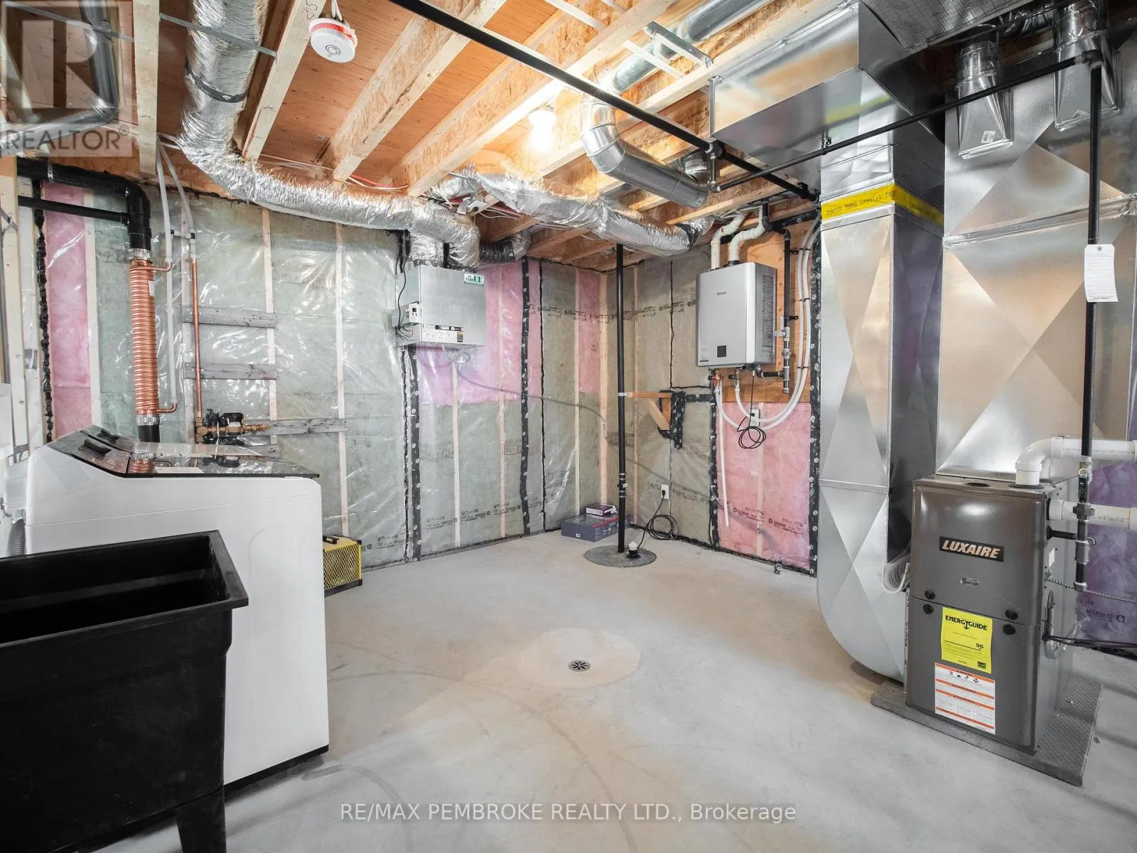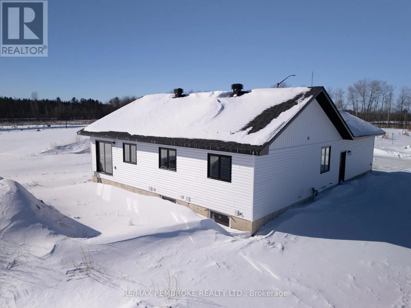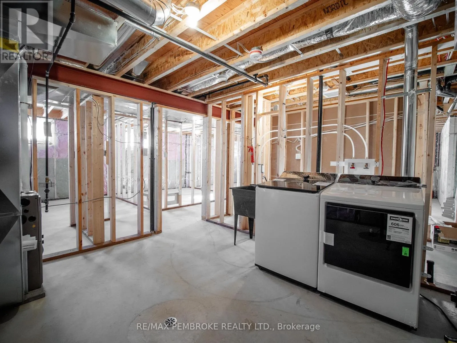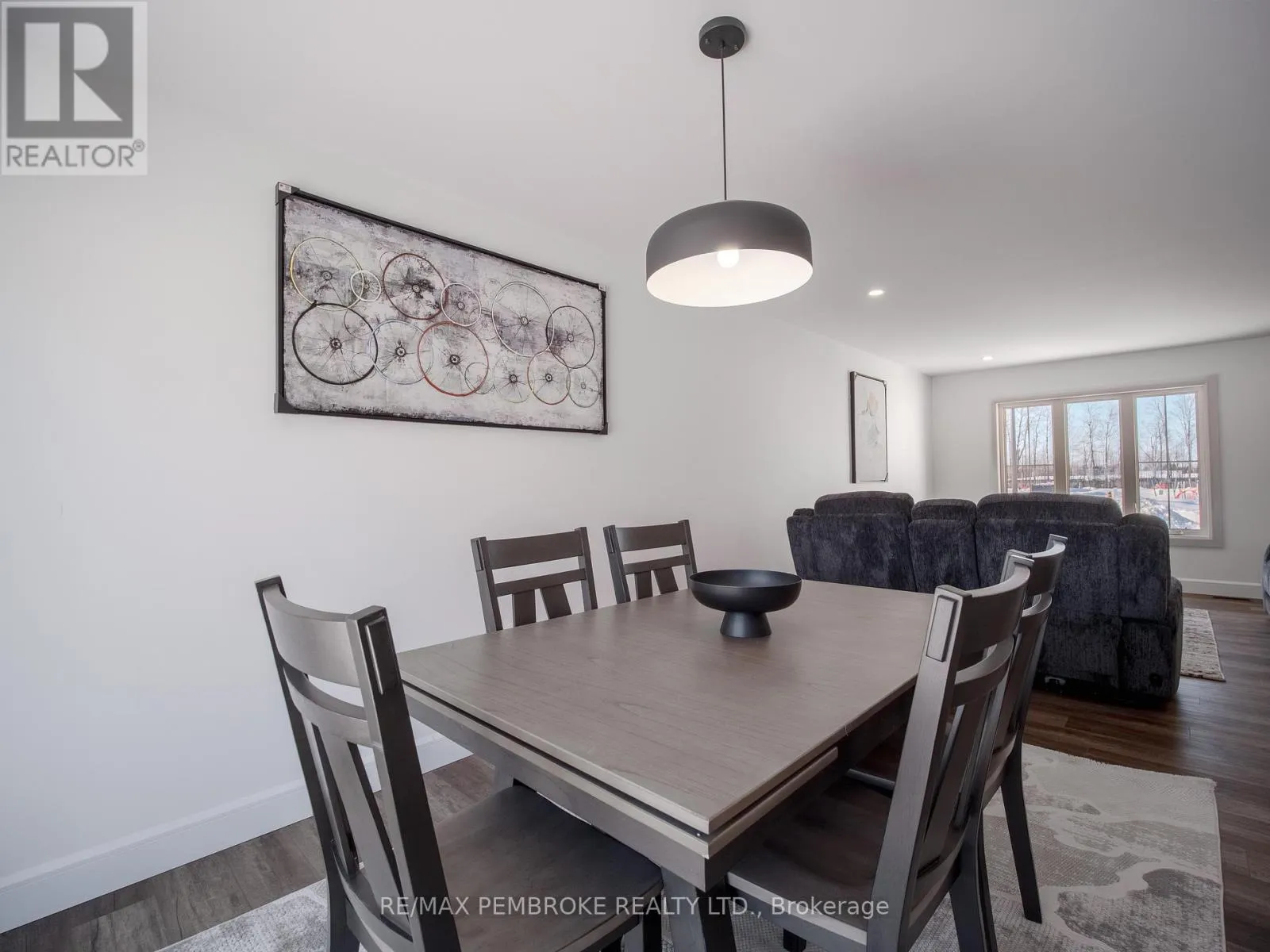 Cross Streets: Boundary rd west/eddy. ** Directions: Boudary St West to Eddy Cr. Welcome to " The Teddy" at 62 Eddy Crescent in Pembroke's desirable west end, a beautifully built brand new bungalow located in a brand new subdivision, offering the perfect blend of modern living and outdoor lifestyle. This thoughtfully designed home offers approximately 1,232 sq. ft. of bright open-concept main floor living space featuring a modern kitchen with a large center island and a spacious dining area with patio door access. The inviting living room is filled with natural light, creating a warm and welcoming atmosphere. The main level includes three bedrooms and a full bathroom, including a spacious primary bedroom, along with the convenience of an attached oversized garage. The full basement has already been framed, rough wired, and rough plumbed for a future bathroom and is laid out for a large rec room, additional bedroom, office, and storage area which can be completed prior to closing at the Buyer's option for an additional cost, offering excellent potential to expand living space and add value. Built with quality construction including an engineered truss roof system, 8-foot poured concrete foundation, HRV system, radon rough-in, R-60 attic insulation, and R-20 wall insulation, this home offers efficiency and peace of mind. Located close to schools, parks, shopping, and amenities, this move-in ready property is ideal for families, downsizers, or buyers seeking a new home with future development potential in Pembroke's newest subdivision. Purchase price includes HST with rebates signed back to the Builder. Full Tarion Warranty (id:27476)