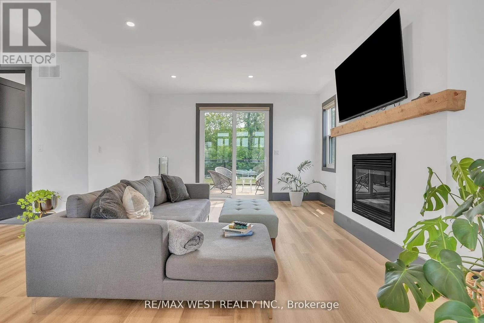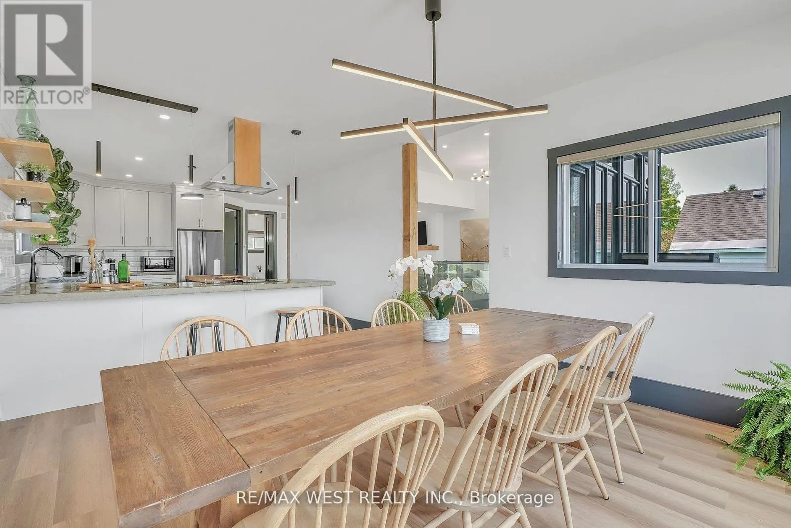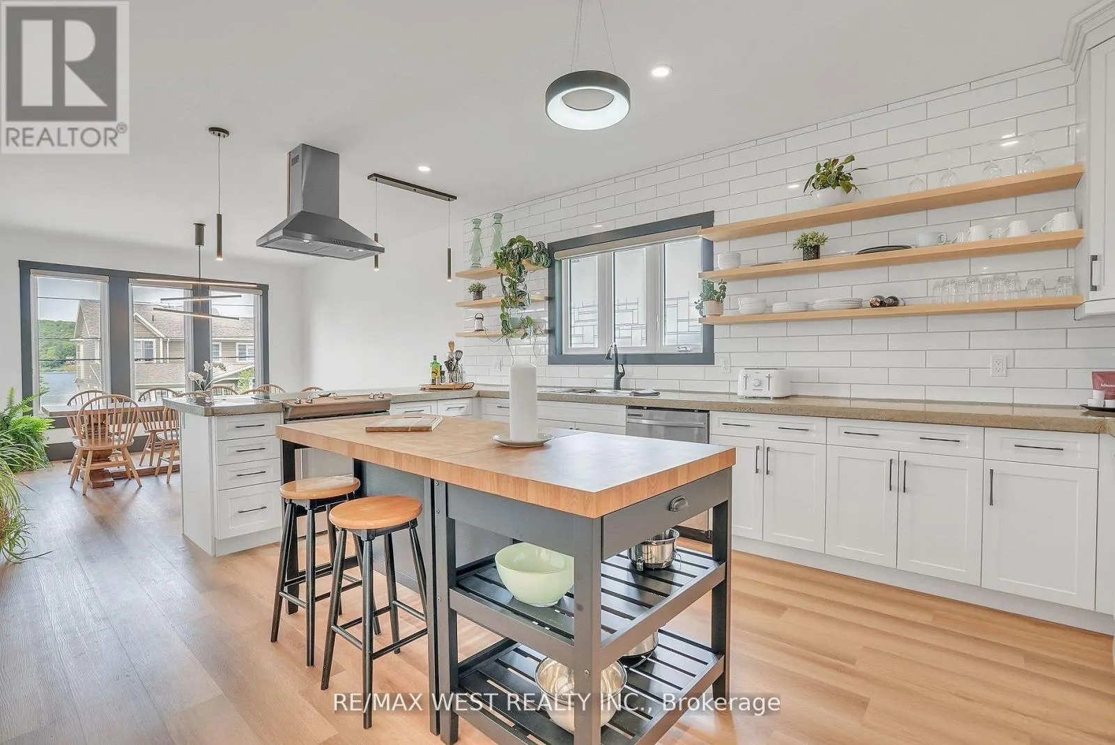 Robert Street East Modern Luxury with Scenic Harbour Views. Just Steps from the Beach. Experience refined coastal living in this exceptional 2,400 sq. ft. modern residence, ideally located just a 3-minute stroll from the beach and showcasing captivating southwest views of Penetang Harbour. Thoughtfully designed with 4 spacious bedrooms (3 on the main floor and 1 on the second floor, now being used as a gym, but could be home office or flex space) and 2.5 elegant bathrooms, this home features an airy open-concept layout highlighted by soaring 12-foot ceilings in the great room, 9-foot ceilings throughout, and premium finishes at every turn. The heart of the home a gourmet kitchen with stainless steel appliances flows seamlessly into the dining and living areas, complete with a cozy fireplace and walkout to a covered balcony perfect for sunset views. Retreat to the serene primary suite featuring a spa-inspired ensuite with a walk-in glass shower. Additional features include radiant in-floor heating on the ground level, modern lighting with designer Kusco fixtures, $10,000 in custom window coverings, 8-foot doors, and custom baseboards throughout. Practicality meets style with inside access to a single-car garage, a well-appointed mudroom/laundry space, and multiple outdoor living areas including three decks and a generous backyard. This is coastal elegance at its finest where every detail has been carefully curated for modern comfort and relaxed sophistication. (id:27476)