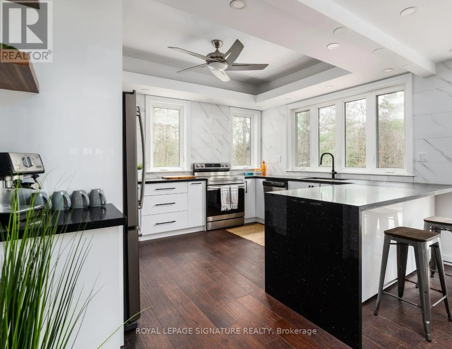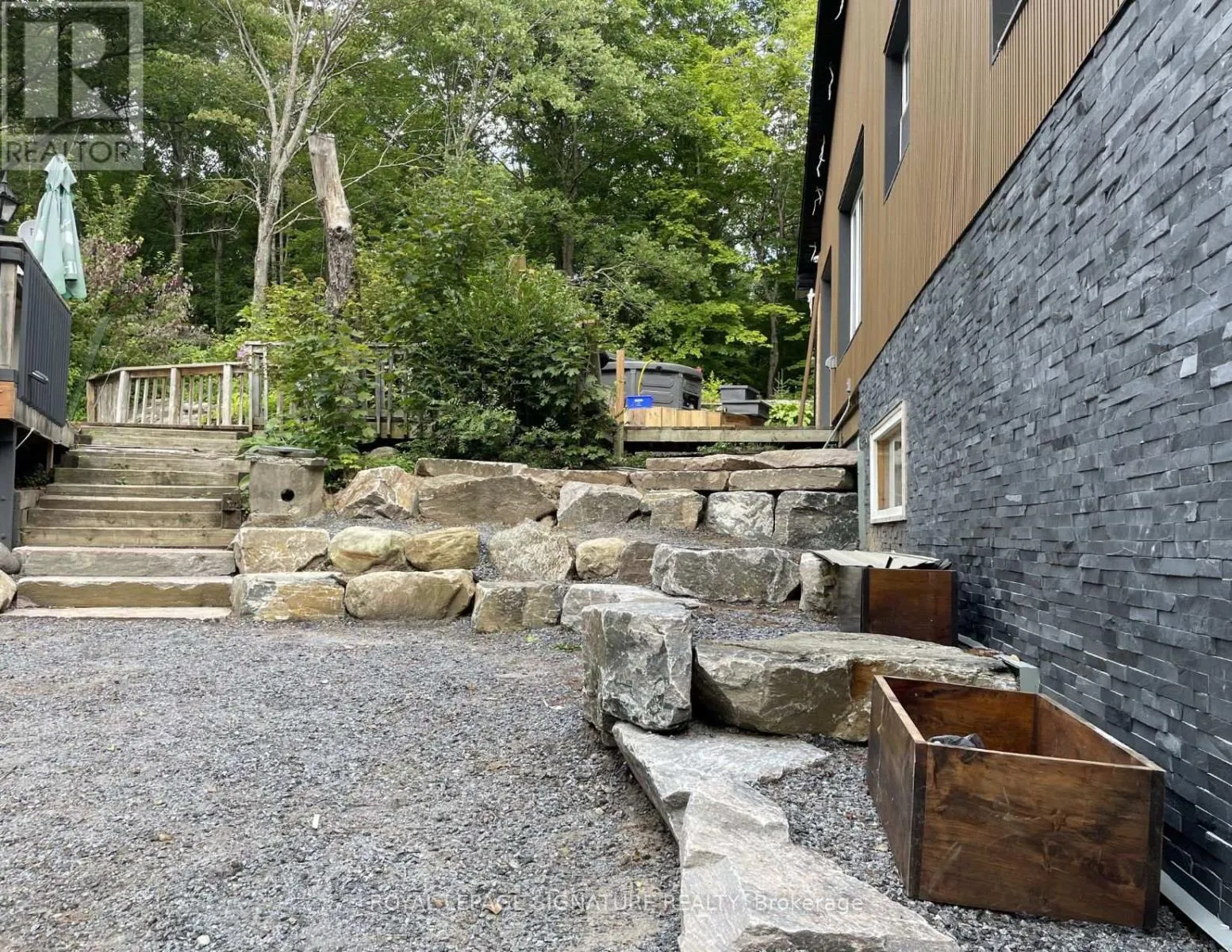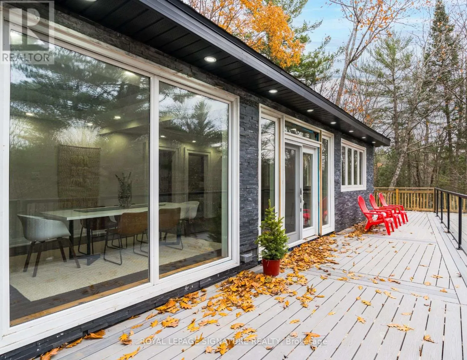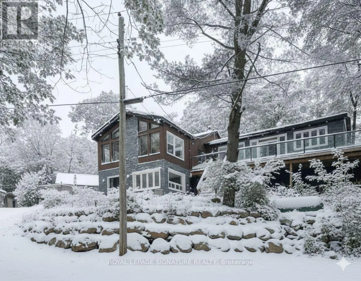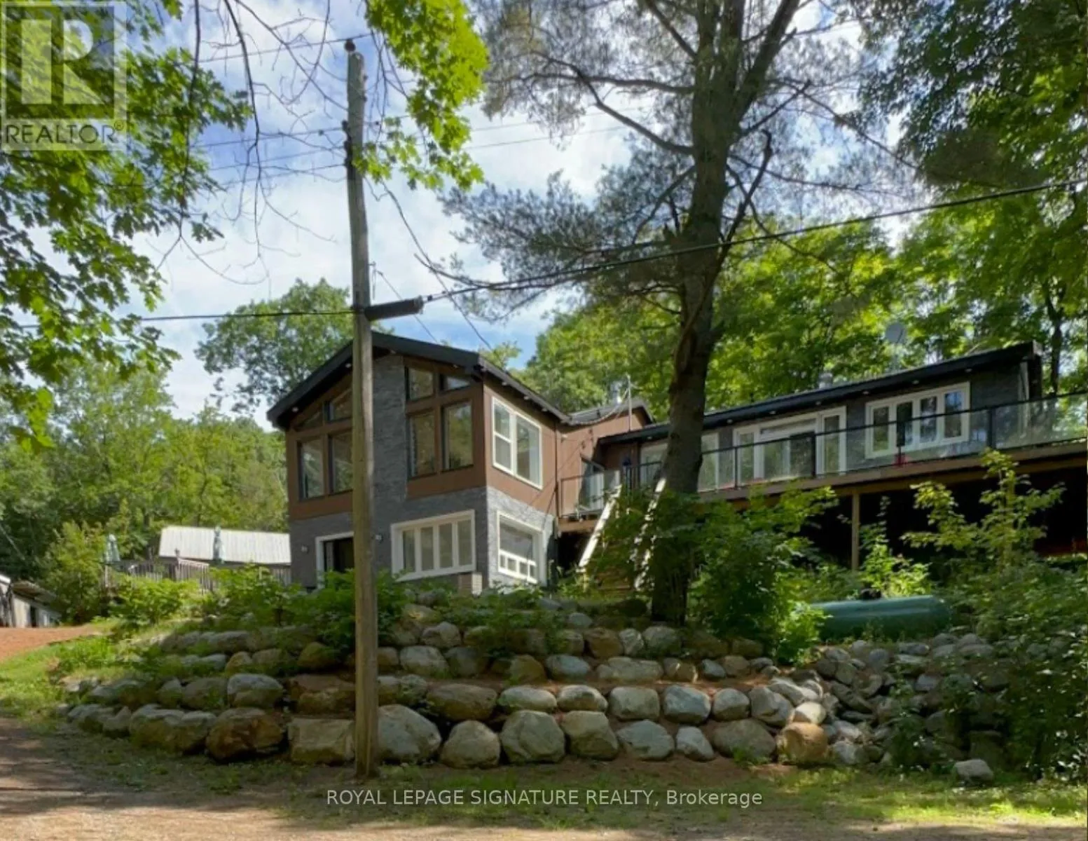 Long Lake Rd & Boundary Rd Escape to this newly renovated, open-concept 4 season home, nestled on a majestic 0.95-acre treed lot overlooking Langford Lake. This turn-key 4-season home perfectly blends modern luxury with rustic cottage charm. The heart of the home features a wrap around deck overlooking the lake and gorgeous landscape, a gourmet kitchen with built-in appliances, a breakfast bar, and a layout designed for entertaining. The main floor flows seamlessly into spacious living areas with high ceilings and large windows that frame peaceful forest views. The home offers a flexible layout with 4+1 bedrooms and 2 bathrooms, including a primary suite with an ensuite bath and direct walk-out access to the deck. Multi-tiered wrap-around decks expand your living space outdoors, offering the perfect setting for summer BBQs or morning coffee while overlooking the private grounds. Just steps away, enjoy your own municipally permitted private dock and sandy waterfront access on beautiful Langford Lake-perfect for swimming, boating, and fishing without the high waterfront taxes. The property also features a large detached 2-car garage/workshop, wood shed, and garden house for ample storage and loads of possibilities for a multi-generational compound in the heart of the North. Currently operating as a successful Airbnb with strong income potential, this is an ideal investment or family getaway. (id:27476)
