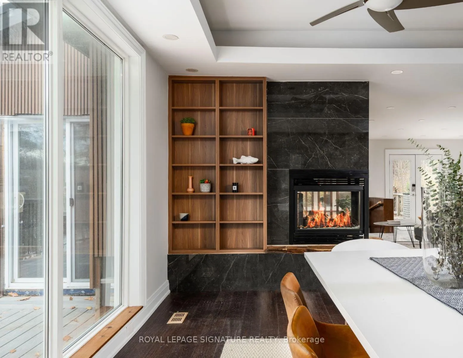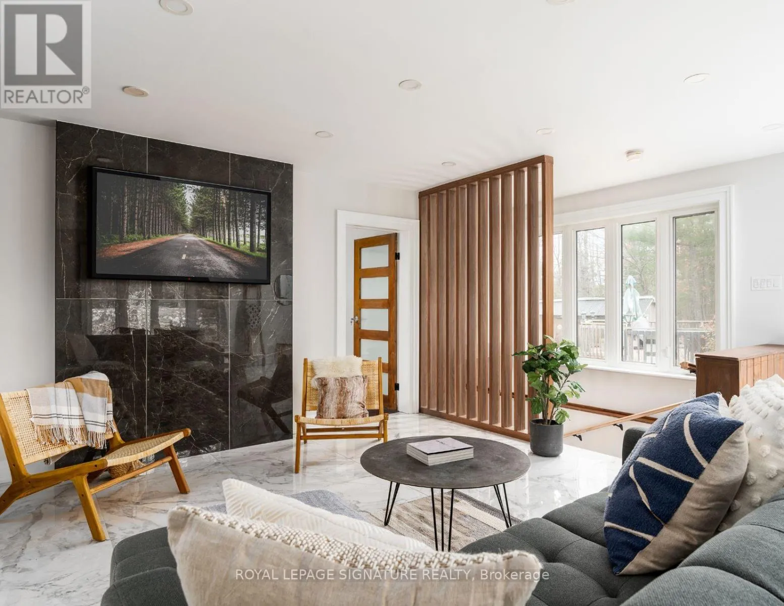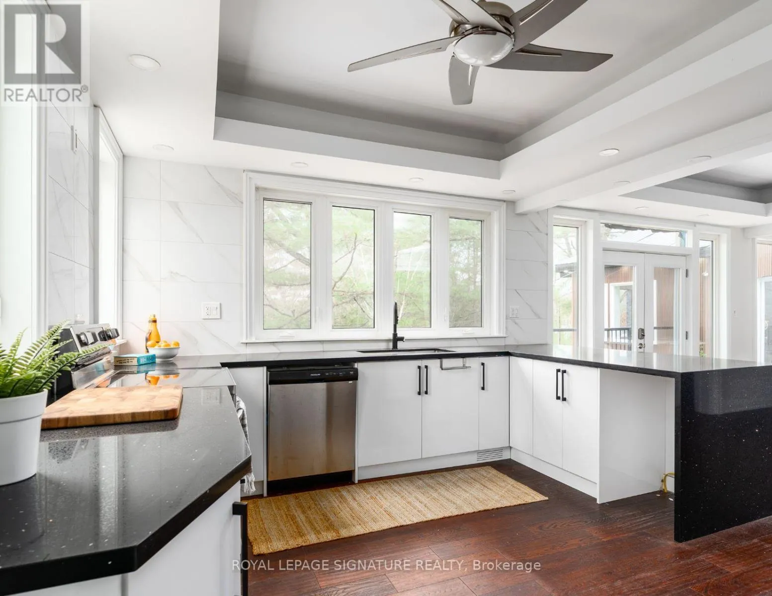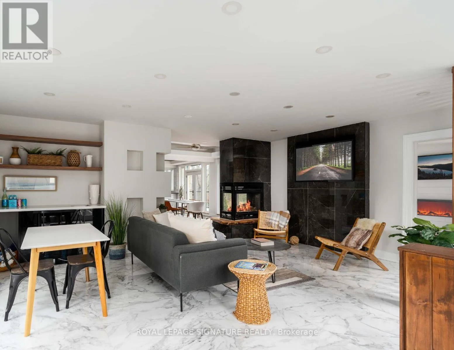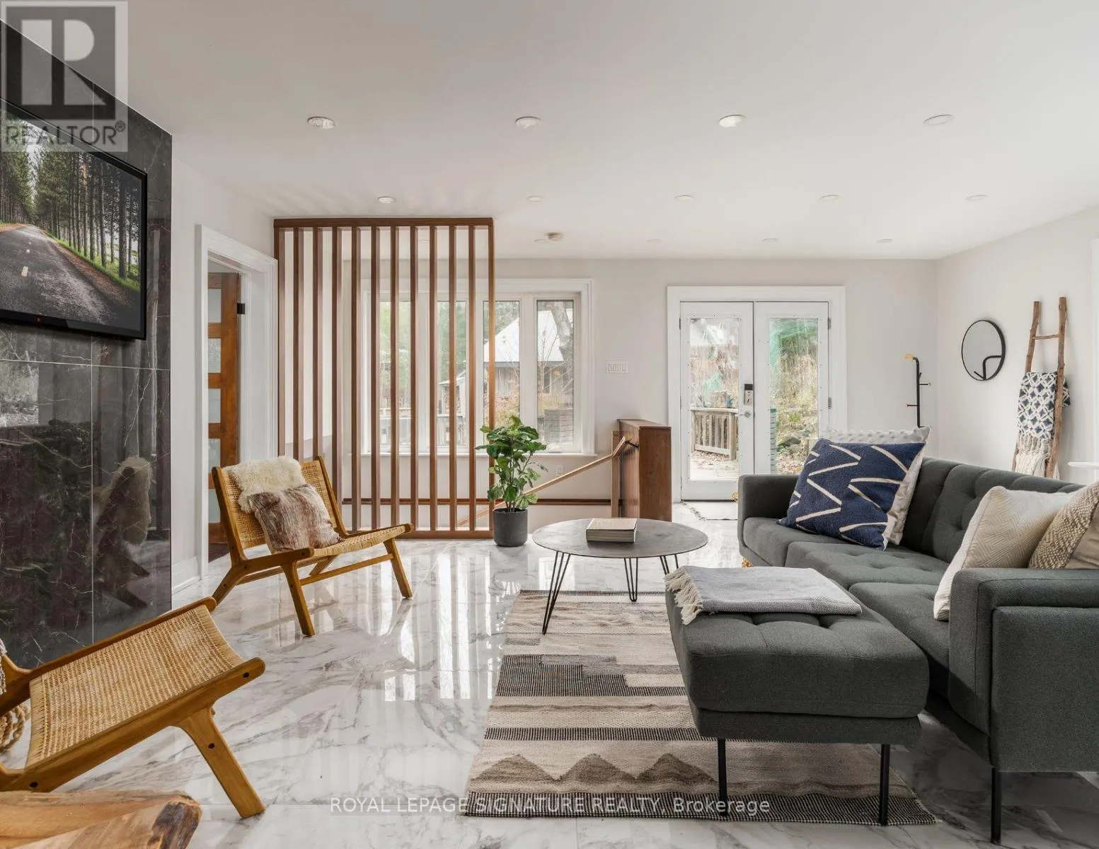 Long Lake Rd & Boundary Rd Escape to this newly renovated, open-concept 4 season home, nestled on a majestic 0.95-acre treed lot overlooking Langford Lake. This turn-key 4-season home perfectly blends modern luxury with rustic cottage charm. The heart of the home features a wrap around deck overlooking the lake and gorgeous landscape, a gourmet kitchen with built-in appliances, a breakfast bar, and a layout designed for entertaining. The main floor flows seamlessly into spacious living areas with high ceilings and large windows that frame peaceful forest views. The home offers a flexible layout with 4+1 bedrooms and 2 bathrooms, including a primary suite with an ensuite bath and direct walk-out access to the deck. Multi-tiered wrap-around decks expand your living space outdoors, offering the perfect setting for summer BBQs or morning coffee while overlooking the private grounds. Just steps away, enjoy your own municipally permitted private dock and sandy waterfront access on beautiful Langford Lake-perfect for swimming, boating, and fishing without the high waterfront taxes. The property also features a large detached 2-car garage/workshop, wood shed, and garden house for ample storage and loads of possibilities for a multi-generational compound in the heart of the North. Currently operating as a successful Airbnb with strong income potential, this is an ideal investment or family getaway. (id:27476)