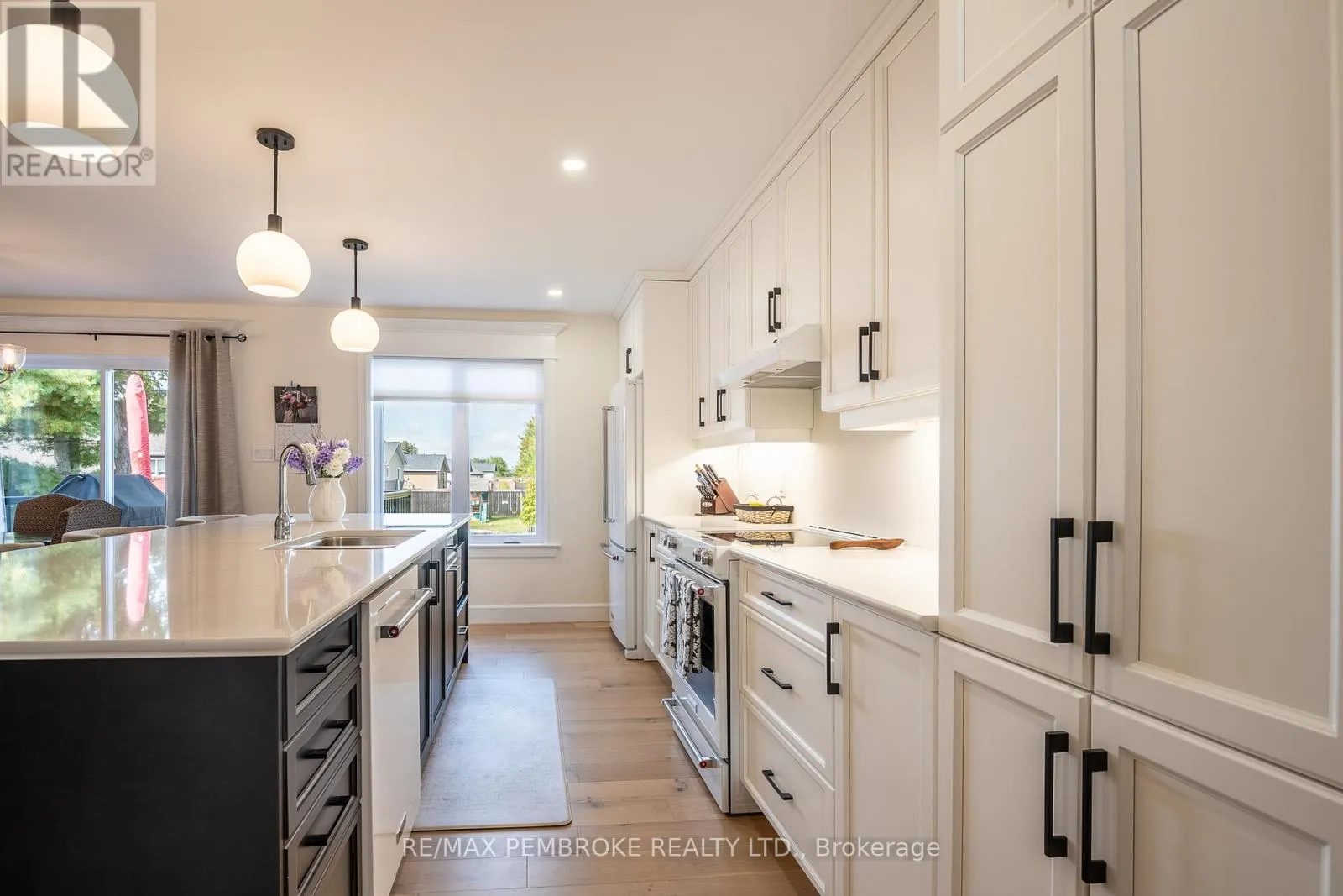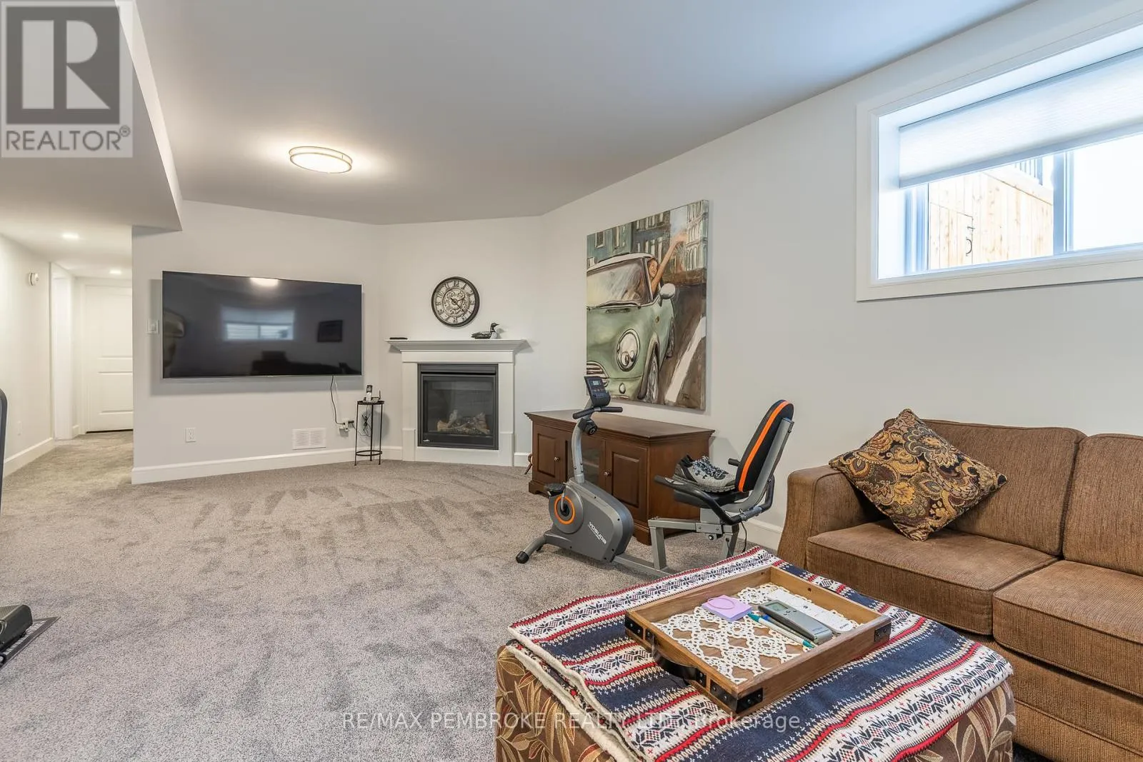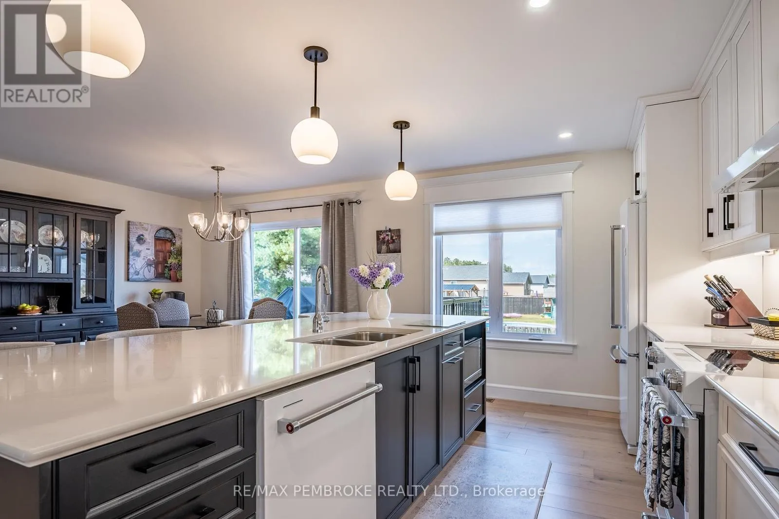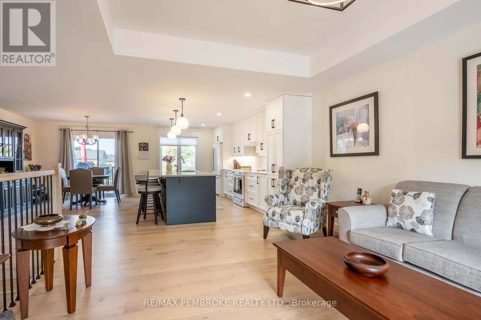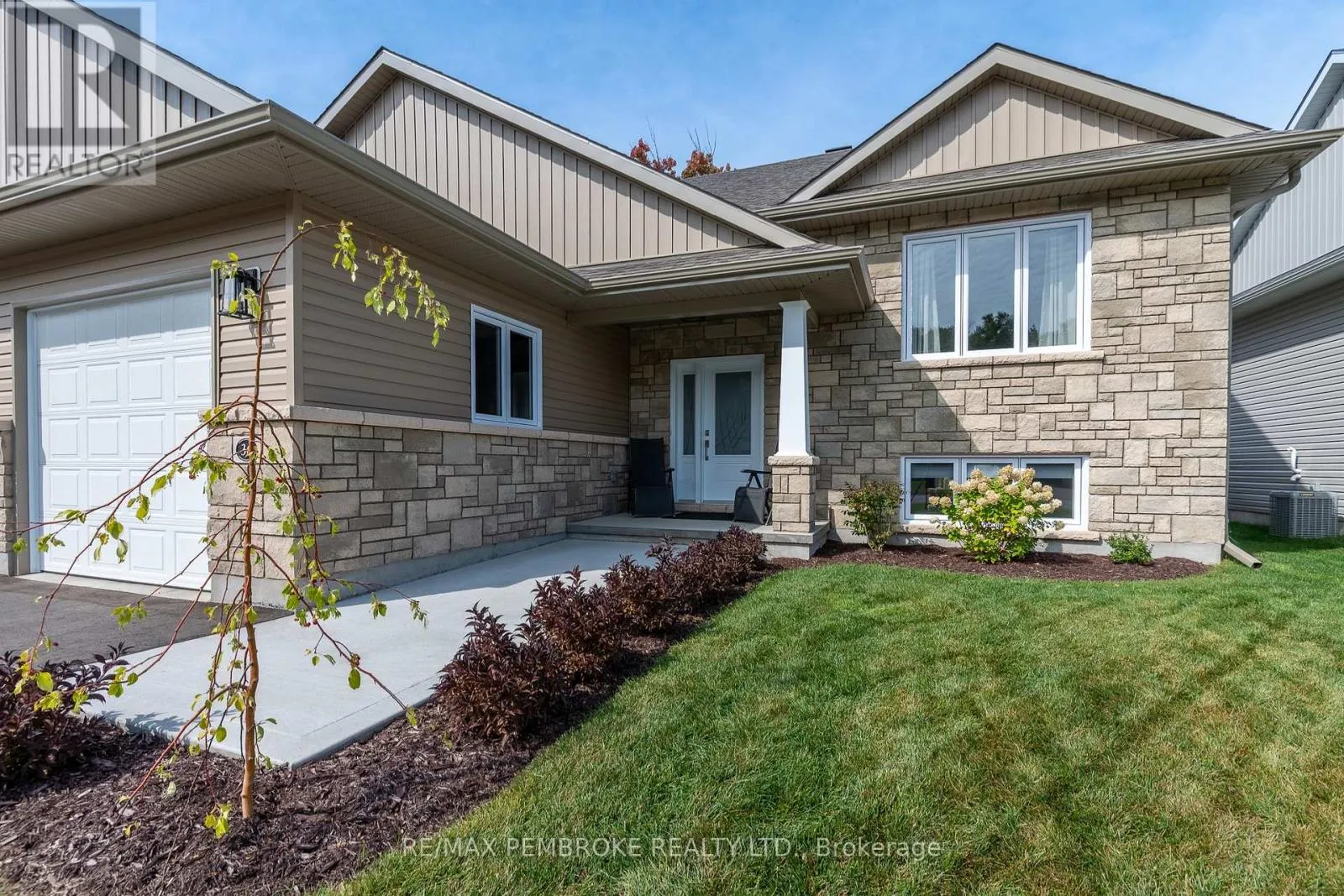 Cross Streets: Bedard & Zachary. ** Directions: Take HWY 17 or Petawawa Blvd to Murphy Rd, then Bedard onto Zachary. Welcome to this meticulously maintained, like-new home offering approximately 1,360 sq ft of beautifully designed living space plus a spacious 25 x 23 attached garage, perfect for extra storage, hobbies, and vehicles. Built in 2024, this property stands out with its unique layout, upscale finishes, and move-in ready condition. Step inside to discover an open-concept main level featuring warm french vanilla engineered hardwood flooring throughout the living spaces and bedrooms. The heart of the home is the chef-inspired kitchen with KitchenAid appliances, where ceiling-height cabinetry, quartz countertops, soft-close drawers, and an additional pantry tower offer both style and function. A large island with built-in trash/recycling drawer, additional storage, and seating for four makes this the perfect space for entertaining or casual meals.The spacious primary suite is a true retreat, complete with a 3-piece ensuite showcasing a custom tile shower with a built-in bench and niche, plus an exceptionally rare 14ft x 9ft connected dressing room/laundry room with French doors; an elegant and highly functional touch you will not find in most homes. Downstairs, plush carpeting leads you to a cozy family room with a natural gas fireplace, a third full bathroom, and two additional spacious bedrooms, one with frosted glass French doors which is currently used as a home office. You will also find both finished and unfinished storage areas to meet all your needs. Step outside to enjoy a fully fenced yard with a two-tier deck right off of the dining room, complete with natural gas hookup for a grill and an in-ground irrigation system to keep your lawn lush.This home combines high-end finishes with thoughtful functionality, offering a lifestyle of comfort, convenience, and quiet luxury. This is your chance to own a standout property in a desirable neighbourhood. 24 hour irrevocable required on any written offer. (id:27476)
