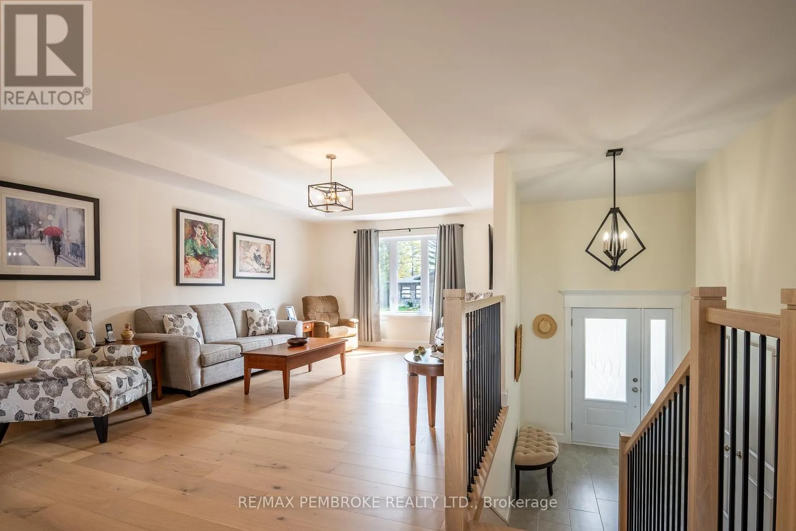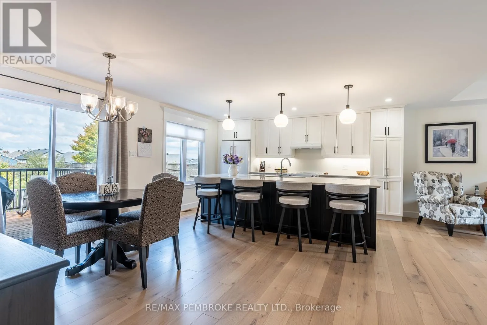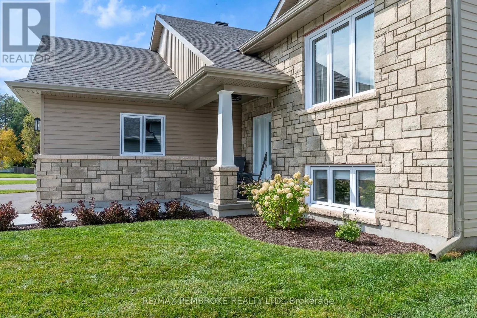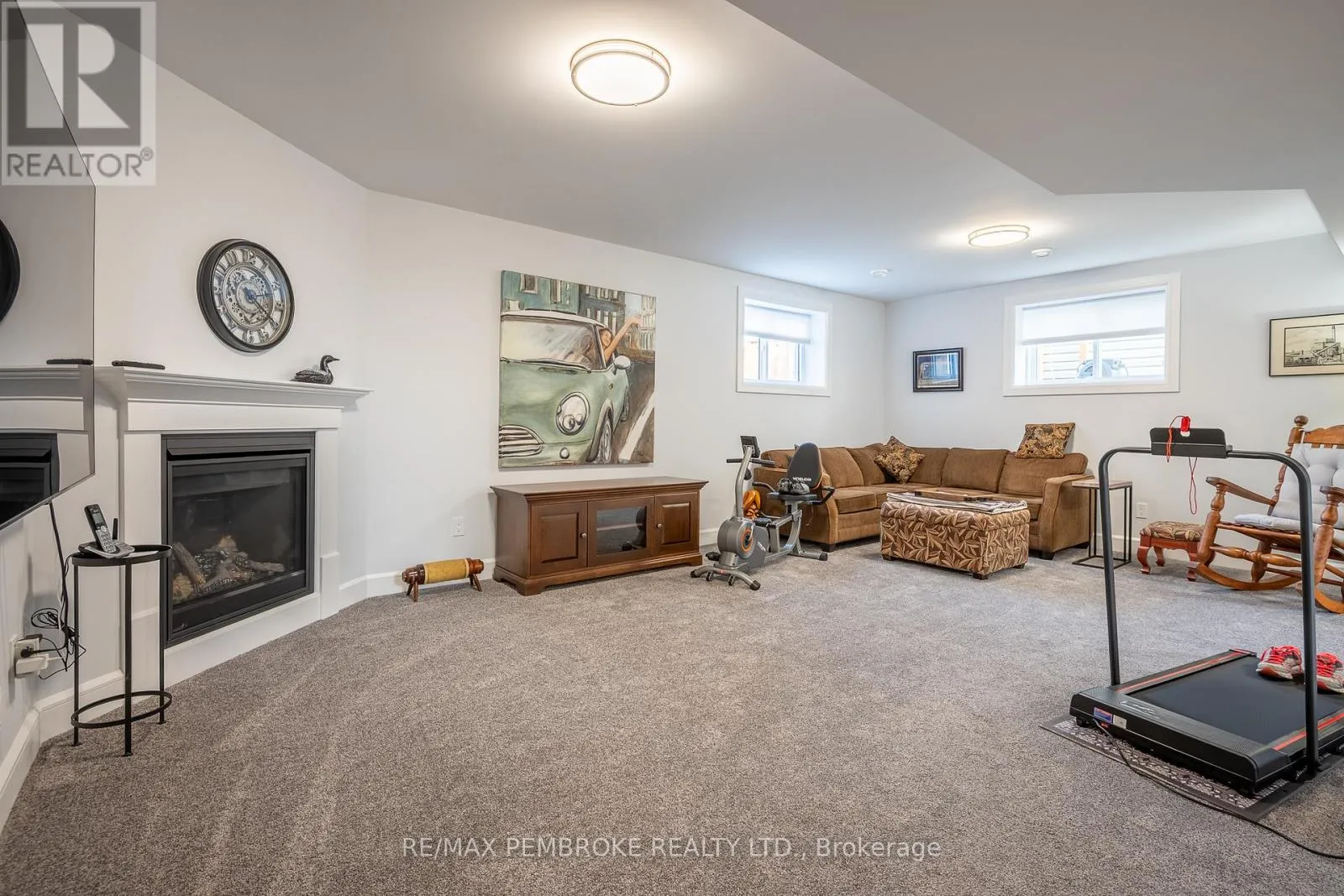Cross Streets: Bedard & Zachary. ** Directions: Take HWY 17 or Petawawa Blvd to Murphy Rd, then Bedard onto Zachary. Welcome to this meticulously maintained, like-new home offering approximately 1,360 sq ft of beautifully designed living space plus a spacious 25 x 23 attached garage, perfect for extra storage, hobbies, and vehicles. Built in 2024, this property stands out with its unique layout, upscale finishes, and move-in ready condition. Step inside to discover an open-concept main level featuring warm french vanilla engineered hardwood flooring throughout the living spaces and bedrooms. The heart of the home is the chef-inspired kitchen with KitchenAid appliances, where ceiling-height cabinetry, quartz countertops, soft-close drawers, and an additional pantry tower offer both style and function. A large island with built-in trash/recycling drawer, additional storage, and seating for four makes this the perfect space for entertaining or casual meals.The spacious primary suite is a true retreat, complete with a 3-piece ensuite showcasing a custom tile shower with a built-in bench and niche, plus an exceptionally rare 14ft x 9ft connected dressing room/laundry room with French doors; an elegant and highly functional touch you will not find in most homes. Downstairs, plush carpeting leads you to a cozy family room with a natural gas fireplace, a third full bathroom, and two additional spacious bedrooms, one with frosted glass French doors which is currently used as a home office. You will also find both finished and unfinished storage areas to meet all your needs. Step outside to enjoy a fully fenced yard with a two-tier deck right off of the dining room, complete with natural gas hookup for a grill and an in-ground irrigation system to keep your lawn lush.This home combines high-end finishes with thoughtful functionality, offering a lifestyle of comfort, convenience, and quiet luxury. This is your chance to own a standout property in a desirable neighbourhood. 24 hour irrevocable required on any written offer. (id:27476)