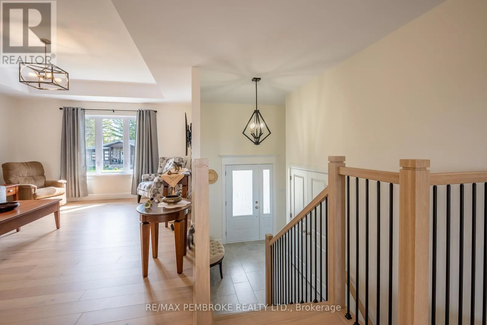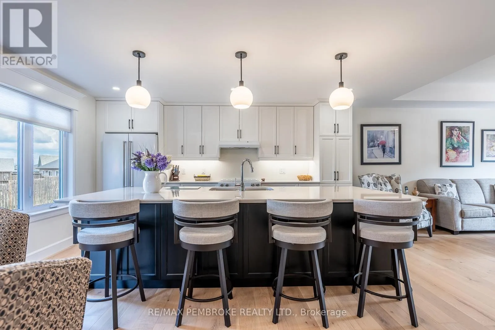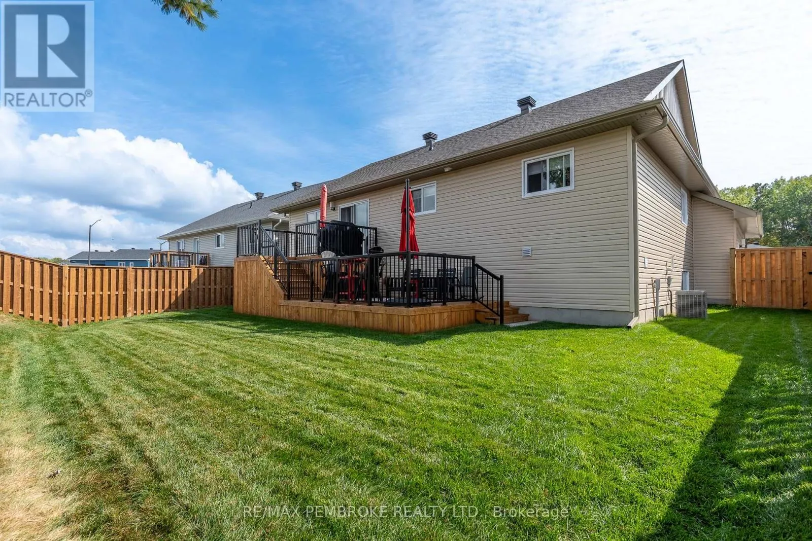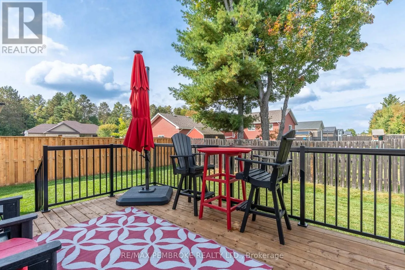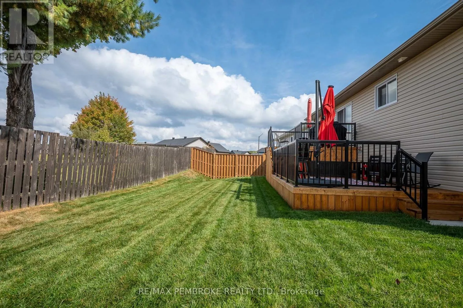 Cross Streets: Bedard & Zachary. ** Directions: Take HWY 17 or Petawawa Blvd to Murphy Rd, then Bedard onto Zachary. Welcome to this meticulously maintained, like-new home offering approximately 1,360 sq ft of beautifully designed living space plus a spacious 25 x 23 attached garage, perfect for extra storage, hobbies, and vehicles. Built in 2024, this property stands out with its unique layout, upscale finishes, and move-in ready condition. Step inside to discover an open-concept main level featuring warm french vanilla engineered hardwood flooring throughout the living spaces and bedrooms. The heart of the home is the chef-inspired kitchen with KitchenAid appliances, where ceiling-height cabinetry, quartz countertops, soft-close drawers, and an additional pantry tower offer both style and function. A large island with built-in trash/recycling drawer, additional storage, and seating for four makes this the perfect space for entertaining or casual meals.The spacious primary suite is a true retreat, complete with a 3-piece ensuite showcasing a custom tile shower with a built-in bench and niche, plus an exceptionally rare 14ft x 9ft connected dressing room/laundry room with French doors; an elegant and highly functional touch you will not find in most homes. Downstairs, plush carpeting leads you to a cozy family room with a natural gas fireplace, a third full bathroom, and two additional spacious bedrooms, one with frosted glass French doors which is currently used as a home office. You will also find both finished and unfinished storage areas to meet all your needs. Step outside to enjoy a fully fenced yard with a two-tier deck right off of the dining room, complete with natural gas hookup for a grill and an in-ground irrigation system to keep your lawn lush.This home combines high-end finishes with thoughtful functionality, offering a lifestyle of comfort, convenience, and quiet luxury. This is your chance to own a standout property in a desirable neighbourhood. 24 hour irrevocable required on any written offer. (id:27476)