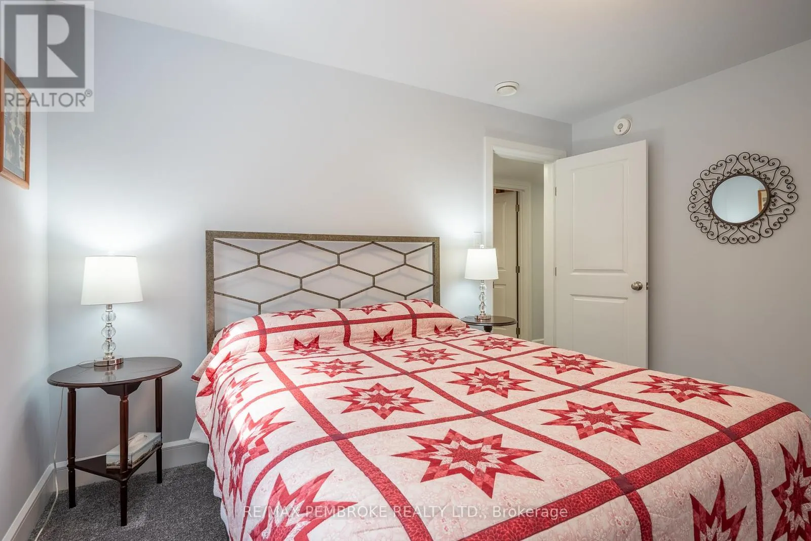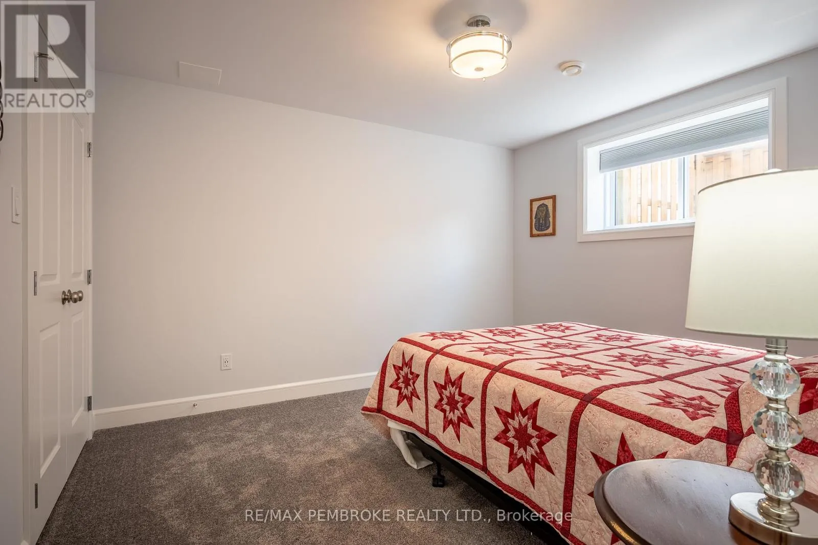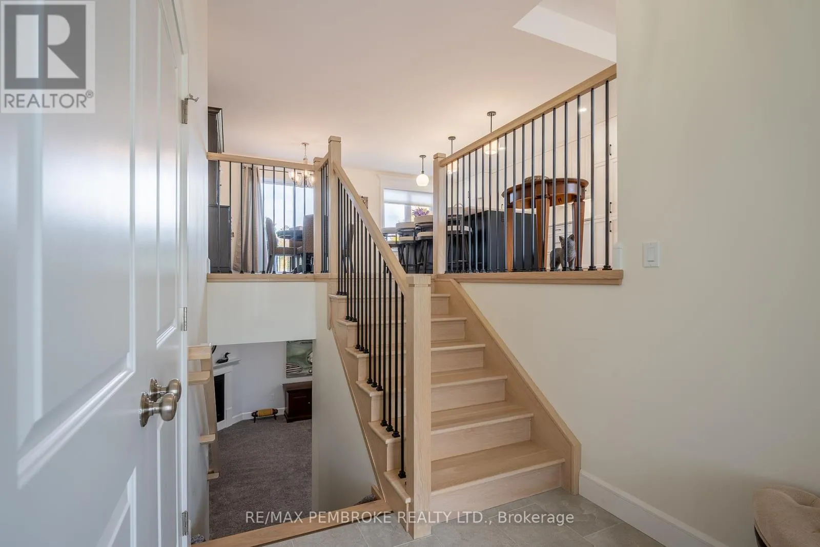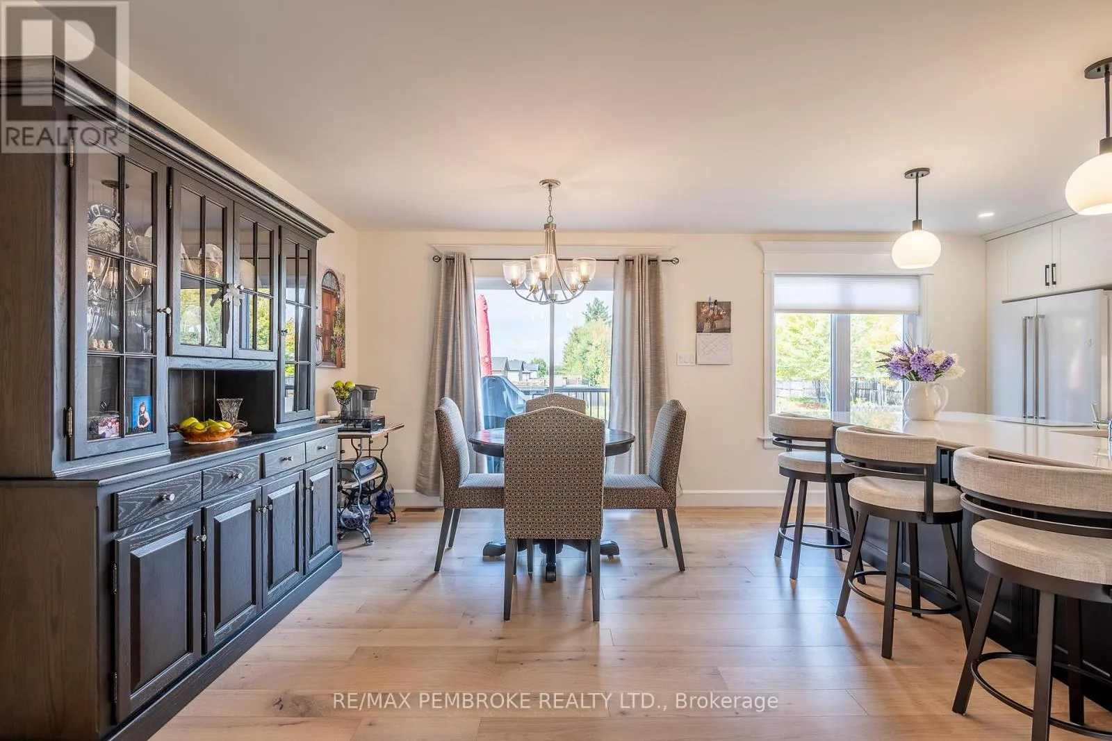 Cross Streets: Bedard & Zachary. ** Directions: Take HWY 17 or Petawawa Blvd to Murphy Rd, then Bedard onto Zachary. Welcome to this meticulously maintained, like-new home offering approximately 1,360 sq ft of beautifully designed living space plus a spacious 25 x 23 attached garage, perfect for extra storage, hobbies, and vehicles. Built in 2024, this property stands out with its unique layout, upscale finishes, and move-in ready condition. Step inside to discover an open-concept main level featuring warm french vanilla engineered hardwood flooring throughout the living spaces and bedrooms. The heart of the home is the chef-inspired kitchen with KitchenAid appliances, where ceiling-height cabinetry, quartz countertops, soft-close drawers, and an additional pantry tower offer both style and function. A large island with built-in trash/recycling drawer, additional storage, and seating for four makes this the perfect space for entertaining or casual meals.The spacious primary suite is a true retreat, complete with a 3-piece ensuite showcasing a custom tile shower with a built-in bench and niche, plus an exceptionally rare 14ft x 9ft connected dressing room/laundry room with French doors; an elegant and highly functional touch you will not find in most homes. Downstairs, plush carpeting leads you to a cozy family room with a natural gas fireplace, a third full bathroom, and two additional spacious bedrooms, one with frosted glass French doors which is currently used as a home office. You will also find both finished and unfinished storage areas to meet all your needs. Step outside to enjoy a fully fenced yard with a two-tier deck right off of the dining room, complete with natural gas hookup for a grill and an in-ground irrigation system to keep your lawn lush.This home combines high-end finishes with thoughtful functionality, offering a lifestyle of comfort, convenience, and quiet luxury. This is your chance to own a standout property in a desirable neighbourhood. 24 hour irrevocable required on any written offer. (id:27476)