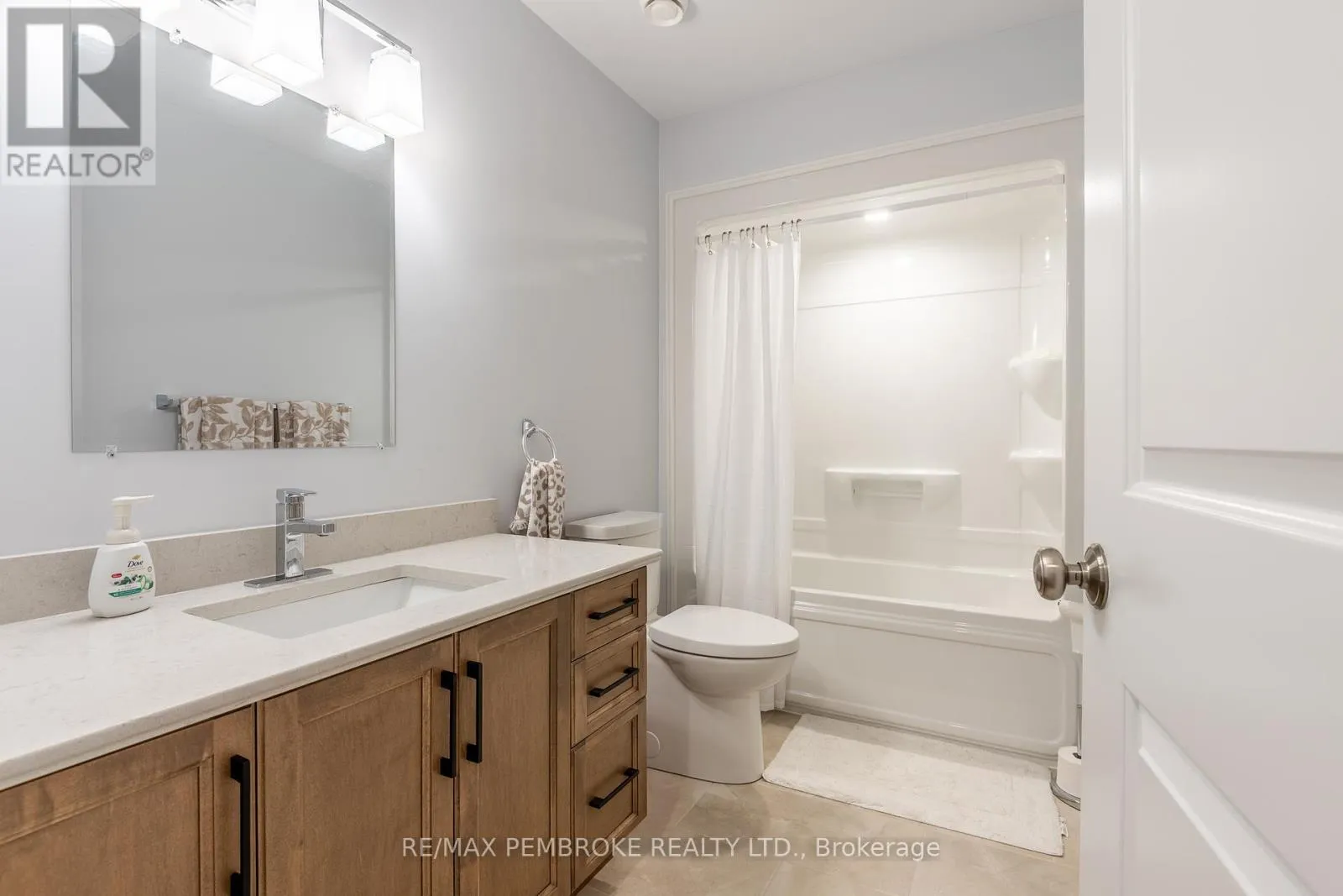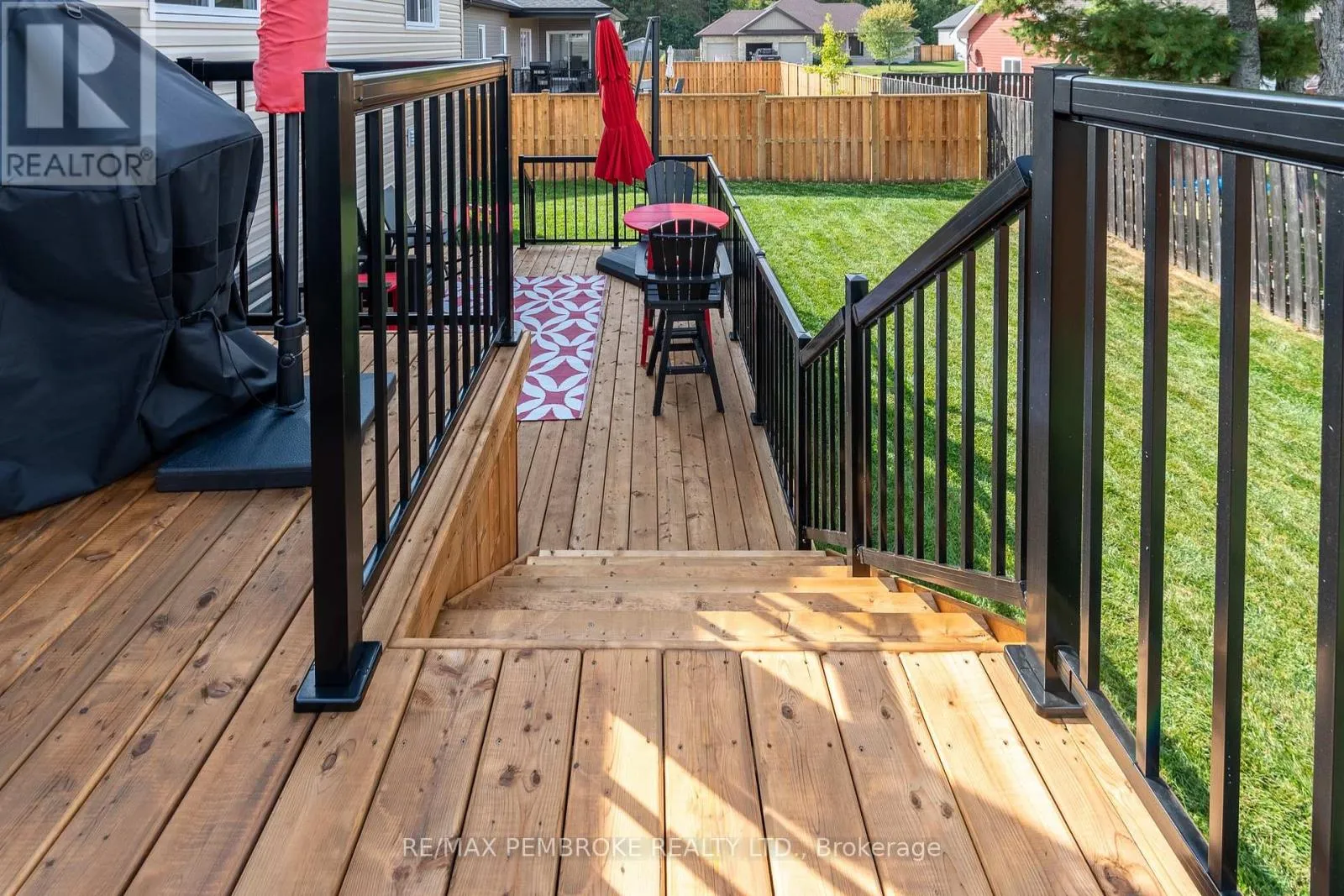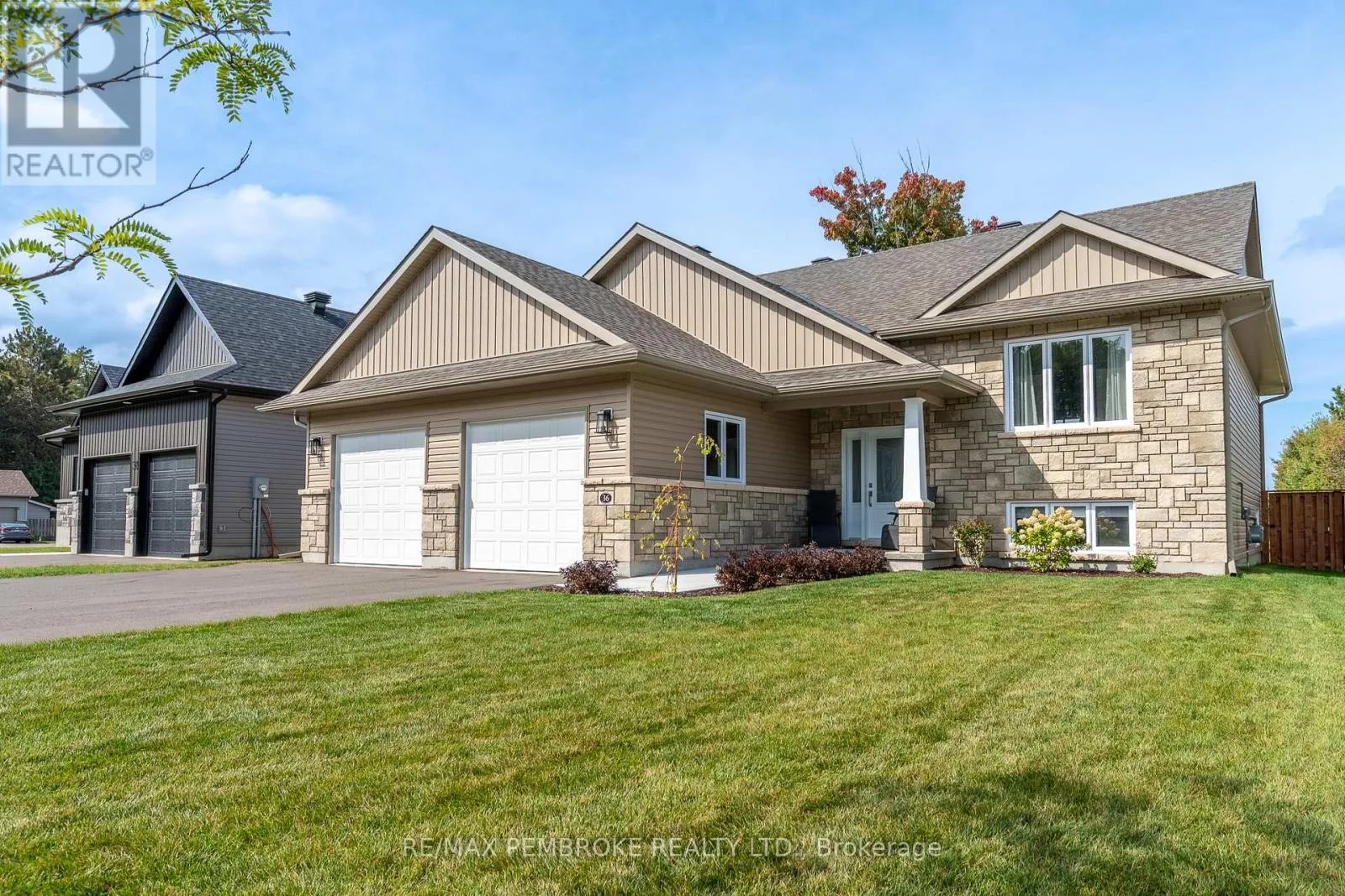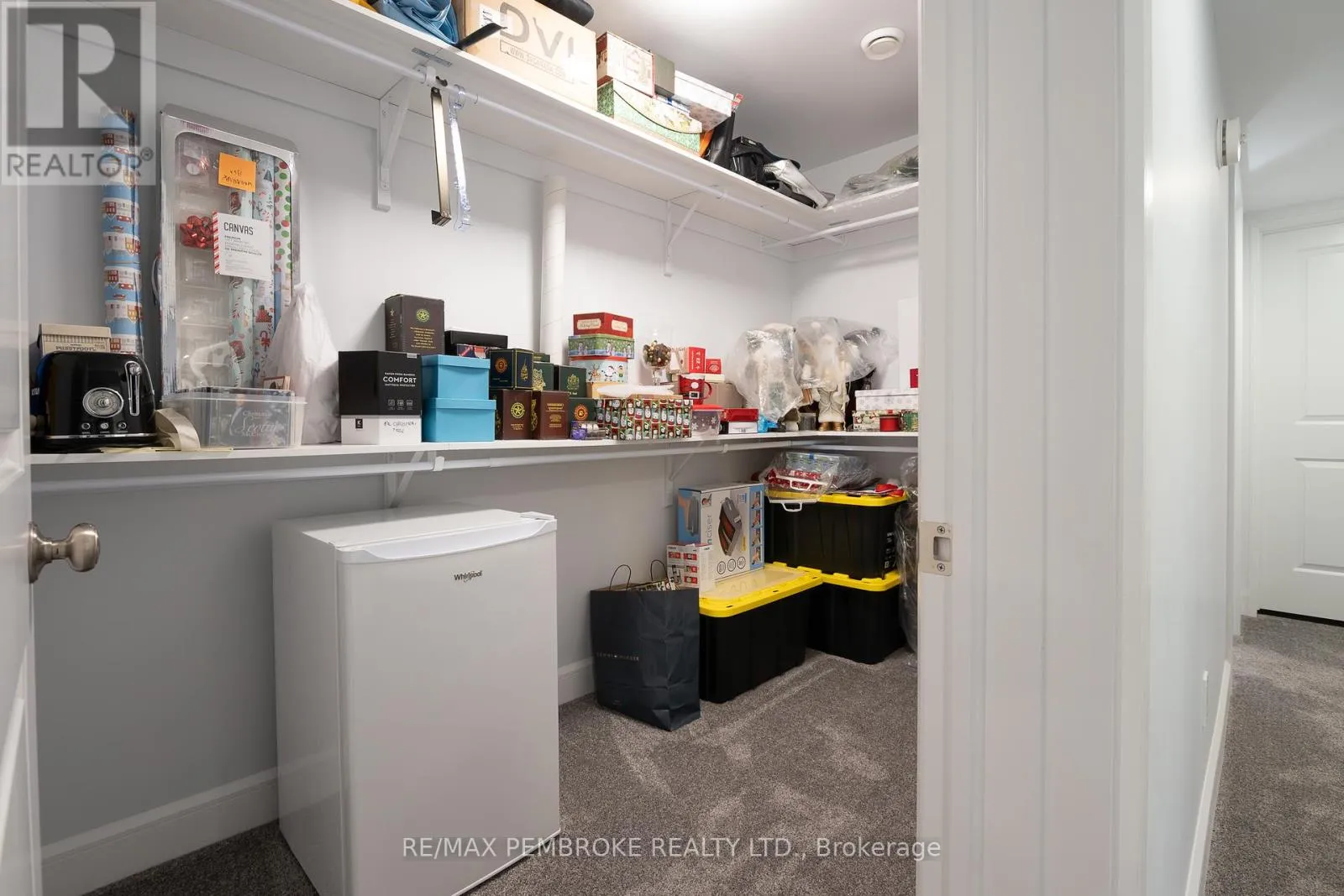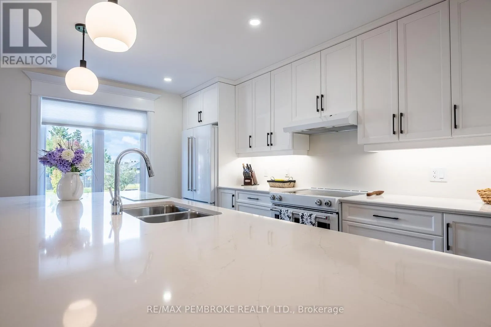 Cross Streets: Bedard & Zachary. ** Directions: Take HWY 17 or Petawawa Blvd to Murphy Rd, then Bedard onto Zachary. Welcome to this meticulously maintained, like-new home offering approximately 1,360 sq ft of beautifully designed living space plus a spacious 25 x 23 attached garage, perfect for extra storage, hobbies, and vehicles. Built in 2024, this property stands out with its unique layout, upscale finishes, and move-in ready condition. Step inside to discover an open-concept main level featuring warm french vanilla engineered hardwood flooring throughout the living spaces and bedrooms. The heart of the home is the chef-inspired kitchen with KitchenAid appliances, where ceiling-height cabinetry, quartz countertops, soft-close drawers, and an additional pantry tower offer both style and function. A large island with built-in trash/recycling drawer, additional storage, and seating for four makes this the perfect space for entertaining or casual meals.The spacious primary suite is a true retreat, complete with a 3-piece ensuite showcasing a custom tile shower with a built-in bench and niche, plus an exceptionally rare 14ft x 9ft connected dressing room/laundry room with French doors; an elegant and highly functional touch you will not find in most homes. Downstairs, plush carpeting leads you to a cozy family room with a natural gas fireplace, a third full bathroom, and two additional spacious bedrooms, one with frosted glass French doors which is currently used as a home office. You will also find both finished and unfinished storage areas to meet all your needs. Step outside to enjoy a fully fenced yard with a two-tier deck right off of the dining room, complete with natural gas hookup for a grill and an in-ground irrigation system to keep your lawn lush.This home combines high-end finishes with thoughtful functionality, offering a lifestyle of comfort, convenience, and quiet luxury. This is your chance to own a standout property in a desirable neighbourhood. 24 hour irrevocable required on any written offer. (id:27476)